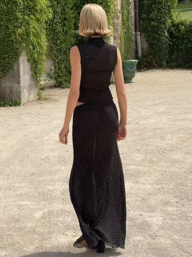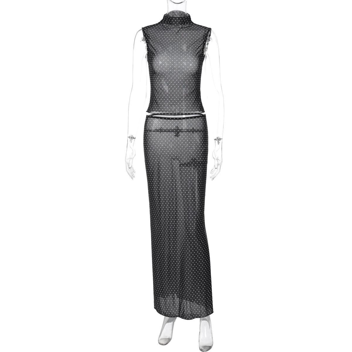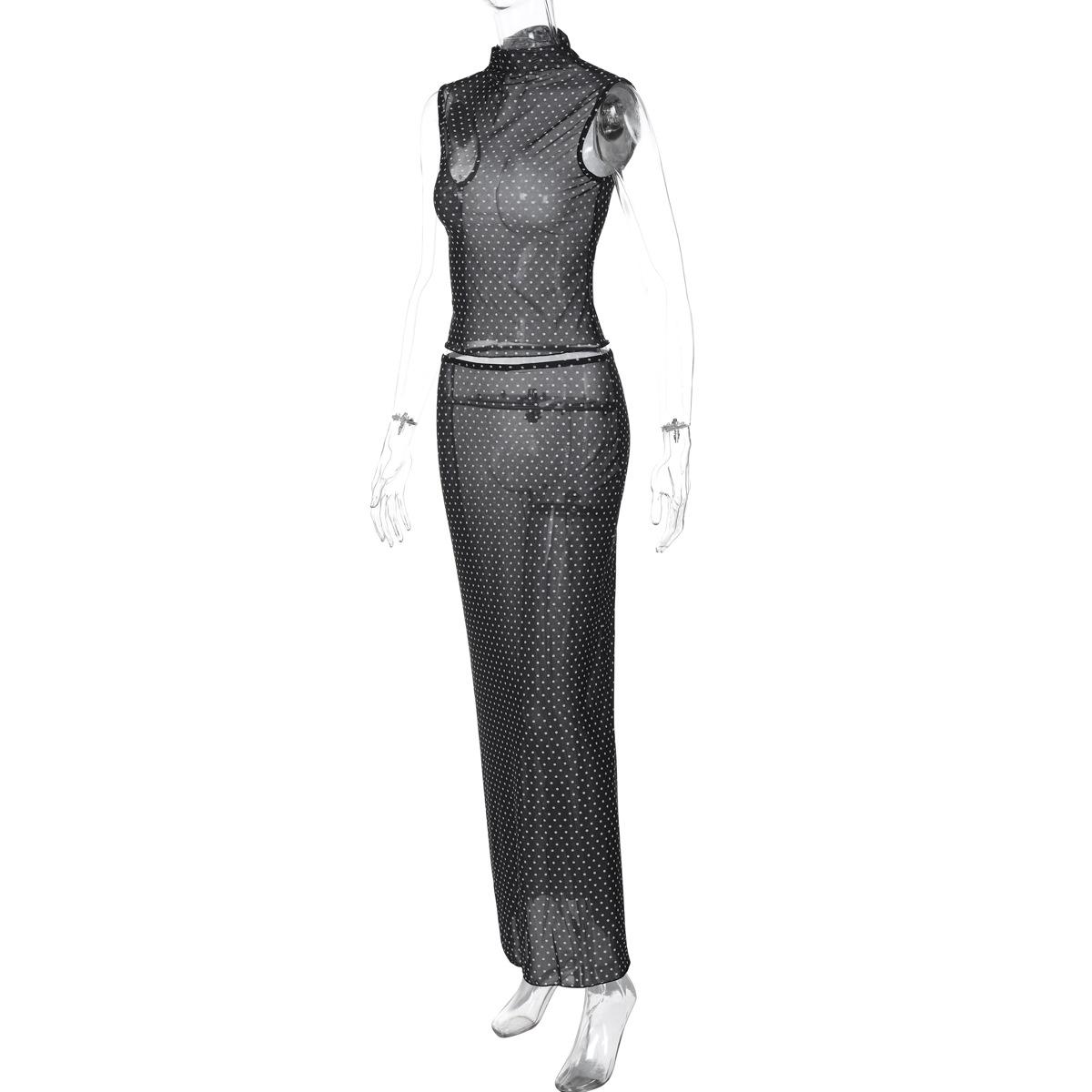 Ropa de mujer europea y americana 2025 verano nuevo deseo puro gama alta malla empalmada halter cuello cintura temperamento moderno traje falda larga