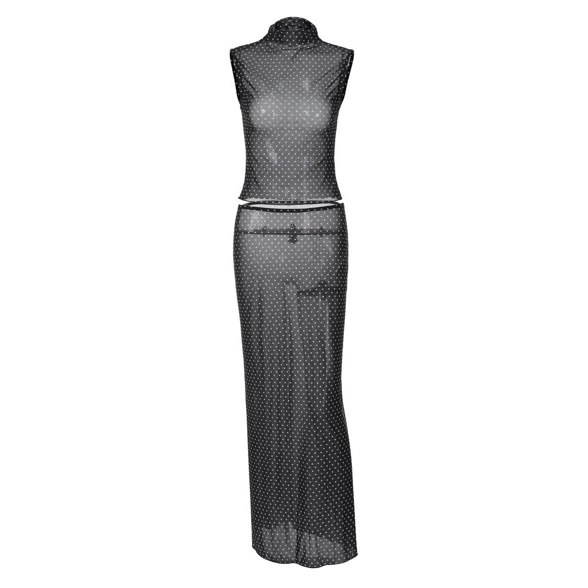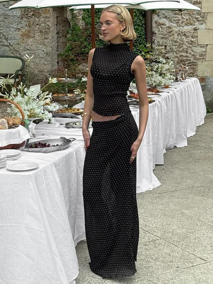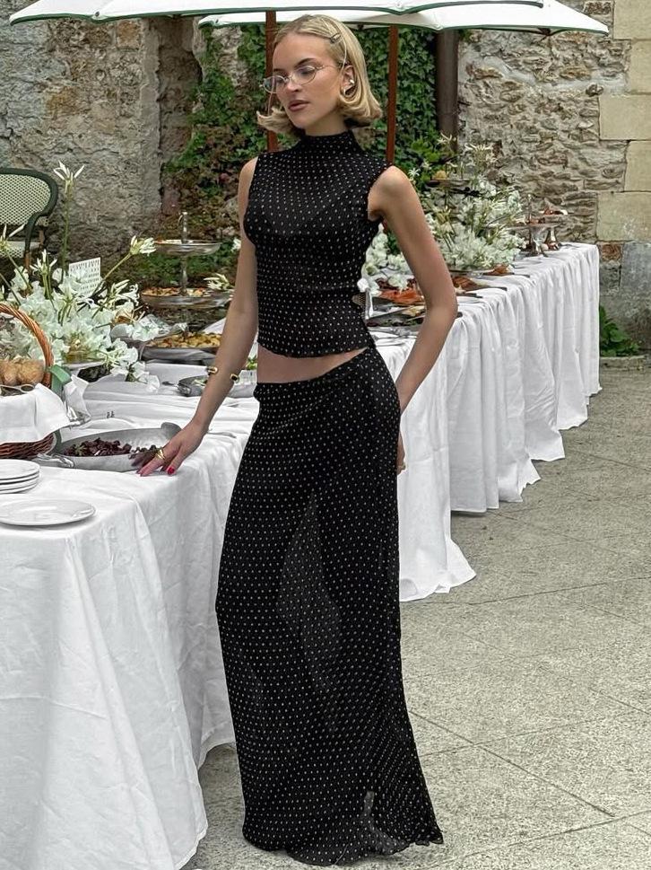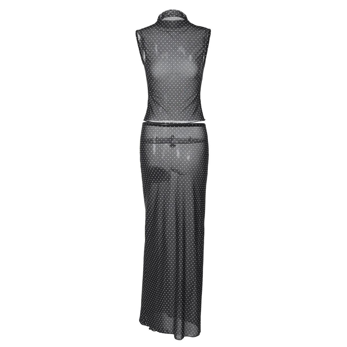 Ropa de mujer europea y americana 2025 verano nuevo deseo puro gama alta malla empalmada halter cuello cintura temperamento moderno traje falda larga