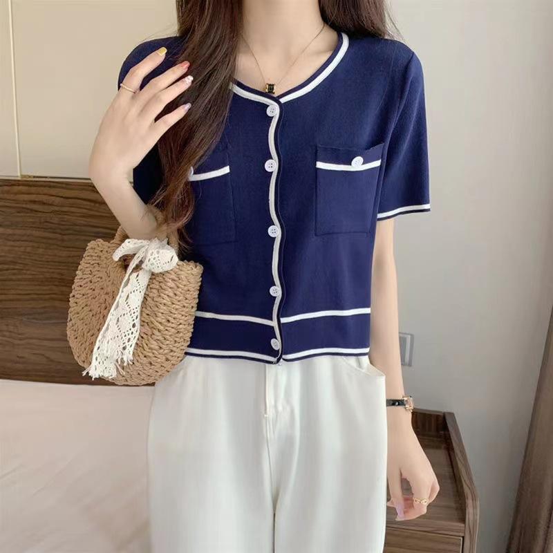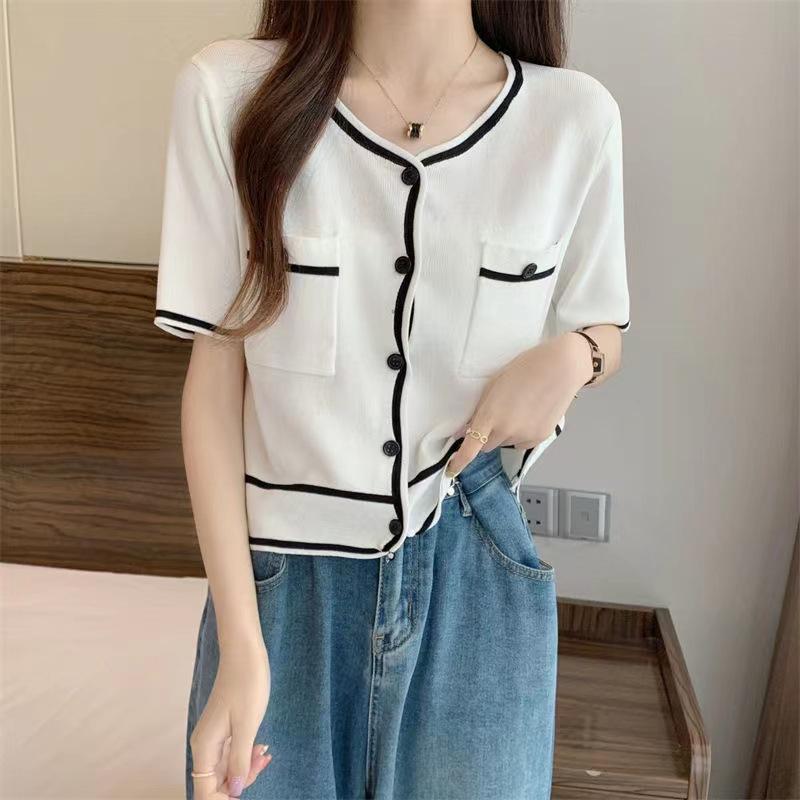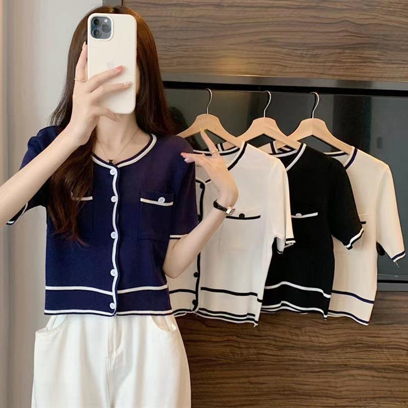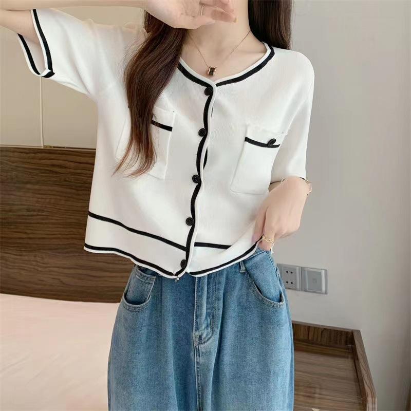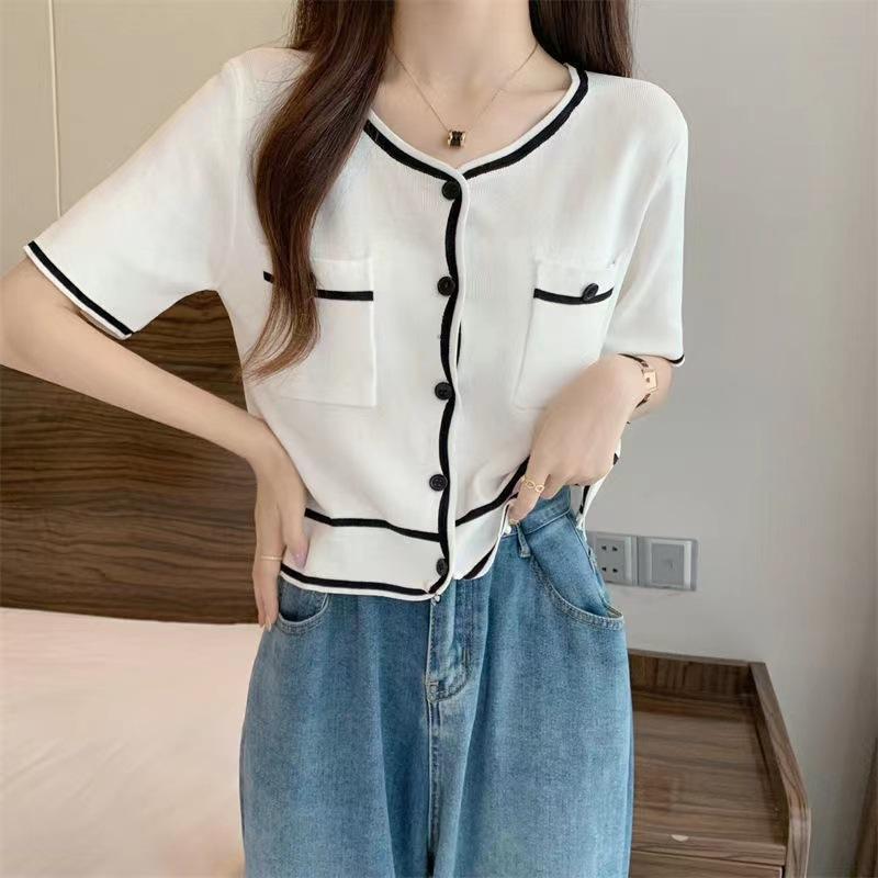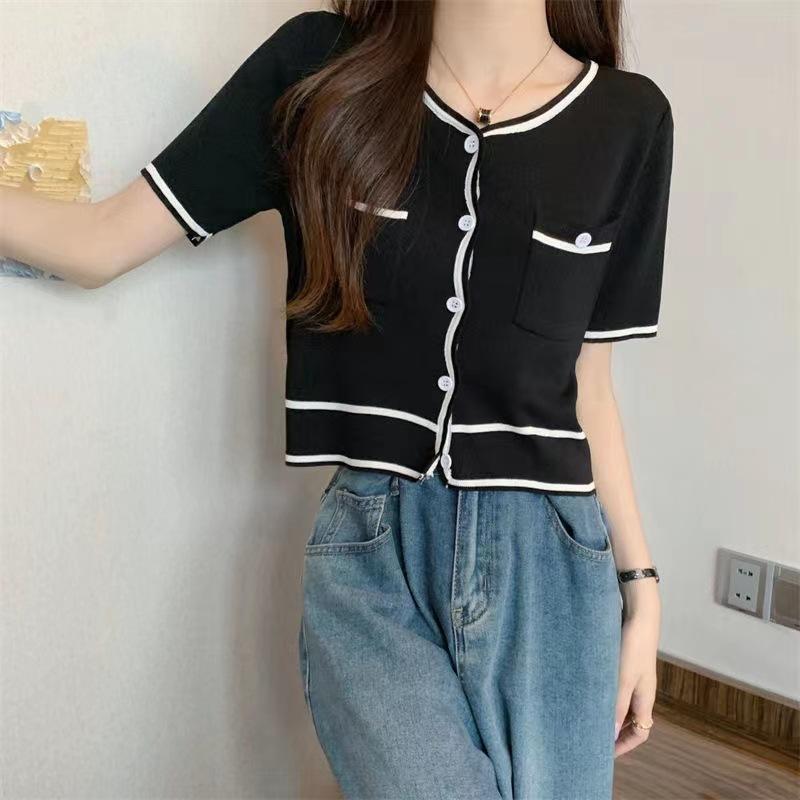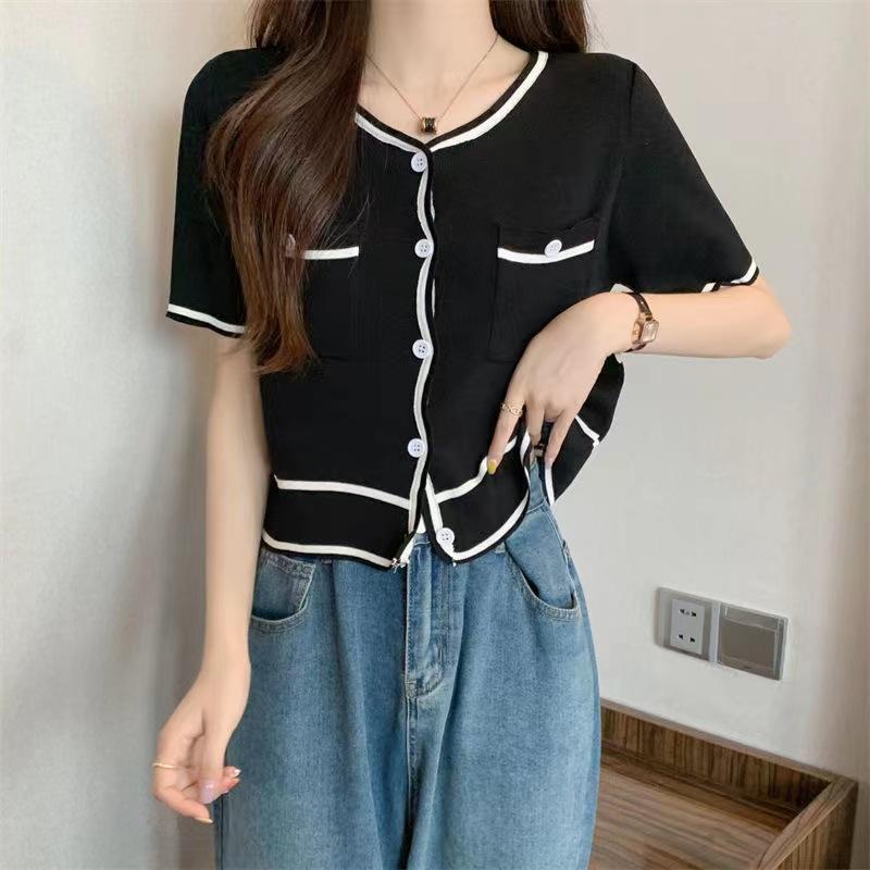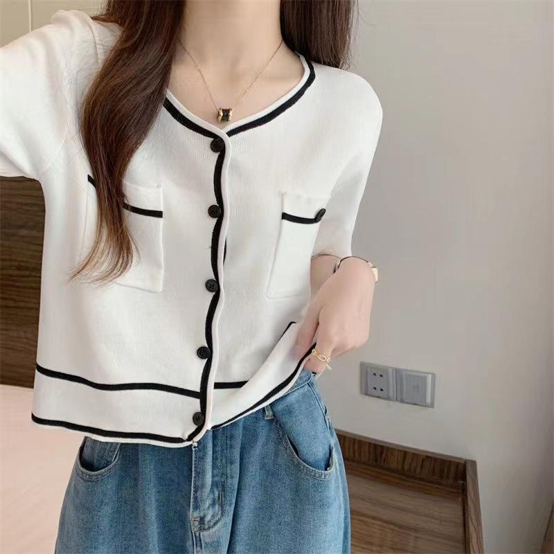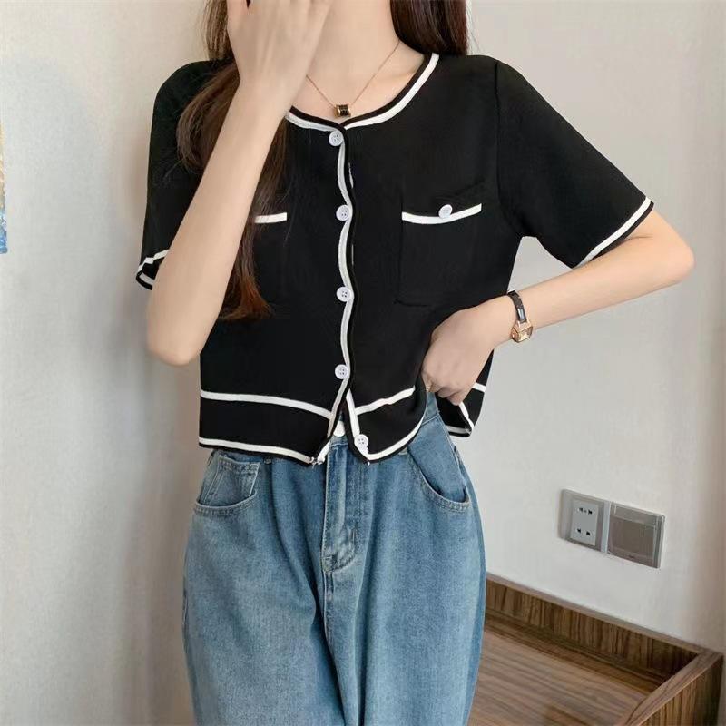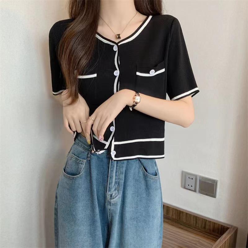 Cárdigan de Punto de Manga Corta Estilo Chanel para Mujer Verano Fino Diseño de Contraste Sentido Nicho Ajustado Corto Top Ajustado Corto para Mujer