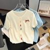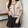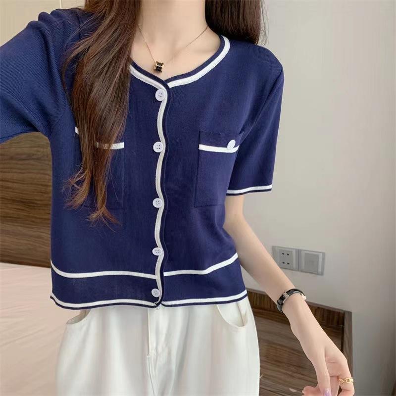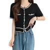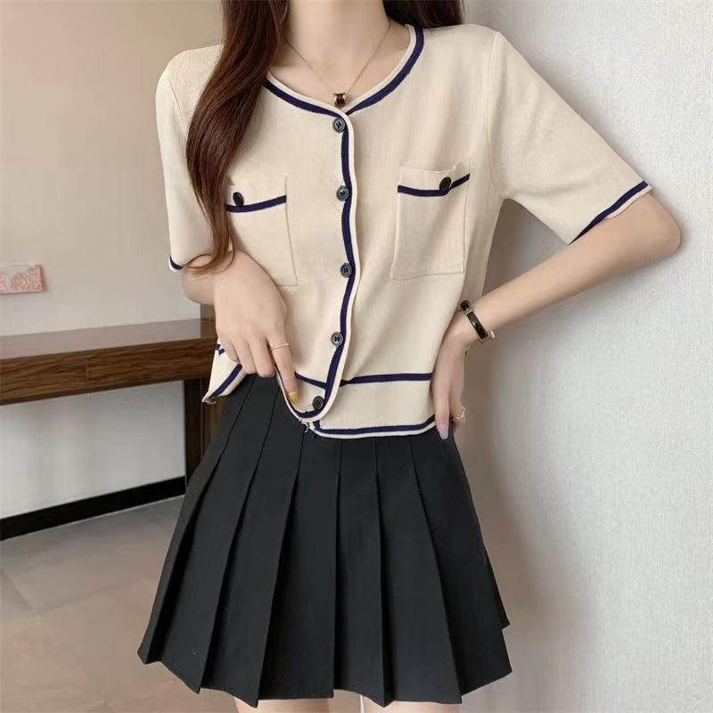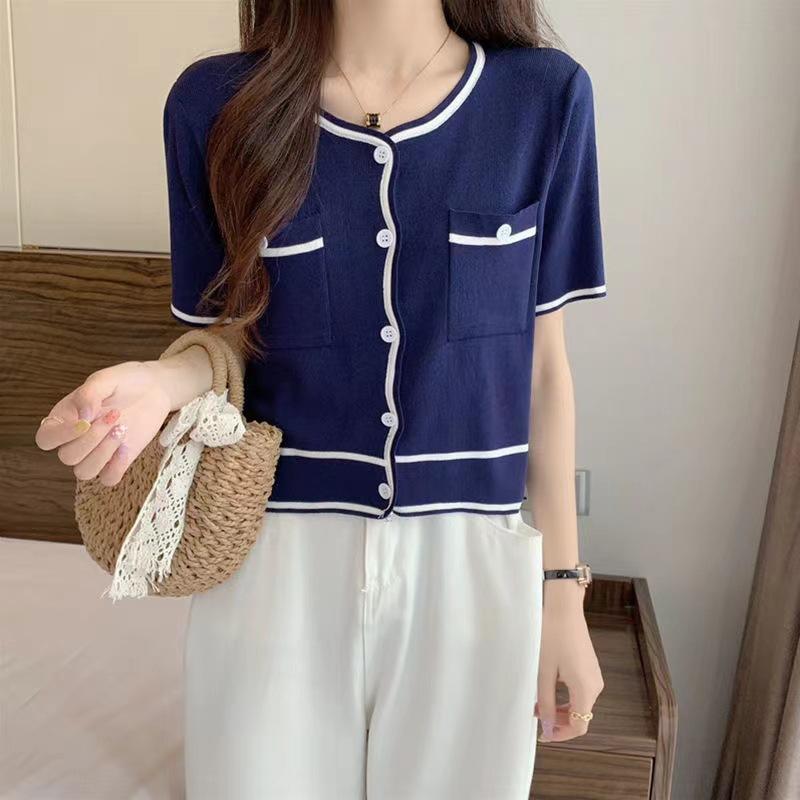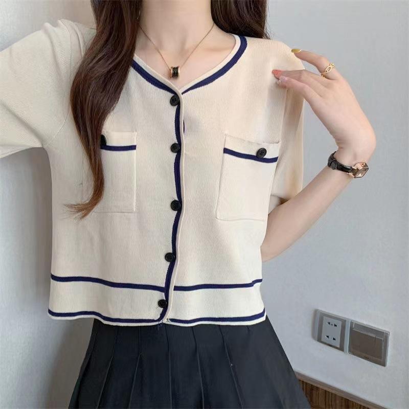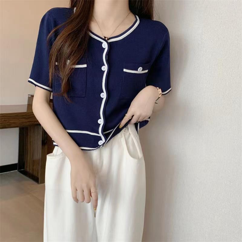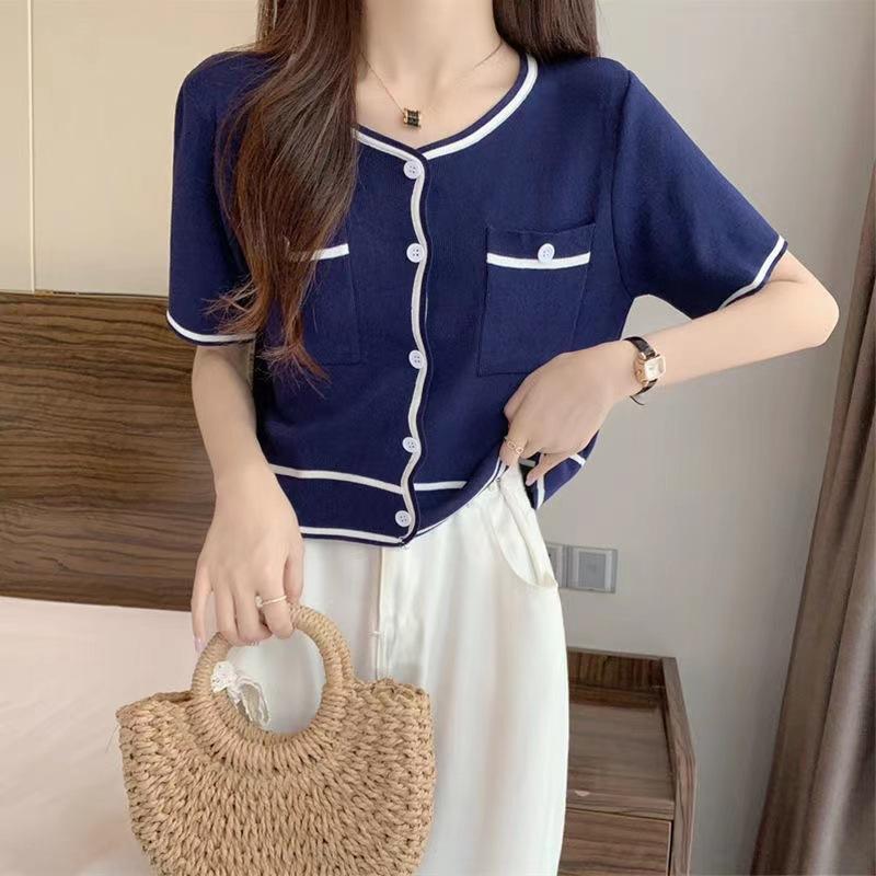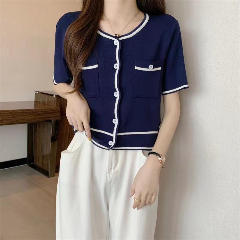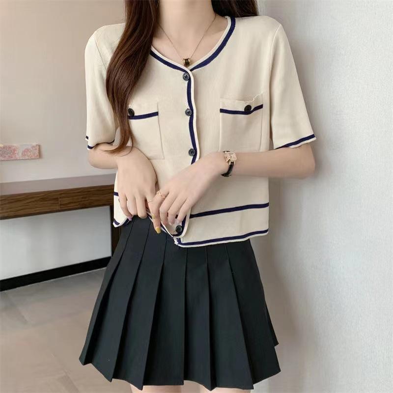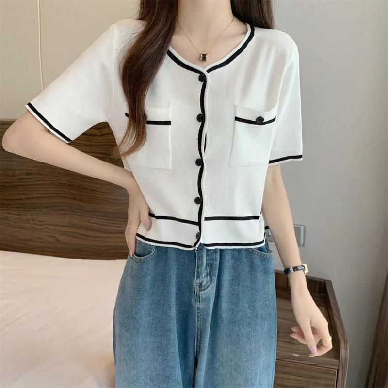 Cárdigan de Punto de Manga Corta Estilo Chanel para Mujer Verano Fino Diseño de Contraste Sentido Nicho Ajustado Corto Top Ajustado Corto para Mujer