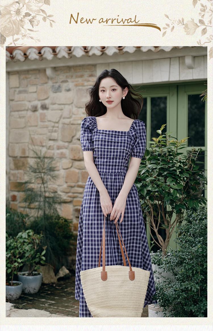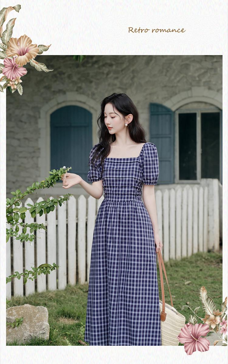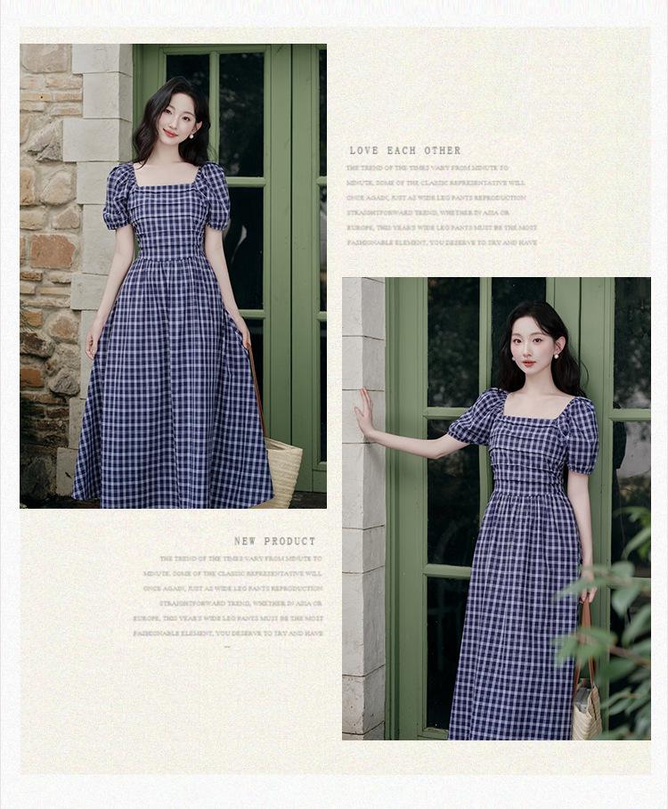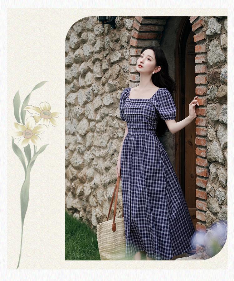 Foto Real de Vestido de Cuadros con Cuello Cuadrado Francés Listo para Usar para Mujer 2025 Verano Nuevo Falda de Manga Abullonada