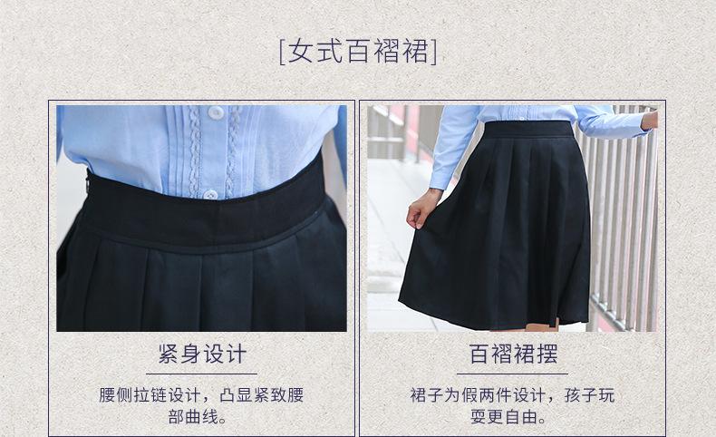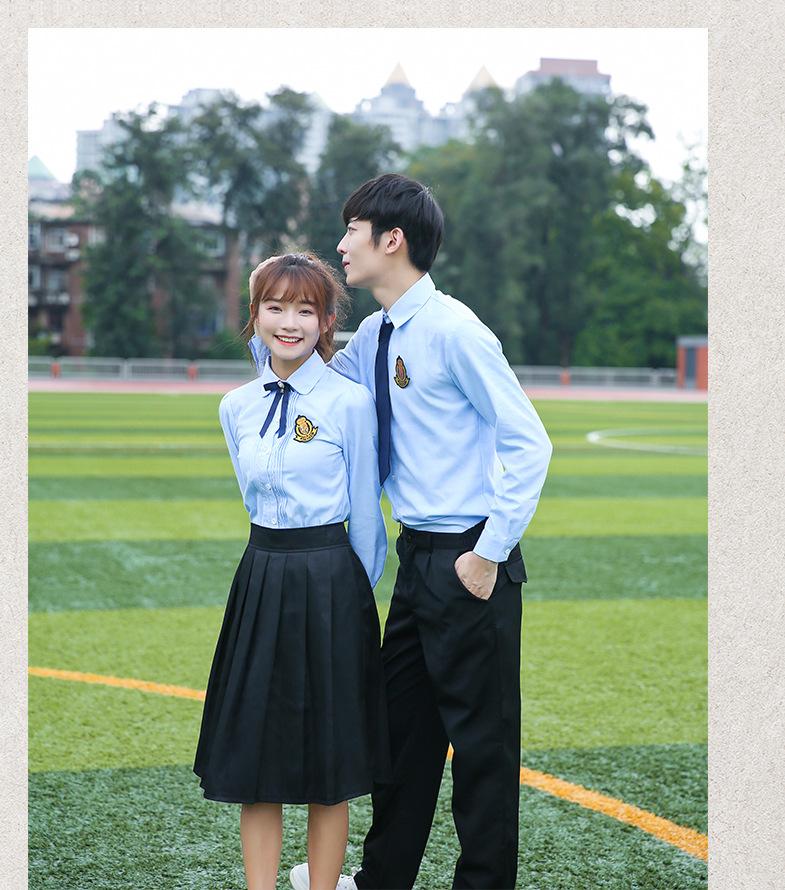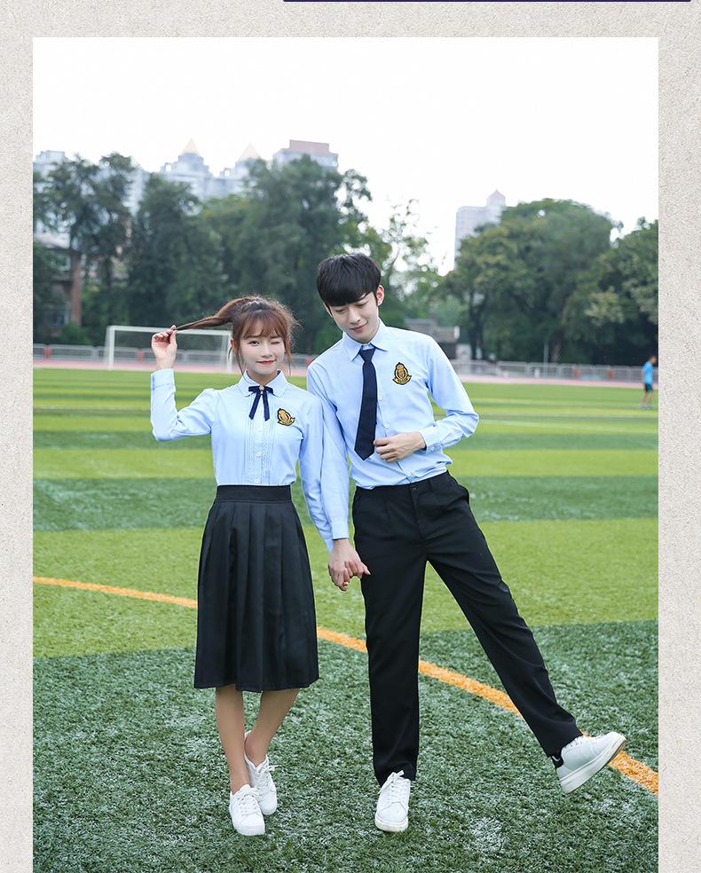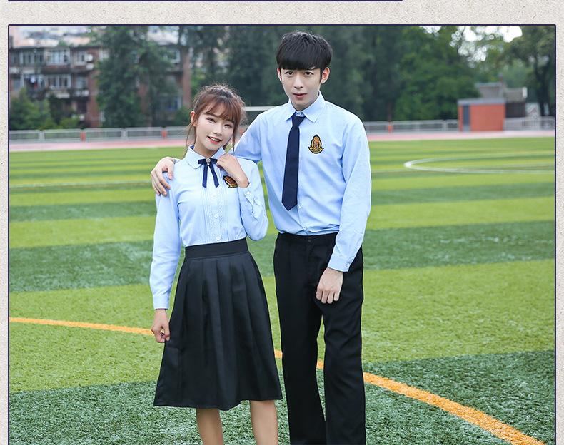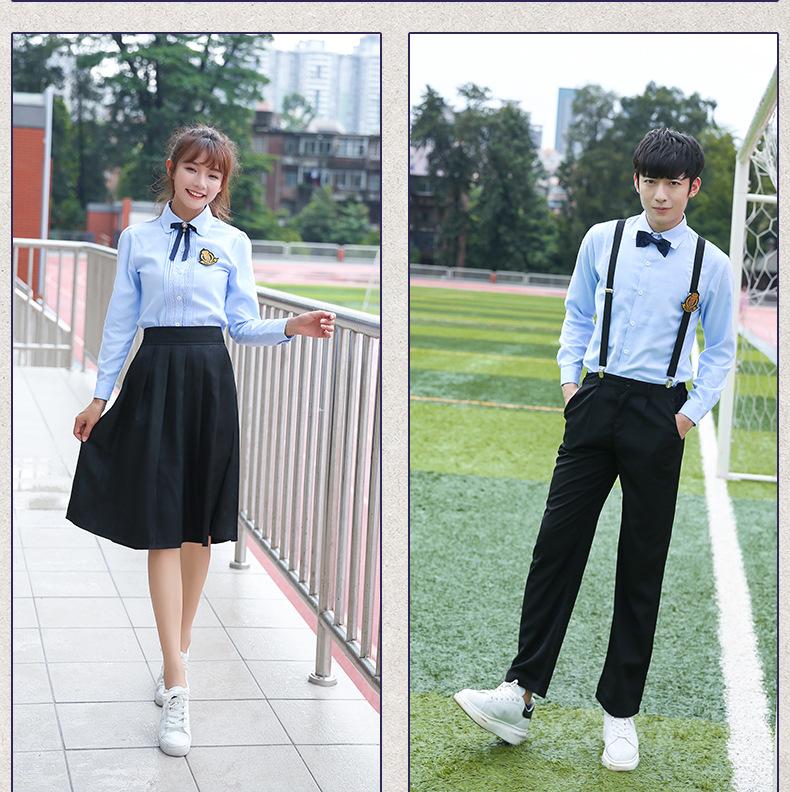 Men's blue long sleeve + black trousers + blue tie, Women's blue long sleeve + black dress + small bow tie
