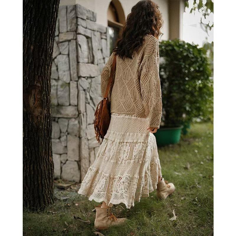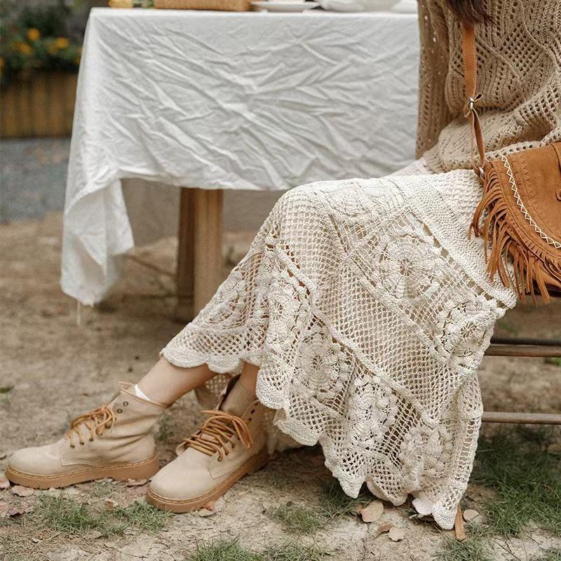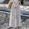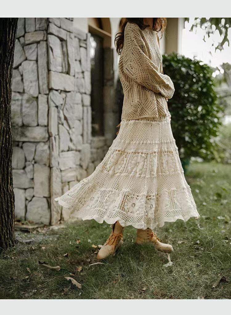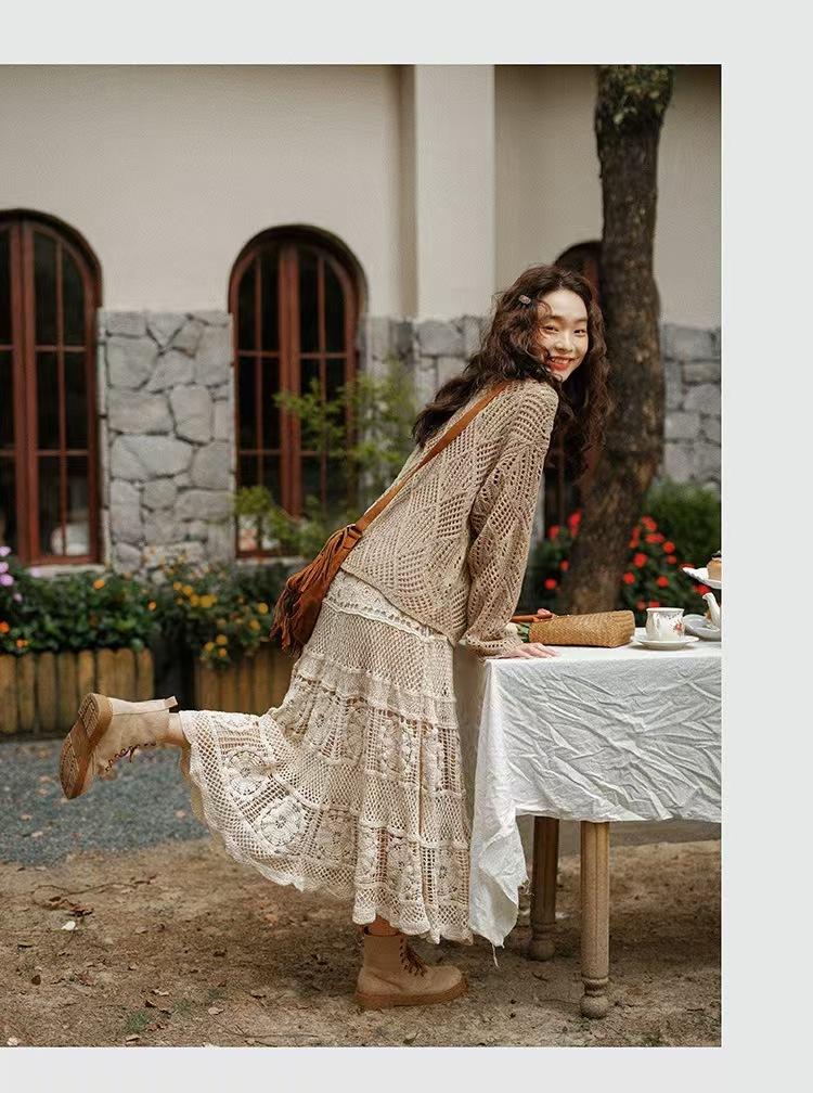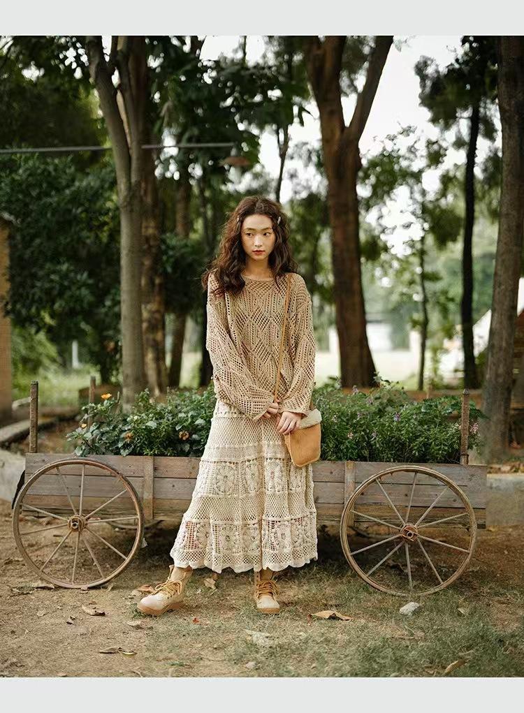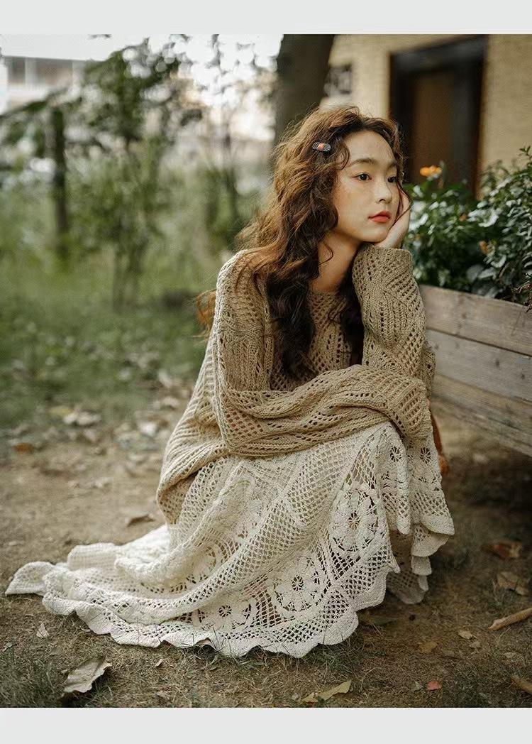 Vestido Largo Suave Color Albaricoque de Nuevo Estilo con un Diseño Femenino de Encaje Crochet Calado Adelgazante