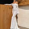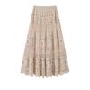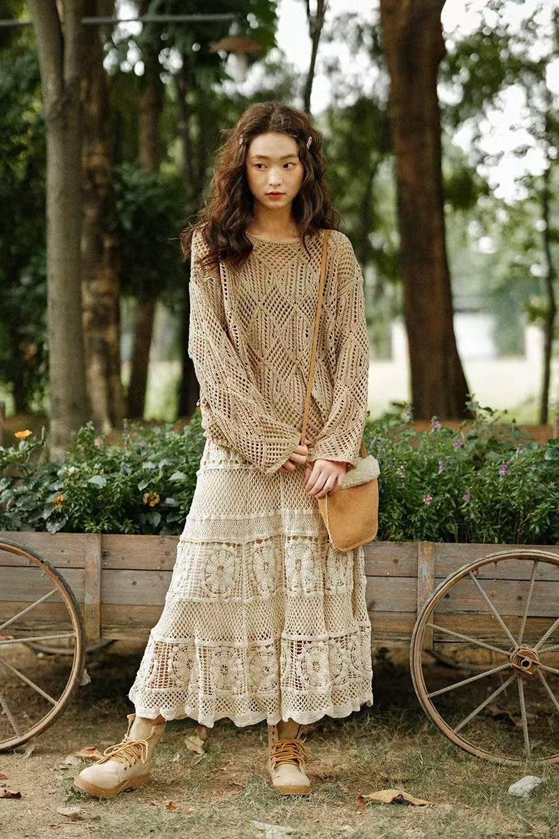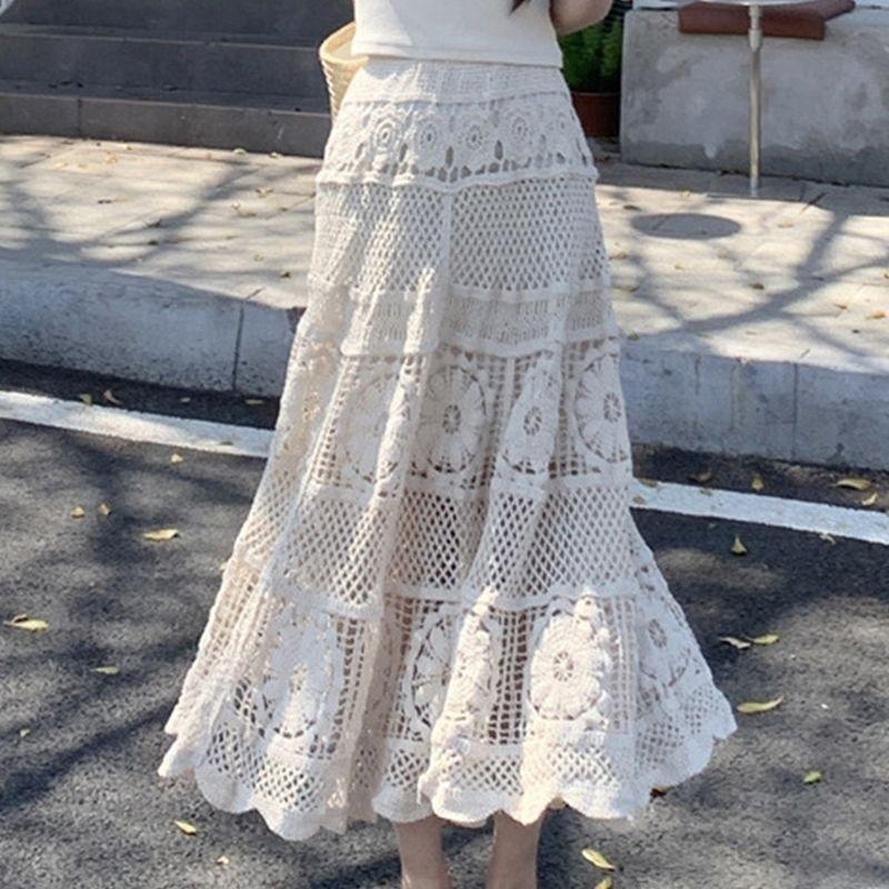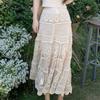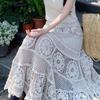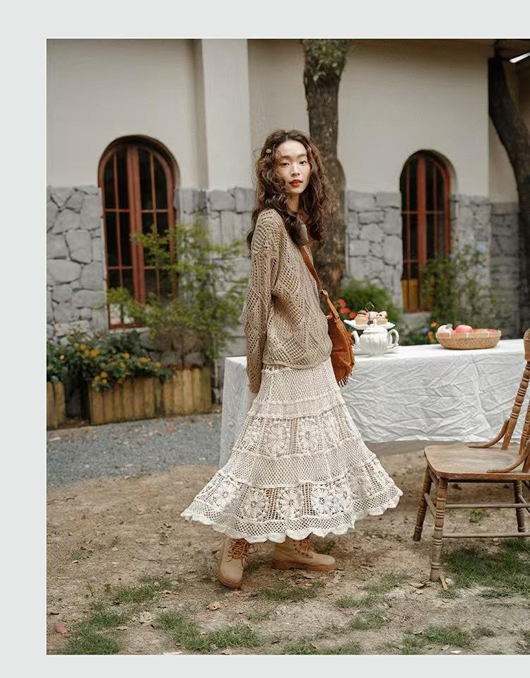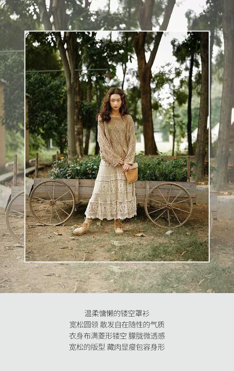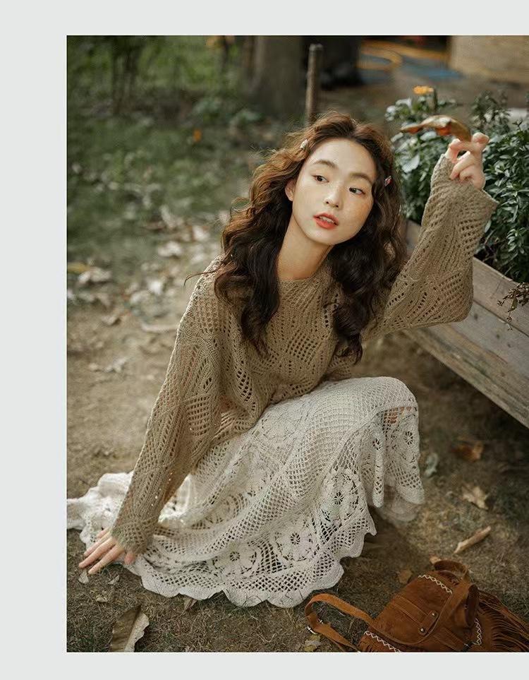 Vestido Largo Suave Color Albaricoque de Nuevo Estilo con un Diseño Femenino de Encaje Crochet Calado Adelgazante
