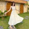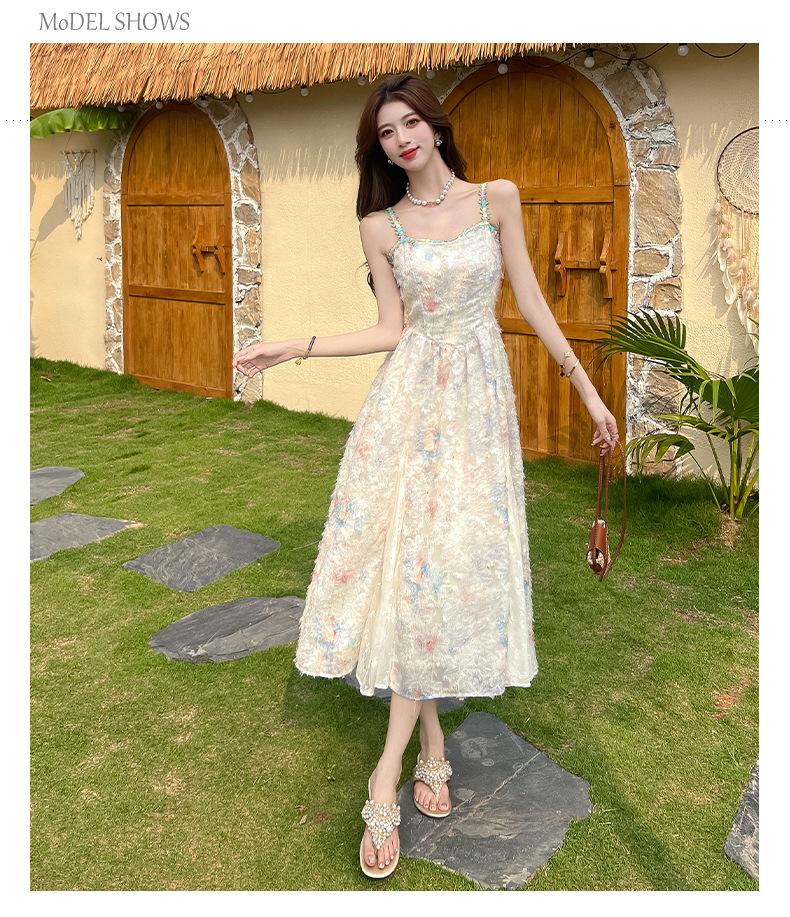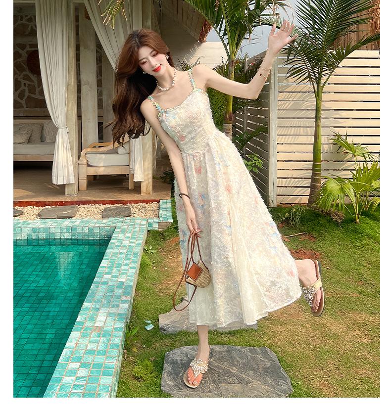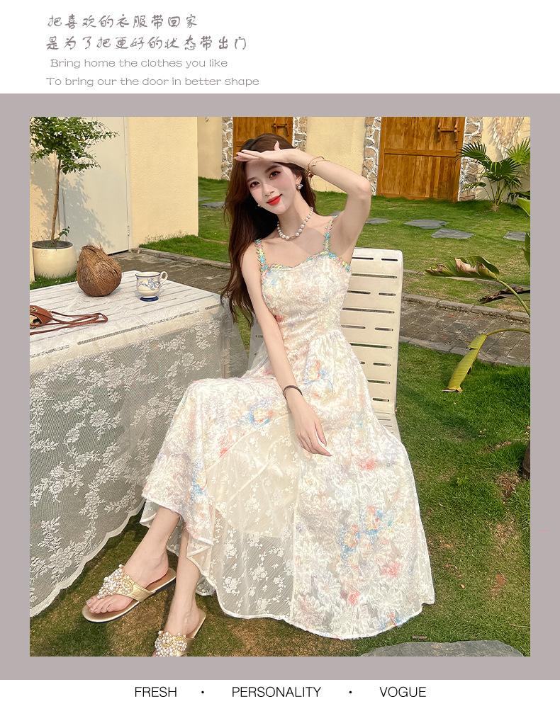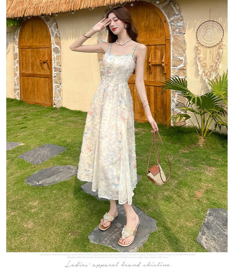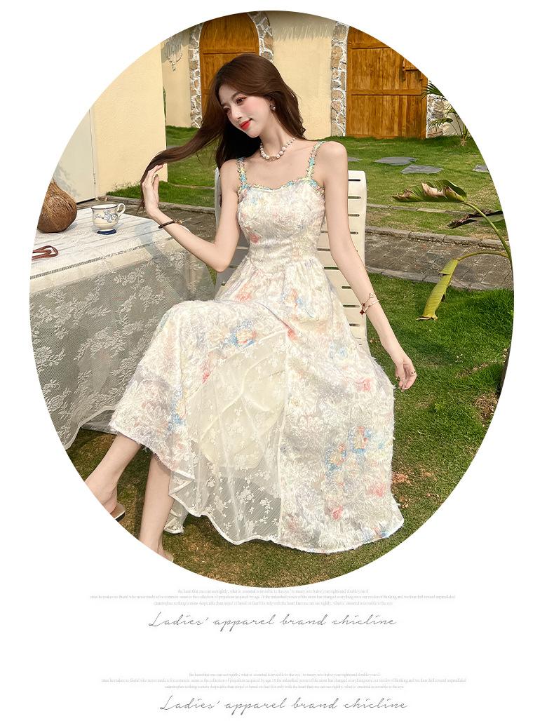Jardín de Monet Francés 2025 Nuevo Elegante Floral Verano Vestido de Tirantes Estilo Vacacional Cintura Playa Falda Larga