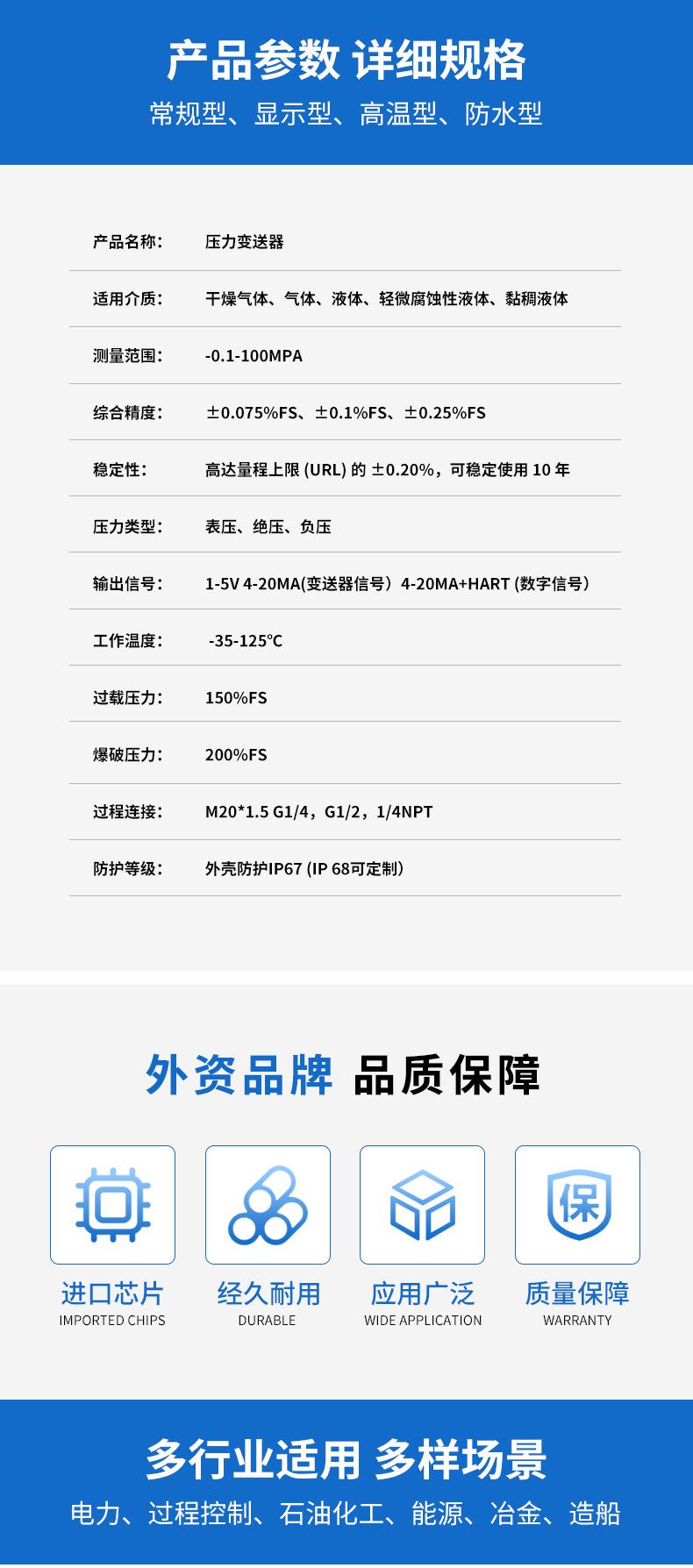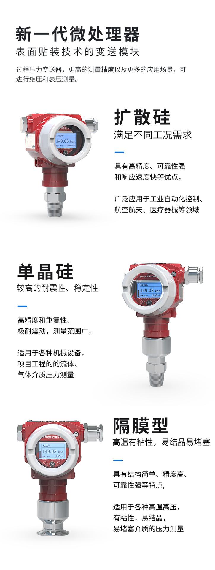 Proporcionamos a clientes de diversas industrias caudalímetros y otros productos fiables y de alta calidad. Daweston ofrece una variedad de caudalímetros, ampliamente utilizados en diversas industrias, como la química, la fundición, la conservación de energía y la protección del medio ambiente, y el tratamiento de aguas, entre otras, para satisfacer las complejas necesidades de medición de diferentes sectores. Caudalímetro electromagnético: como el caudalímetro electromagnético estándar FTE-1600A, que adopta el principio de inducción electromagnética de Faraday, no tiene piezas mecánicas móviles y es adecuado para ensayos no destructivos precisos de líquidos conductores. Su revestimiento especial de tetracloruro de vinilo o caucho lo hace altamente resistente a la corrosión y compatible con las necesidades de medición de líquidos corrosivos y sólidos en suspensión de alta concentración. Garantiza la fiabilidad de las mediciones a largo plazo. Compatible con diseño de instalación sin sección de tubería recta, ideal para tuberías complejas. El caudalímetro electromagnético sanitario de la serie FTE-1600Q es adecuado para la medición de caudal en las industrias alimentaria, farmacéutica y cervecera. Adopta nuevos materiales y procesos de revestimiento sanitario, cumple con los requisitos de higiene de la industria alimentaria y utiliza abrazaderas de acero inoxidable para la conexión, lo que facilita y agiliza el desmontaje y la limpieza, y evita la acumulación de residuos del fluido medido en el tubo de medición. Caudalímetro de vórtice: El caudalímetro de vórtice estándar de la serie FTV-1600S adopta el principio de vórtice Karman y puede monitorizar con precisión el caudal de gas, líquido y vapor. Presenta una amplia relación de rango, con una relación de hasta 100:1, ideal para entornos industriales con grandes fluctuaciones de caudal. Gracias a la optimización del algoritmo de procesamiento de señales, ofrece una sólida capacidad antiinterferencias y antivibración para garantizar un control estable en condiciones de trabajo complejas. Este producto está diseñado para medios complejos como el vapor a alta temperatura, se adapta a entornos de alta temperatura y alta presión, ofrece un rendimiento estable y fiable, y se utiliza habitualmente en la medición de caudal de vapor industrial, la monitorización del consumo energético de calderas y la monitorización del caudal de aire comprimido, entre otros. Caudalímetro de turbina: Mide con precisión diversos fluidos, ofrece alta precisión y fiabilidad, y cumple con los estrictos requisitos de precisión de medición de caudal en los procesos de producción industrial. Se utiliza ampliamente en la medición de caudal de líquidos en industrias como la petrolera, la química y la eléctrica, ayudando a las empresas a lograr un control preciso del caudal y la contabilidad de costes. Caudalímetro másico: El caudalímetro másico de gas de alto rendimiento de la serie FTW-1600P, basado en el principio de difusión térmica, mide con precisión el caudal másico de gas, lo que resulta adecuado para la monitorización de un solo gas o de una mezcla de gases con una proporción fija. Ofrece un buen rendimiento en condiciones de bajo caudal, ofrece un amplio rango de medición y es adecuado para situaciones de alta demanda. Detecta de forma sincronizada el caudal y la temperatura del gas, admite compensación dinámica y garantiza datos precisos y estables. Al mismo tiempo, proporciona diversas salidas de señal (como 4-20 mA, RS485), lo que facilita su integración en sistemas de automatización como DCS o PLC. Se puede aplicar a gasoductos, monitoreo de flujo de aire, control de emisiones de gases de combustión, gestión del consumo de aire comprimido, etc. Microcaudalímetro: Satisface las necesidades específicas de medición precisa de microcaudales y desempeña un papel importante en escenarios con alta precisión de monitoreo de caudal y caudales pequeños, como la investigación experimental o pequeñas unidades de producción en química fina, biofarmacéutica y otras industrias, ofreciendo sólidas garantías de precisión en la producción refinada y datos experimentales en estas industrias. Transmisor de presión: El transmisor de presión de Dawiston ofrece alta precisión y estabilidad a largo plazo, y se puede utilizar para la medición de presión de proceso, presión diferencial, nivel y caudal. Por ejemplo, ofrece un excelente rendimiento en escenarios como la medición de nivel de líquidos (materiales) en condiciones de trabajo rigurosas y la medición de presión estable y de alta precisión en condiciones de trabajo convencionales. Proporciona datos fiables para el monitoreo y control de presión en procesos de producción industrial, ayudando a las empresas a optimizar los procesos de producción y garantizar la seguridad de la producción. Los productos de Daweston ofrecen ventajas únicas, como la integración inteligente con IoT, el diseño modular, la cobertura total de la industria y una excelente relación calidad-precio. Son compatibles con protocolos de comunicación como RS485 y HART, y se conectan fácilmente a la plataforma IoT para monitorizar datos en tiempo real. Gracias a su diseño modular, los usuarios pueden seleccionar con flexibilidad el rango y el método de salida de la señal para satisfacer las necesidades de múltiples industrias y condiciones de trabajo. Desde la energía hasta la administración municipal, desde la protección ambiental hasta la industria química, los productos de Daweston ayudan a toda la industria a lograr mediciones precisas y una gestión inteligente. Gracias a su rendimiento y a sus amplias ventajas de coste, se han convertido en una opción fiable para diversos sectores. Ya sea para lograr la transformación hacia la energía verde en el sector de las energías fósiles o para promover el desarrollo inteligente y efic
