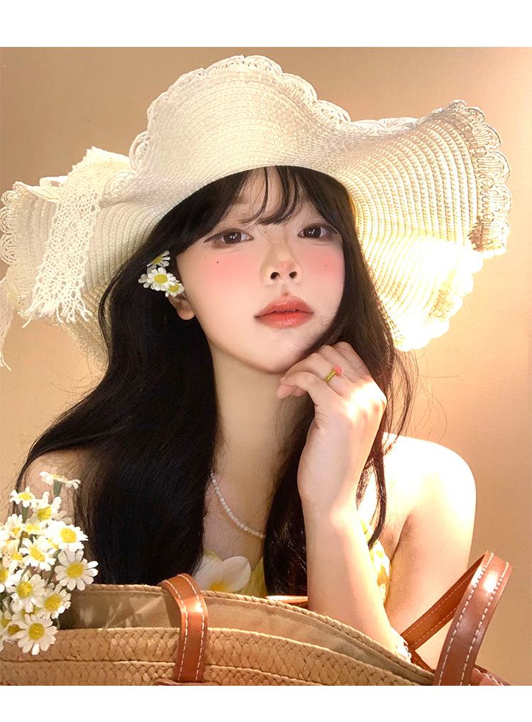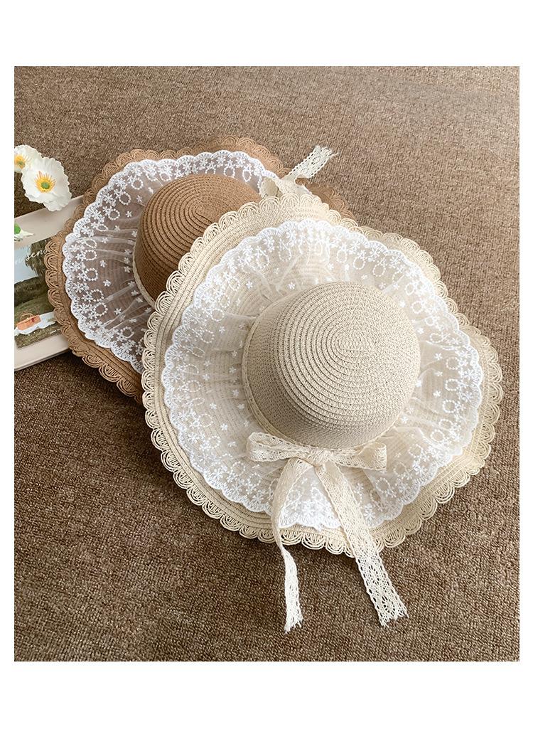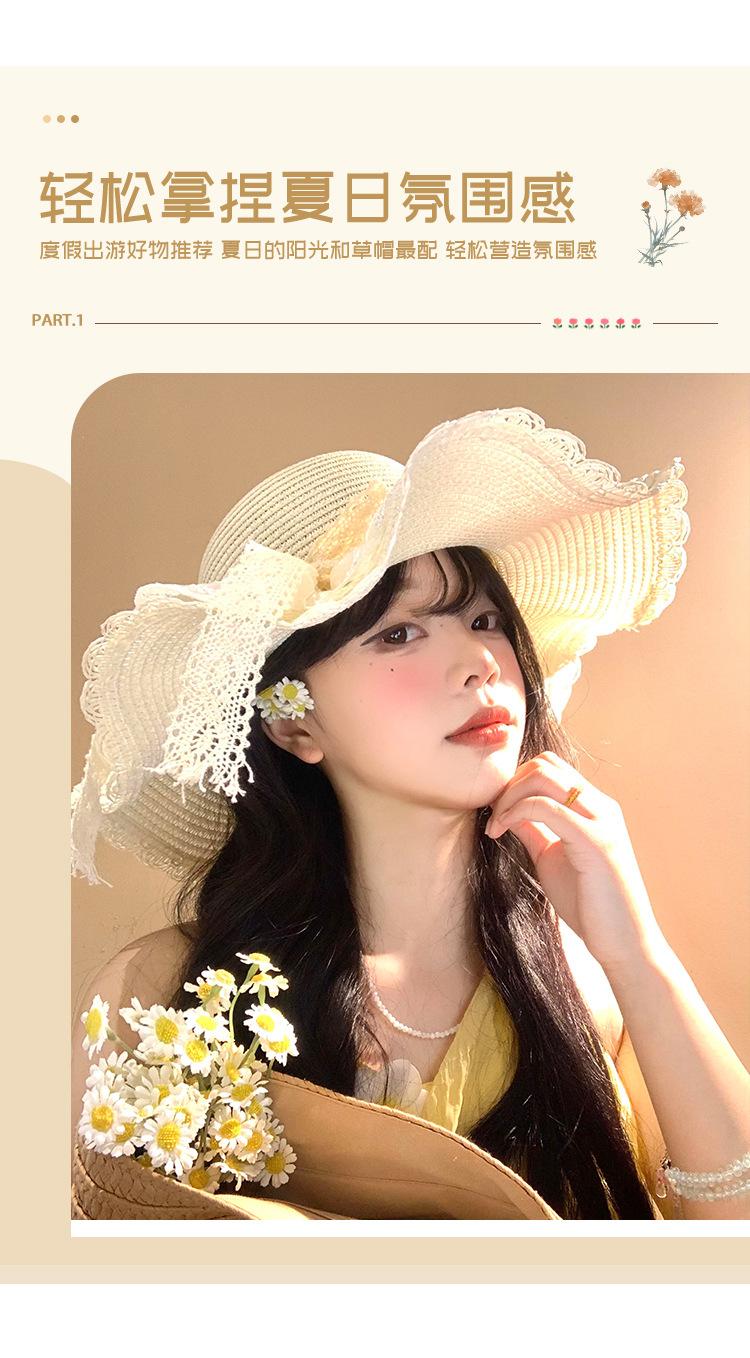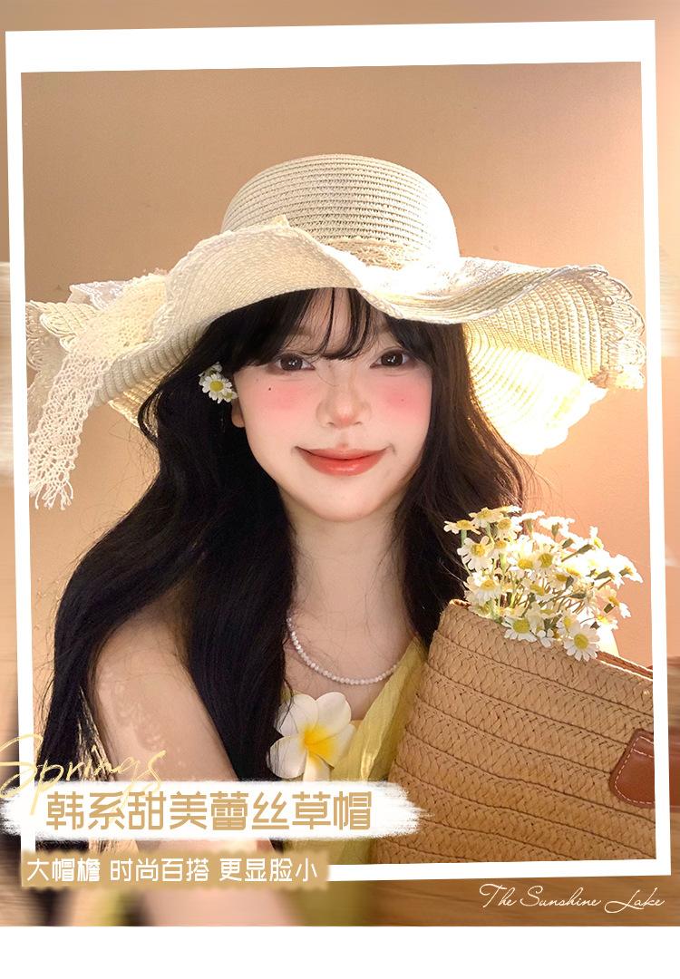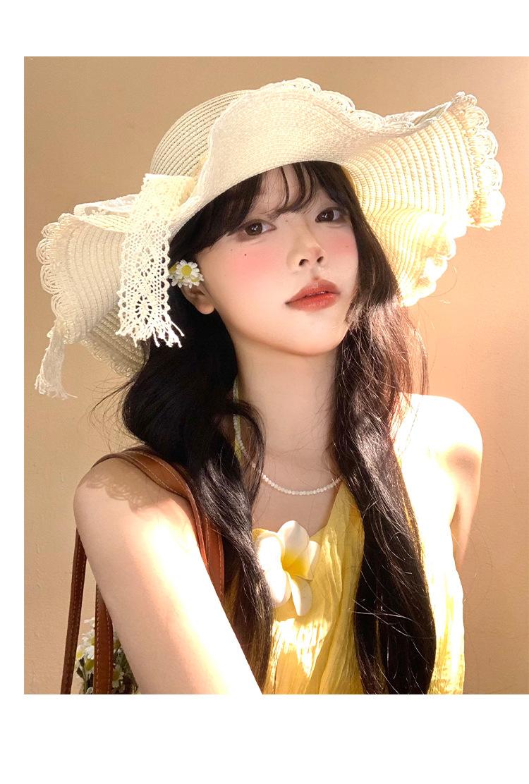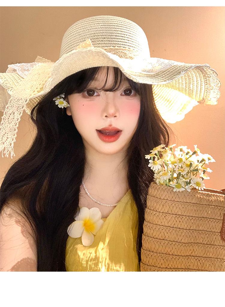 Sombrero de Paja con Lazo de Encaje para Mujer Verano Vacaciones en la Playa Mar Sombrero para el Sol Sombrero Francés de Ala Ancha Protección Solar