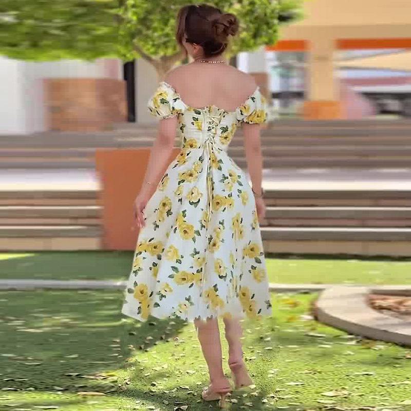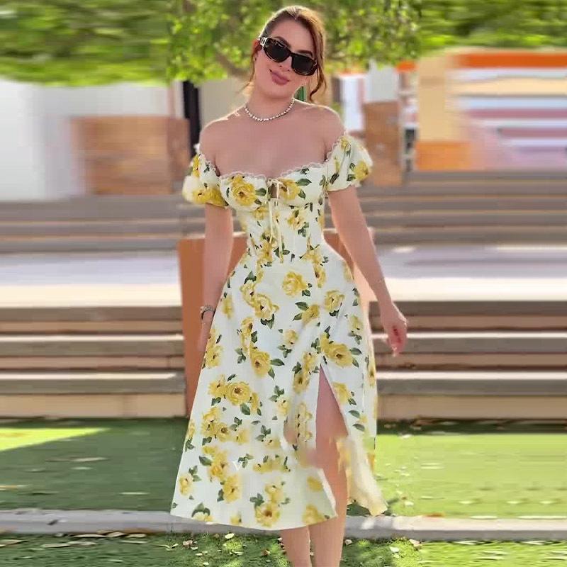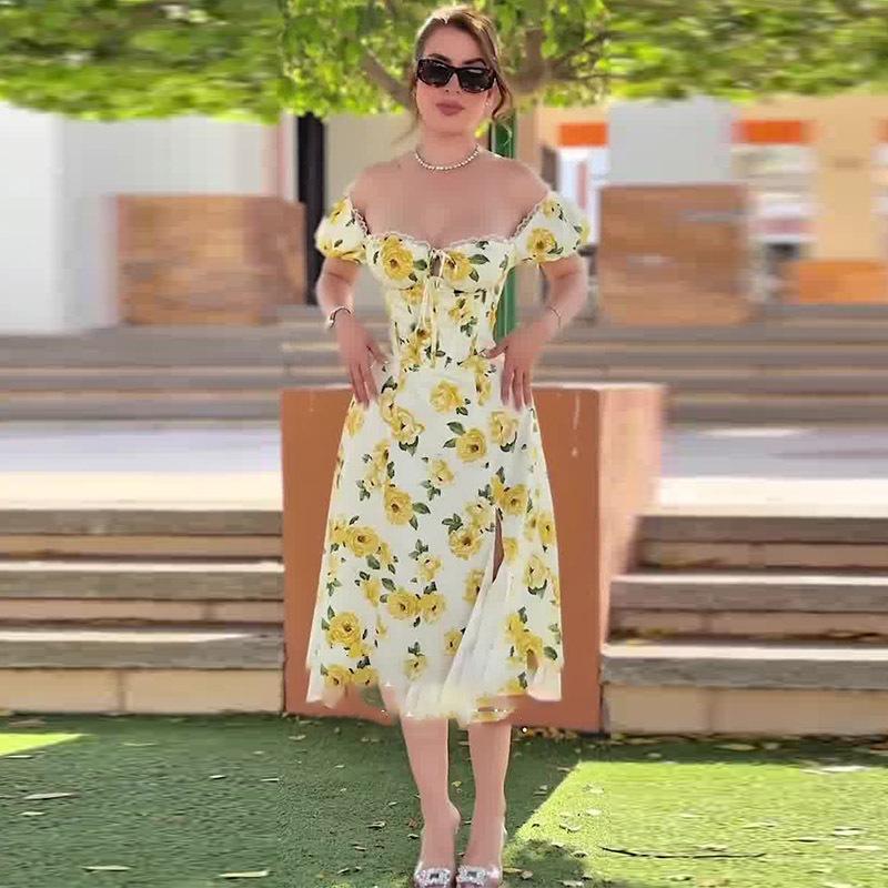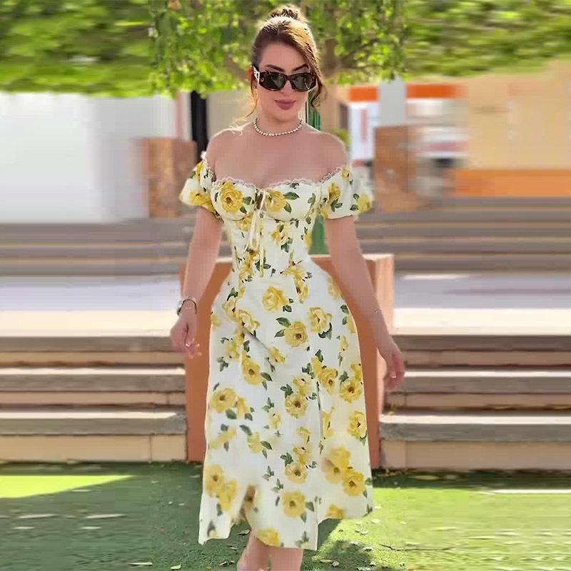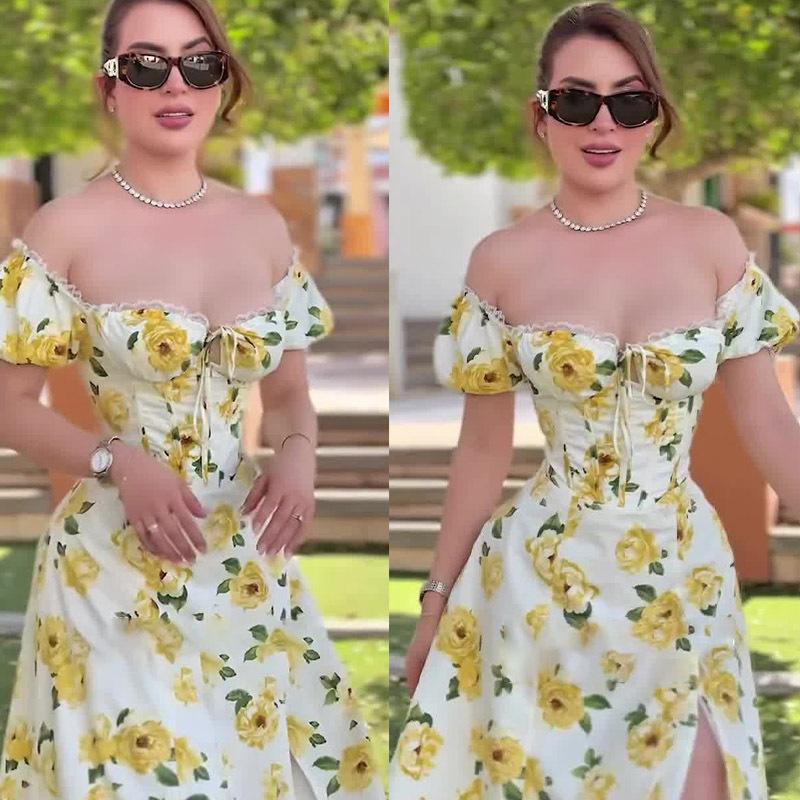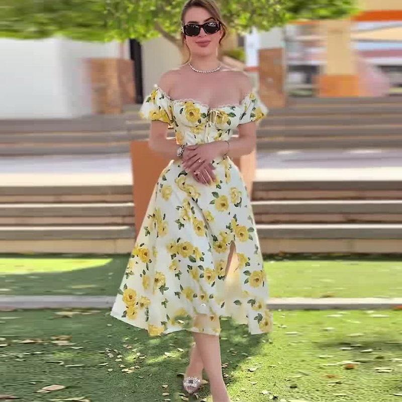 Verano 2025 Nuevo Europeo y Americano Amazon Vestido Largo de Moda Ajustado con Estampado de Flores con Tirantes Descubierto de Hombros de Cintura Alta