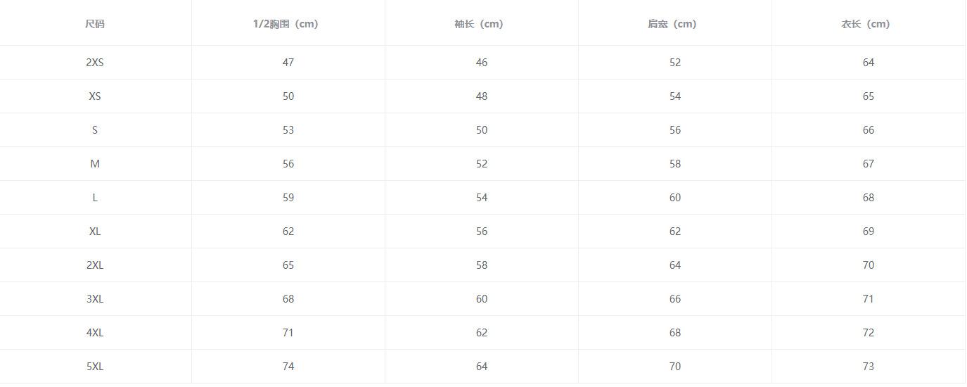 XXS, XS, S, M, L, XL, 2XL, 3XL, 4XL, 5XL