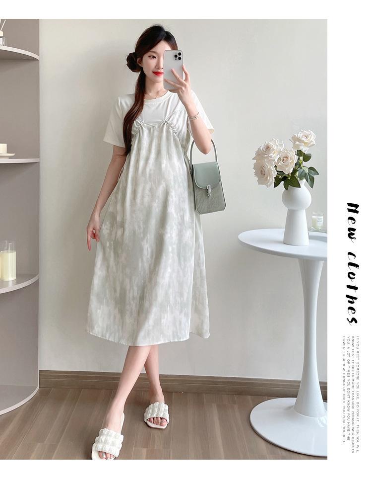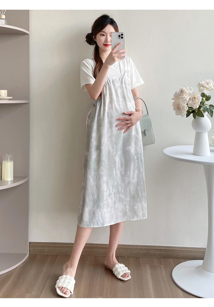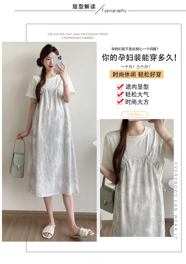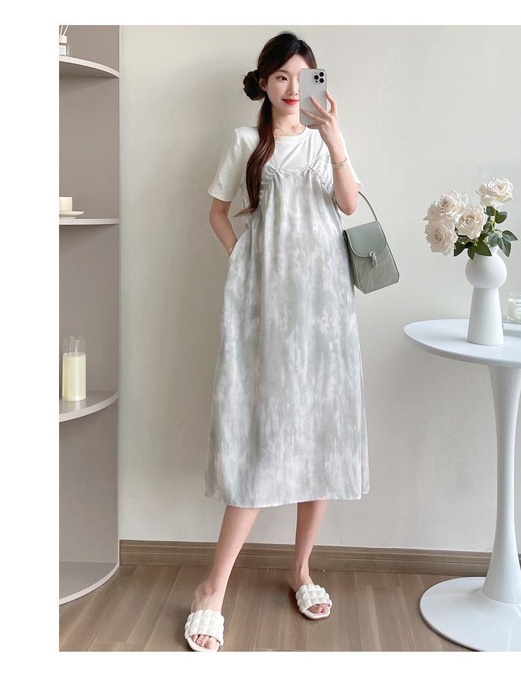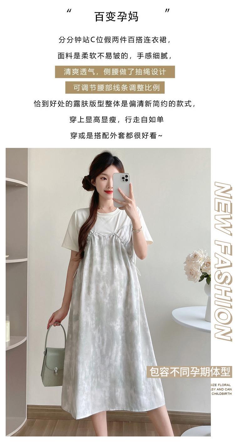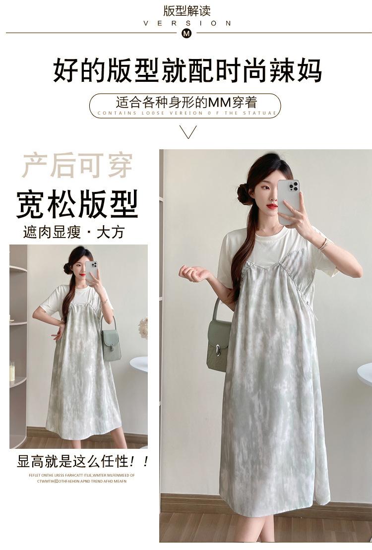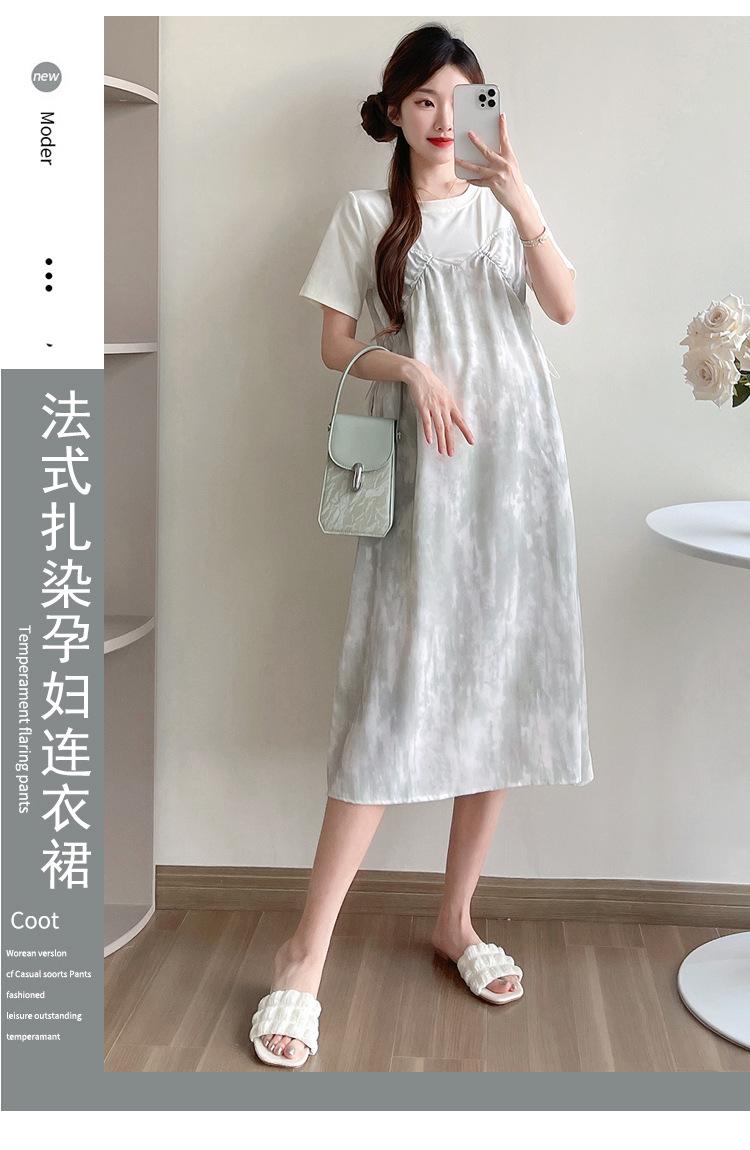 Maternidad 2025 Verano Nueva Moda Contraste Tie-dye Falso Dos Piezas Costura Suelto Adelgazante Talla Grande Vestido