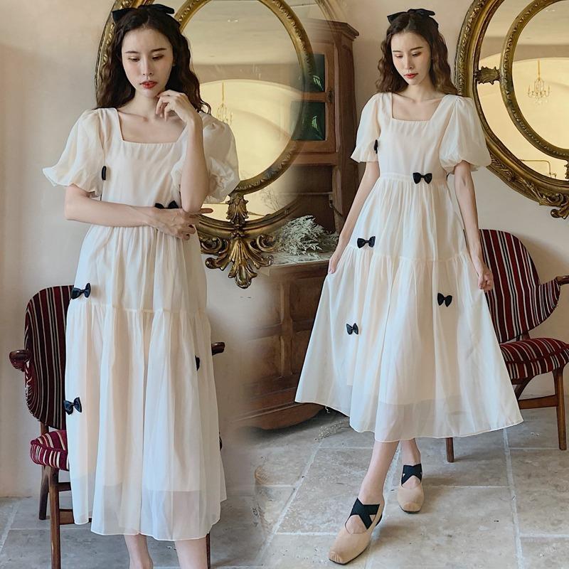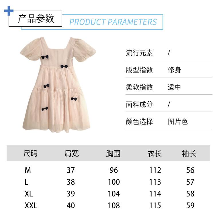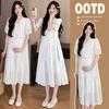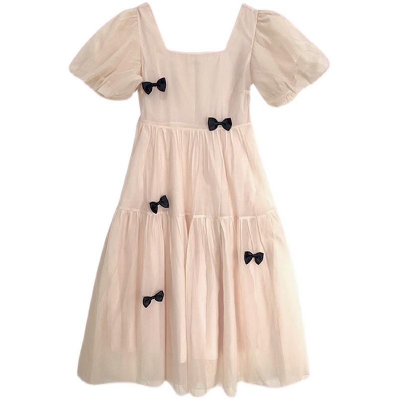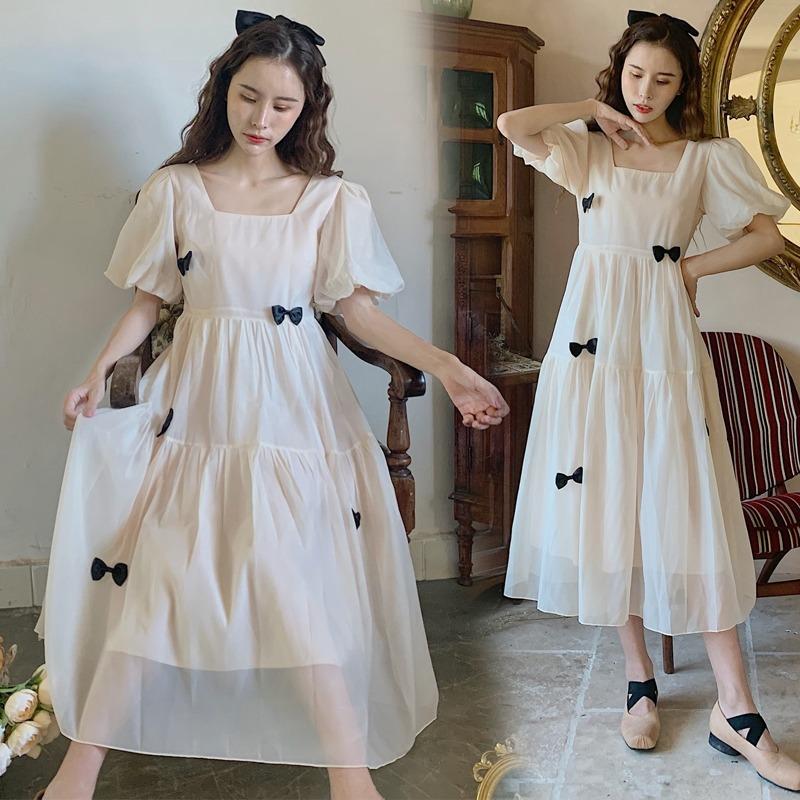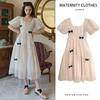 Ropa de Maternidad 2025 Verano Nuevo Dulce Malla Cuello Cuadrado Lazo Mangas Abullonadas Suelto Talla Grande Vestido de Maternidad