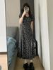 Elegante Vestido Midi Estilo Francés con Cuello Cuadrado, Abertura, Corte Slim Cubre Vientre, para Mujer, Verano, Vestido Floral Negro