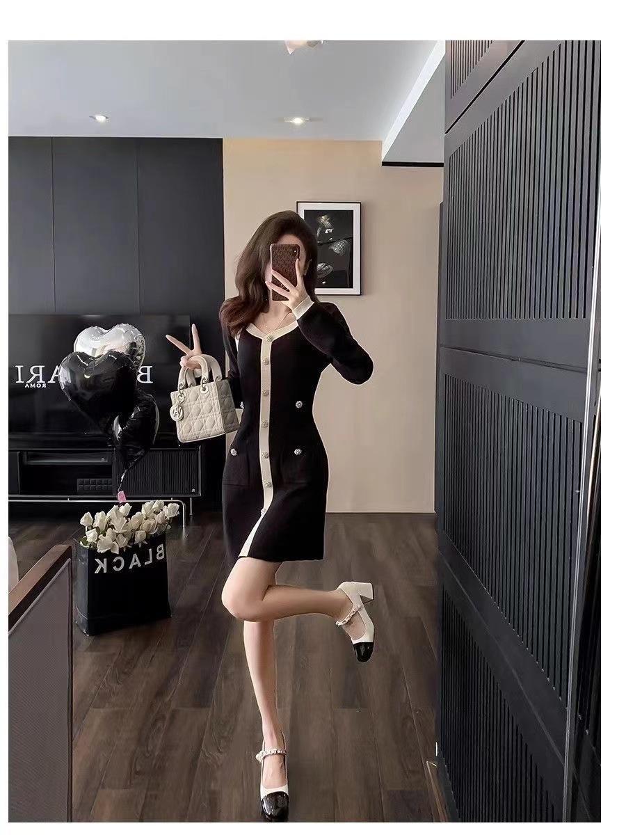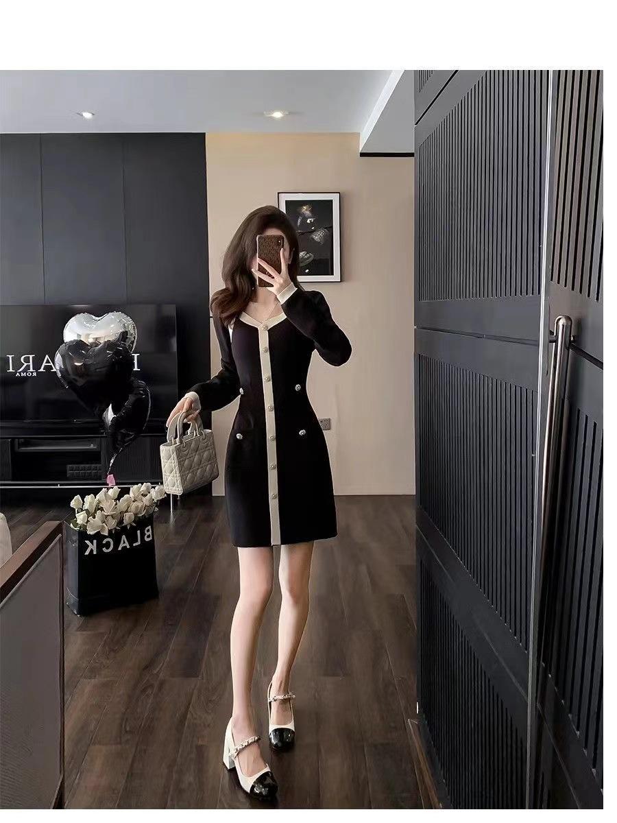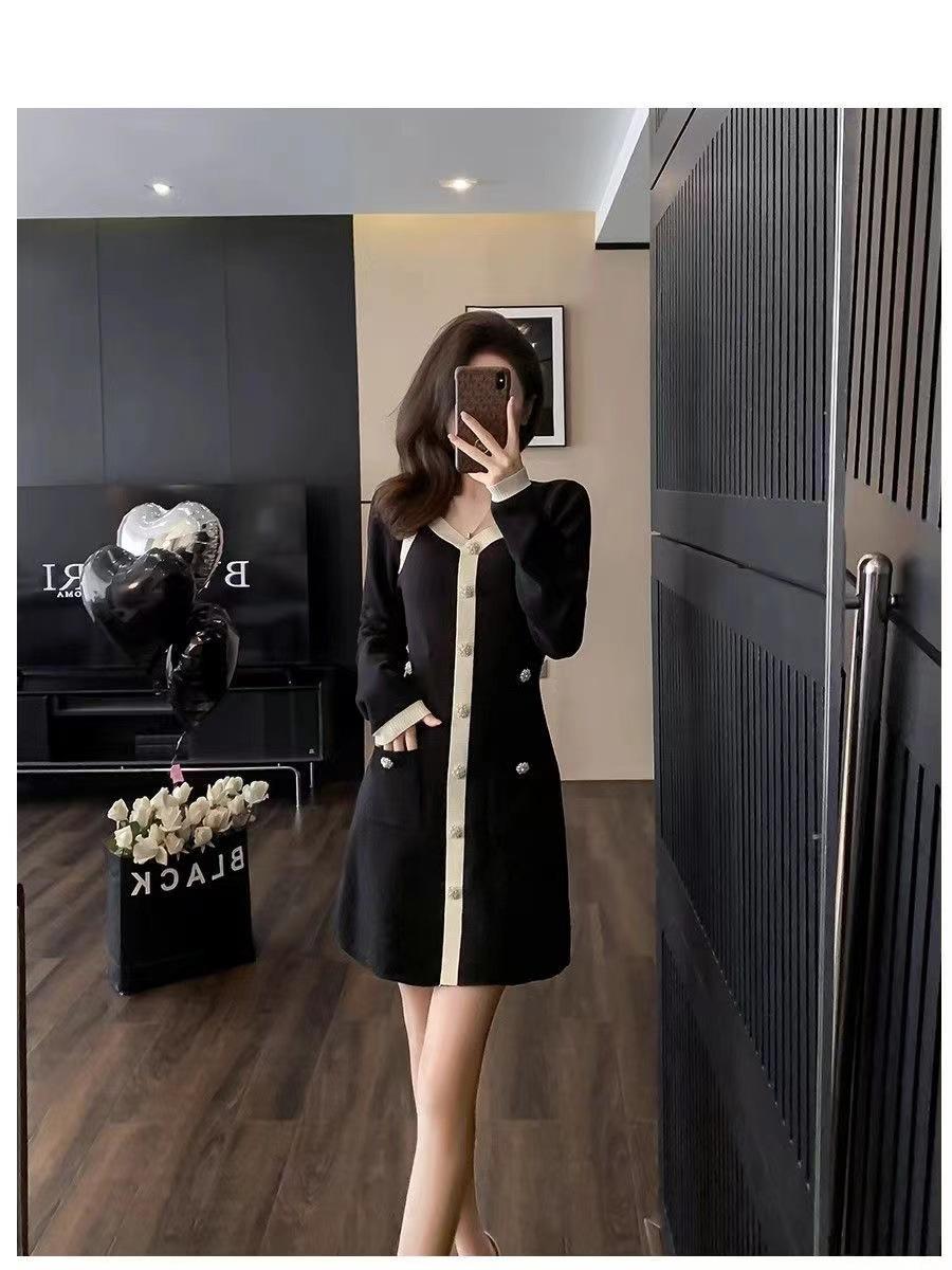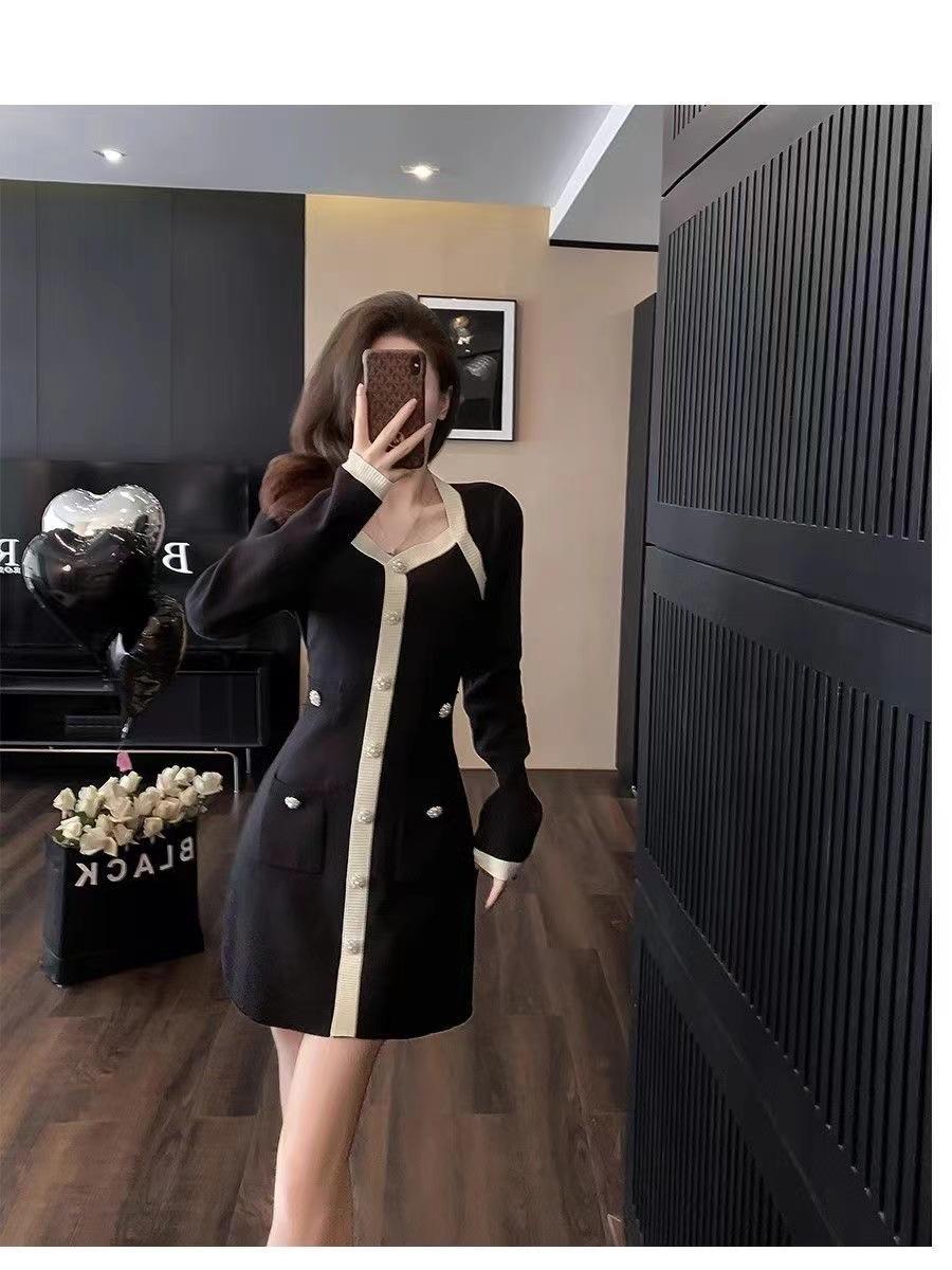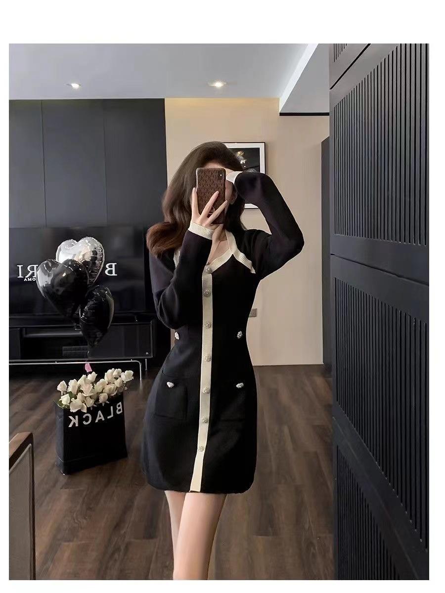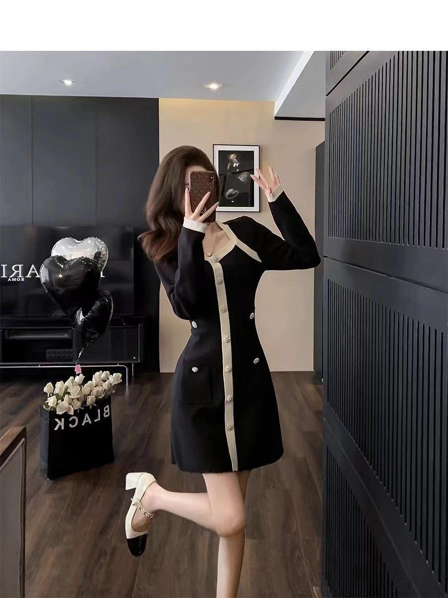 Elegante Vestido Tejido de Otoño e Invierno con Cuello en V, Estilo Francés de Fragancia Pequeña, Vestido Negro Corto de Alta Gama que Ciñe la Cintura a la Moda para Mujer