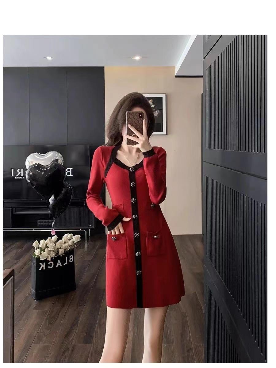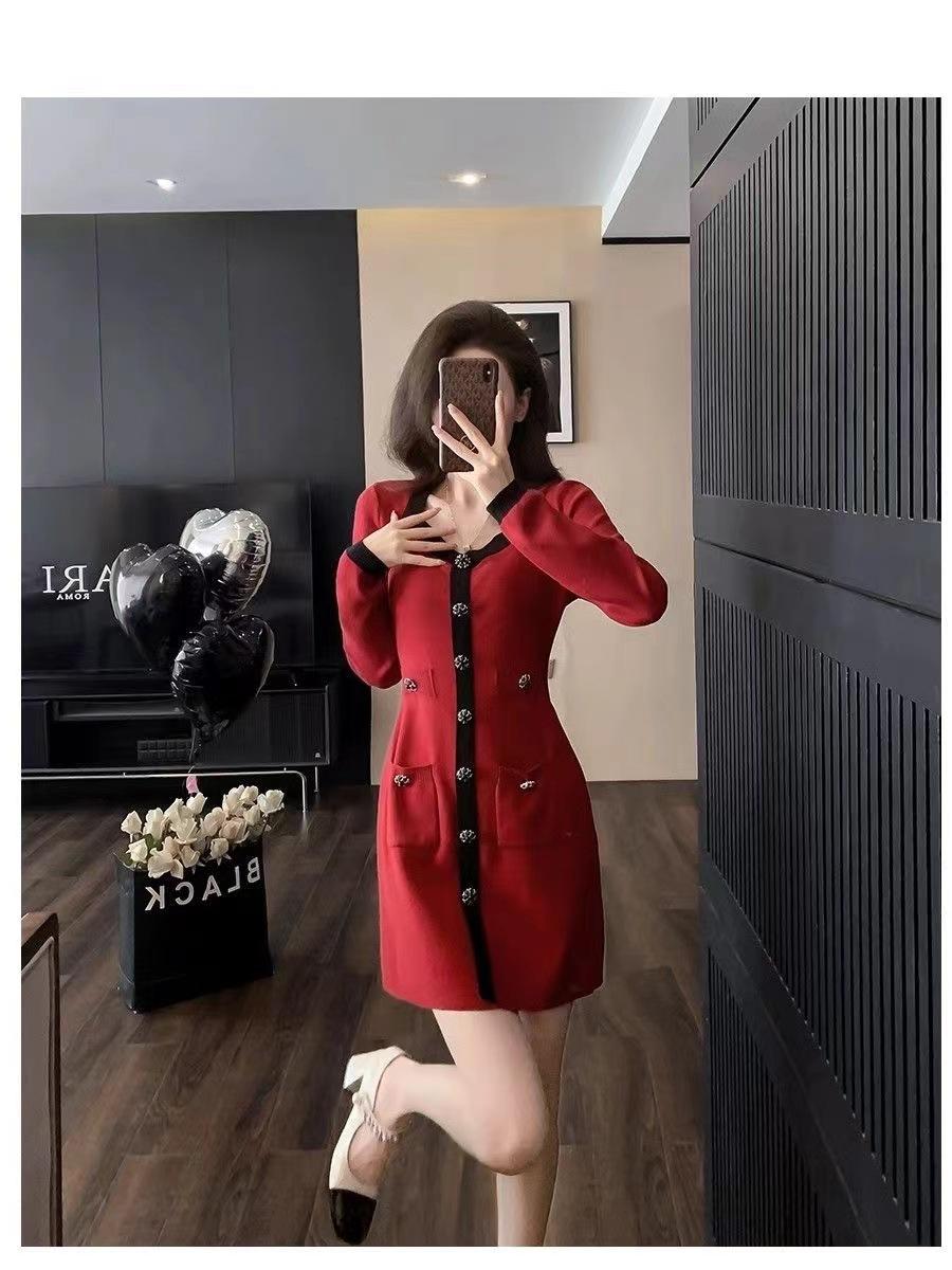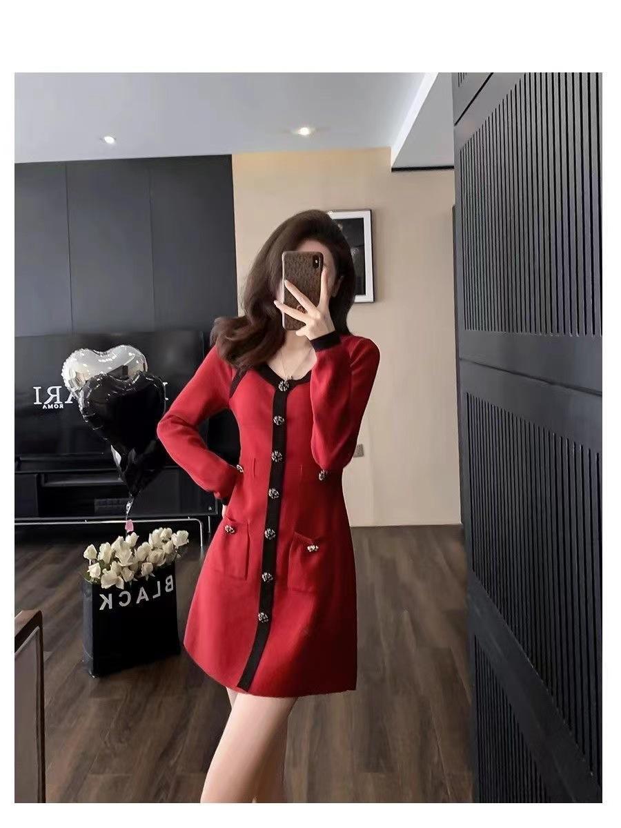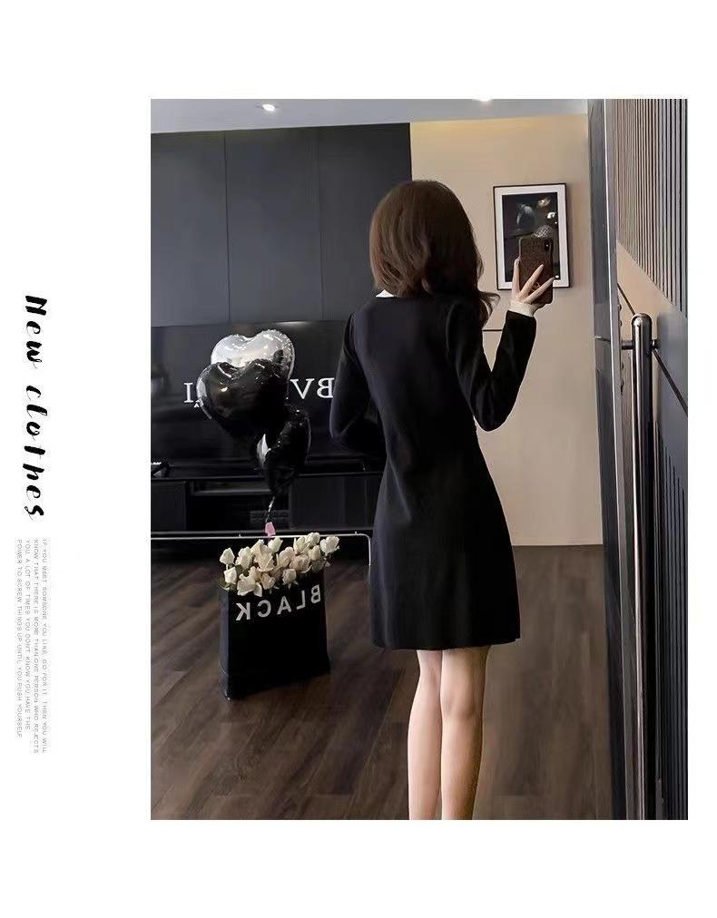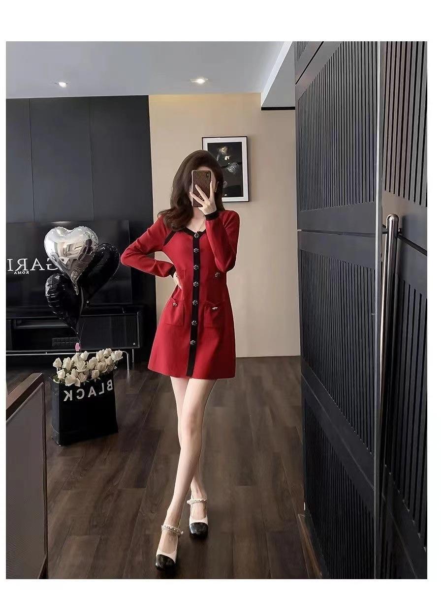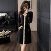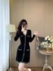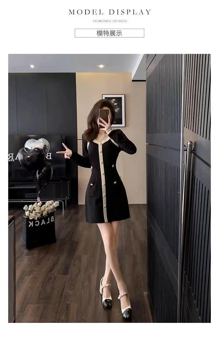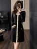 Elegante Vestido Tejido de Otoño e Invierno con Cuello en V, Estilo Francés de Fragancia Pequeña, Vestido Negro Corto de Alta Gama que Ciñe la Cintura a la Moda para Mujer