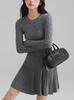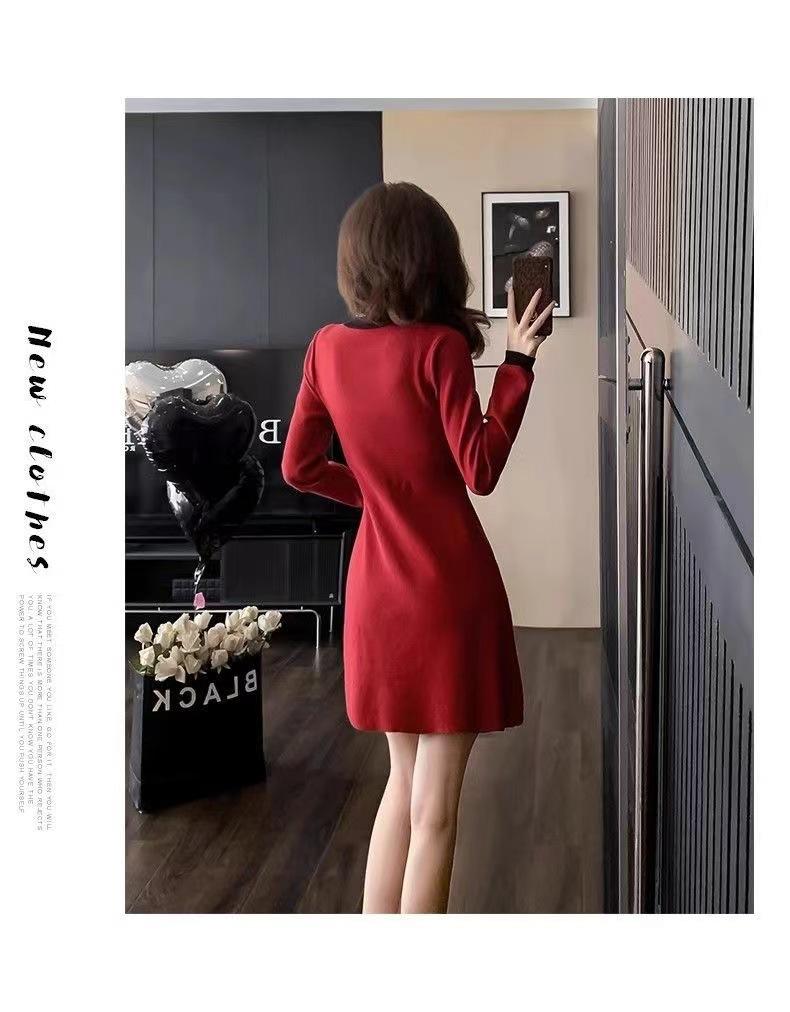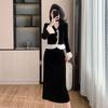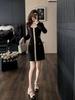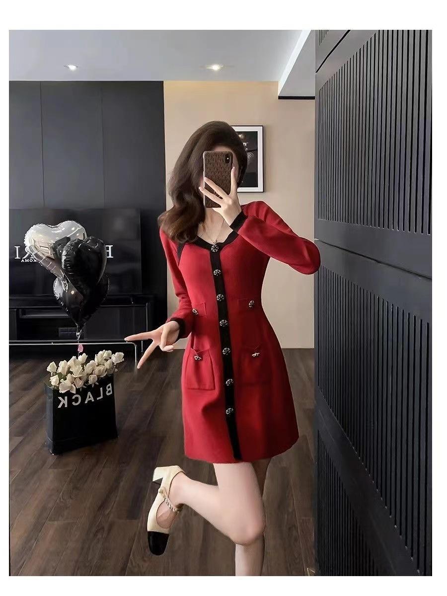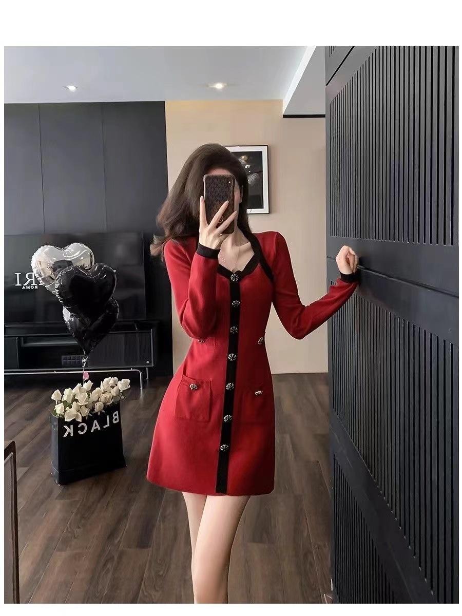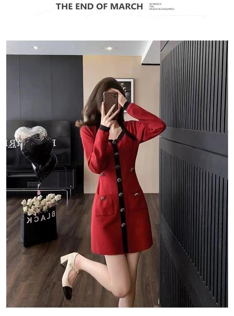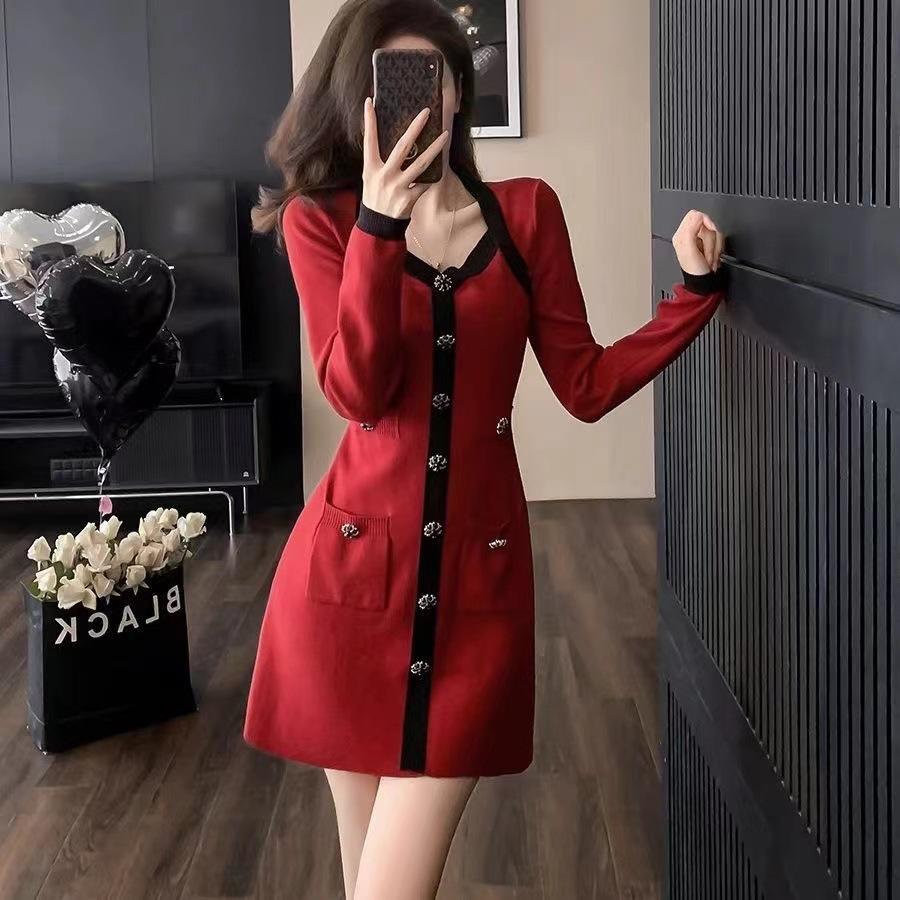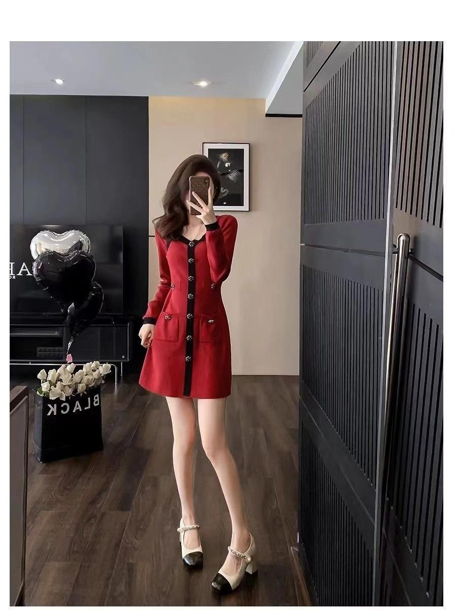Elegante Vestido Tejido de Otoño e Invierno con Cuello en V, Estilo Francés de Fragancia Pequeña, Vestido Negro Corto de Alta Gama que Ciñe la Cintura a la Moda para Mujer