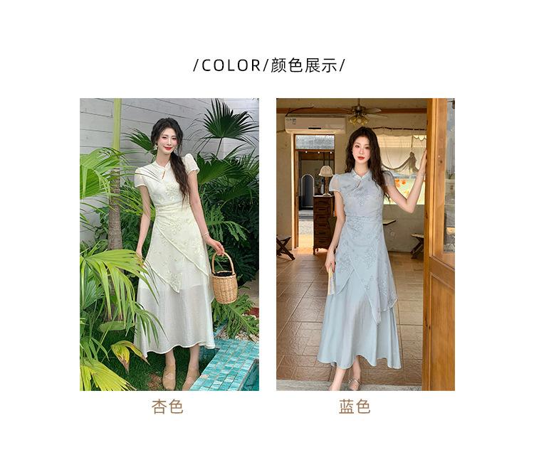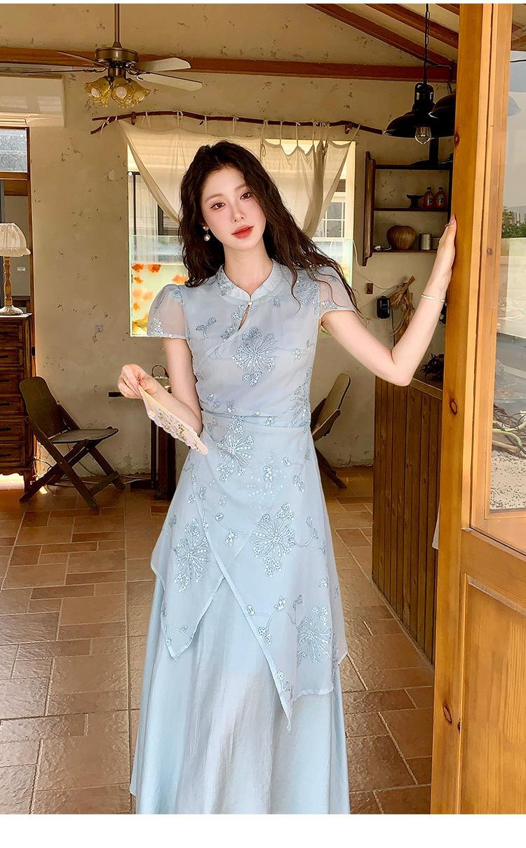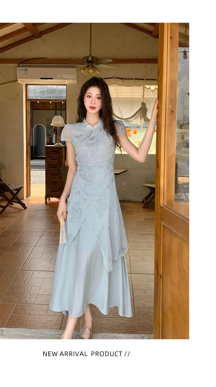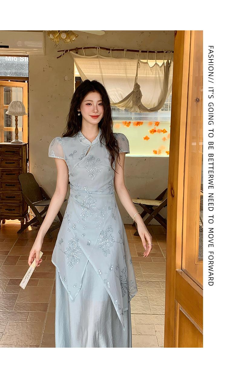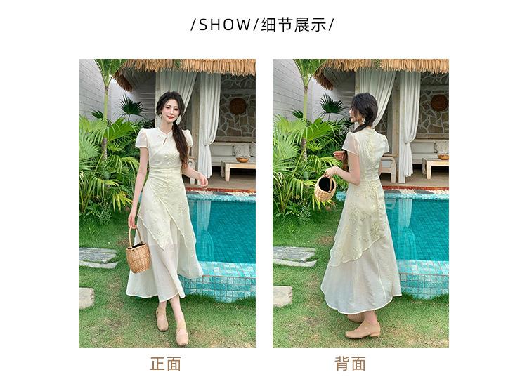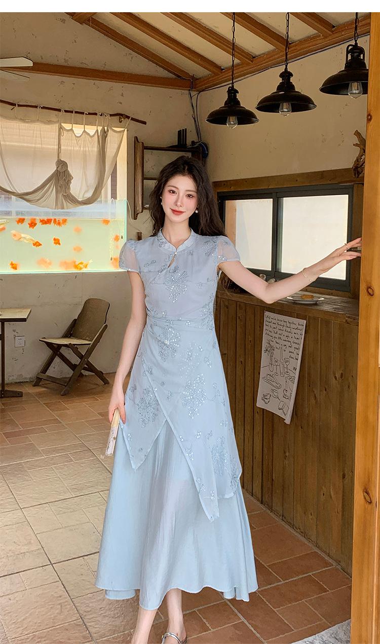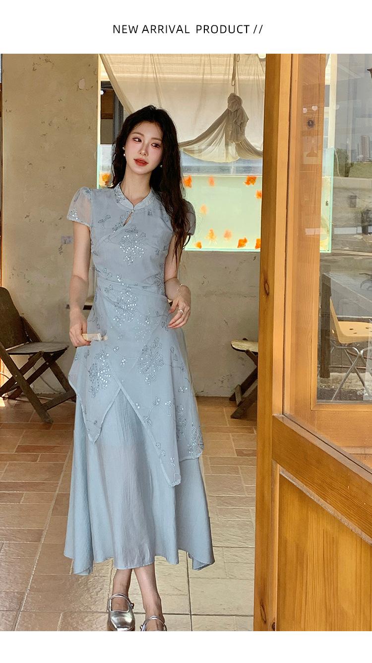 Verano Nuevo Estilo Chino Cuello Mao Asimétrico Falso Dos Piezas Cheongsam Mejorado