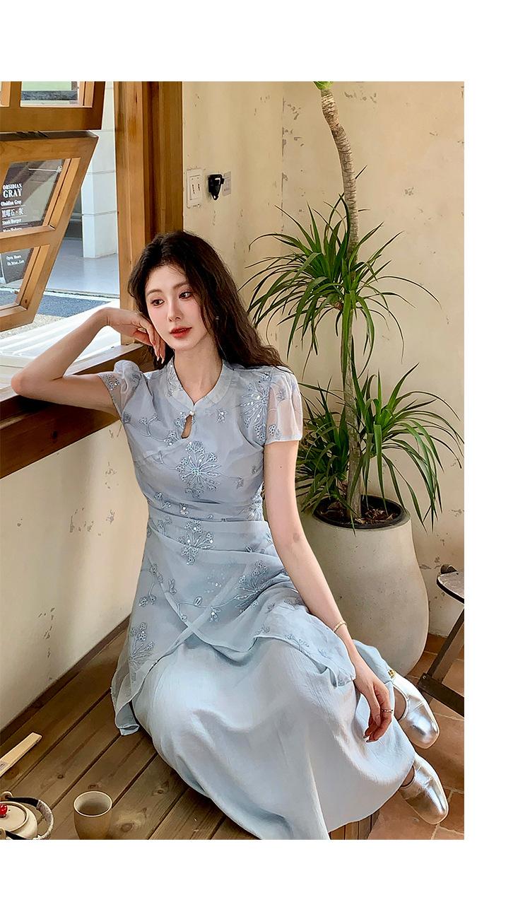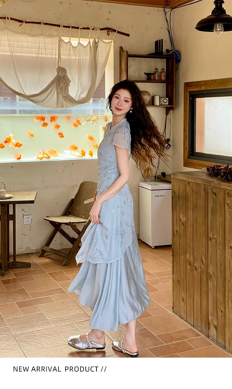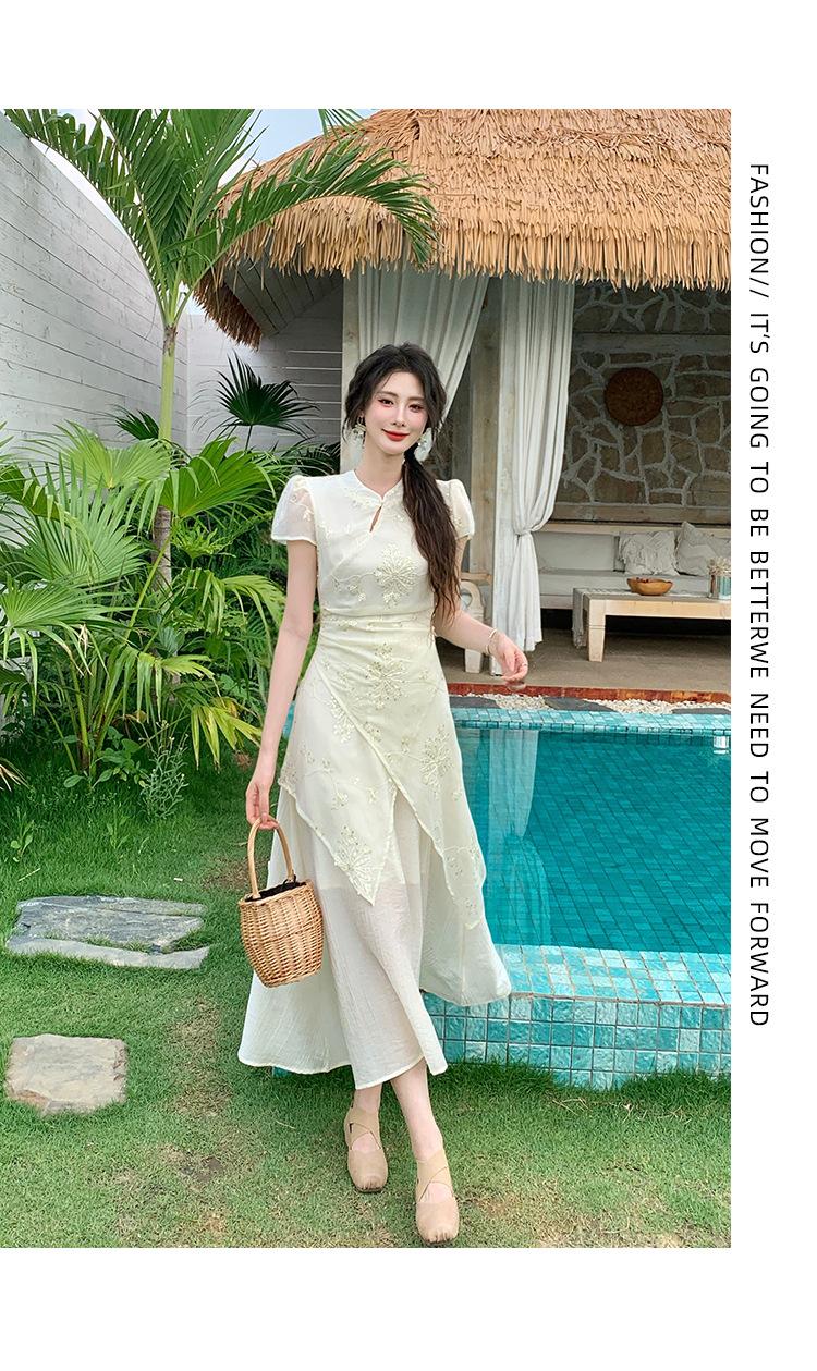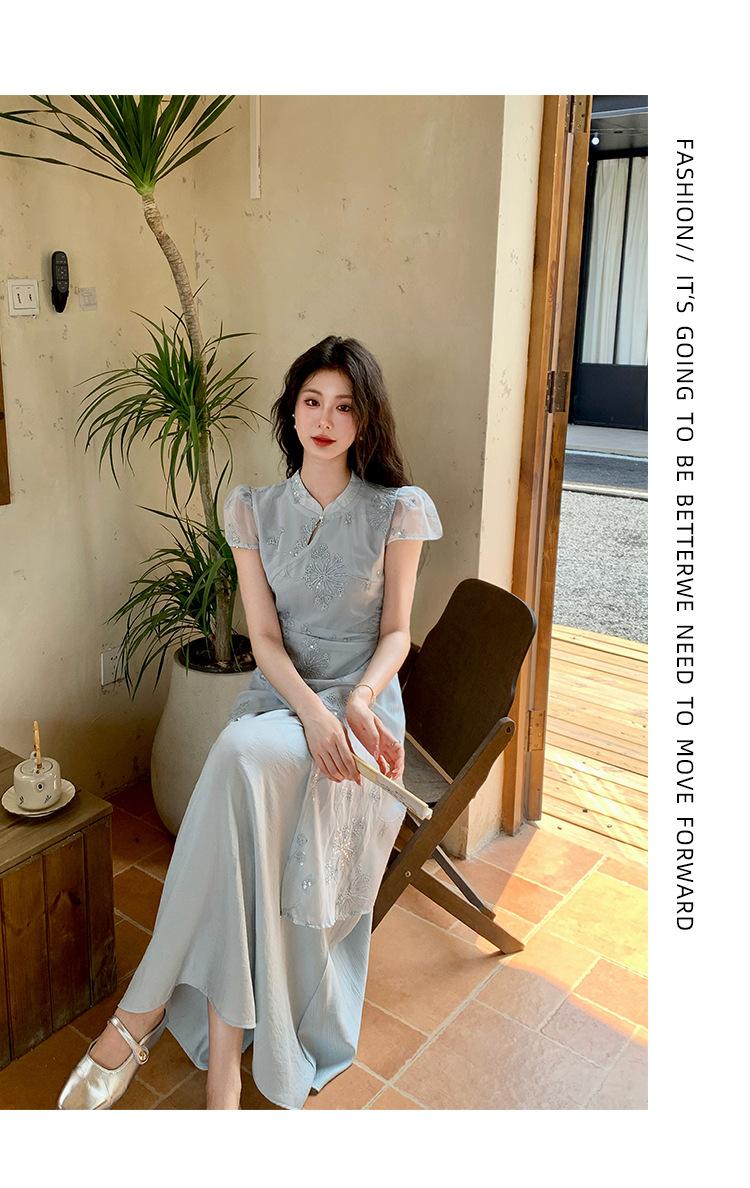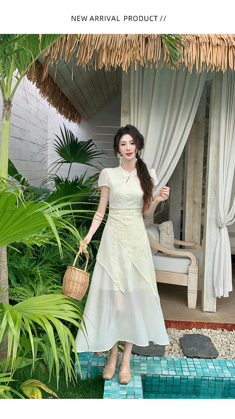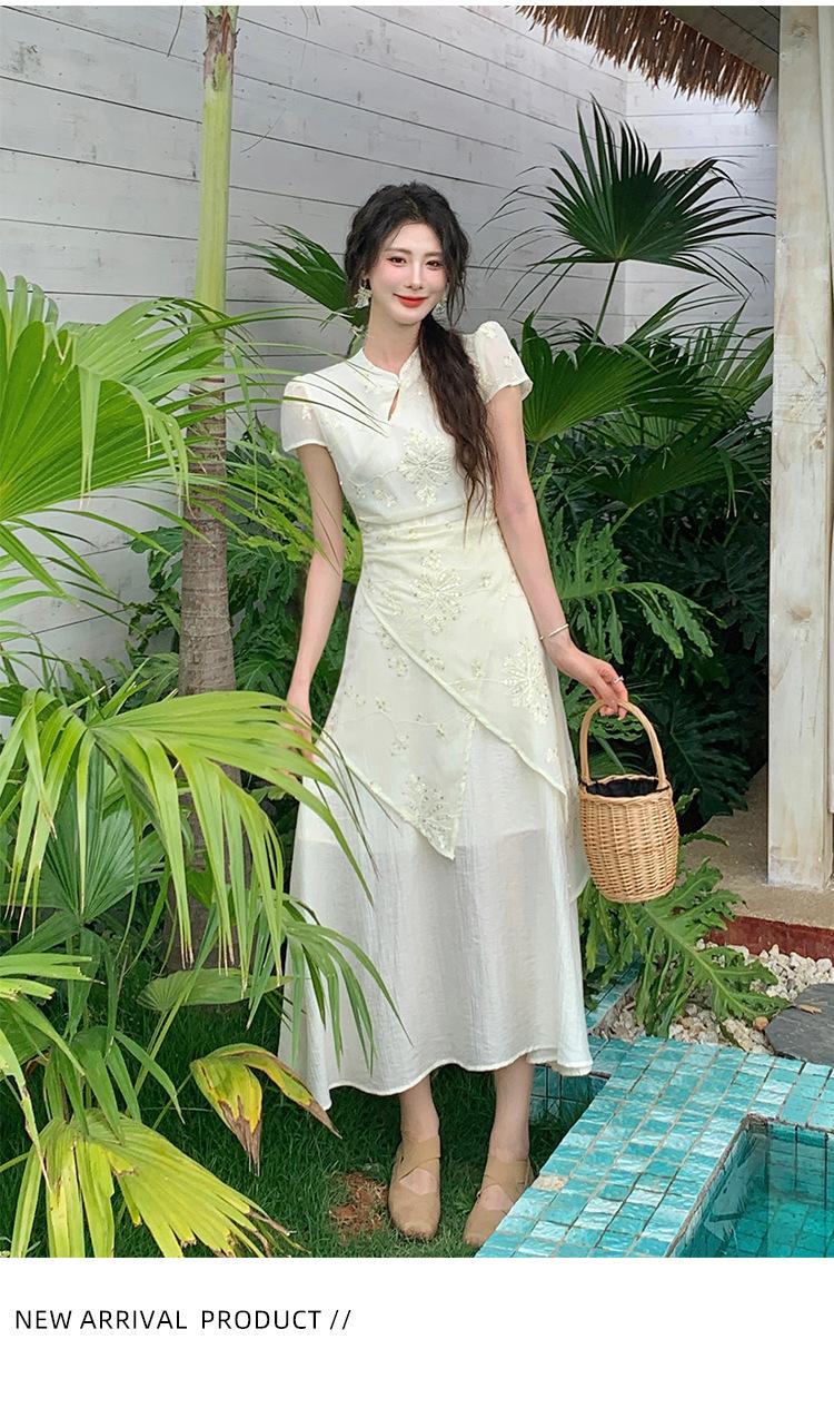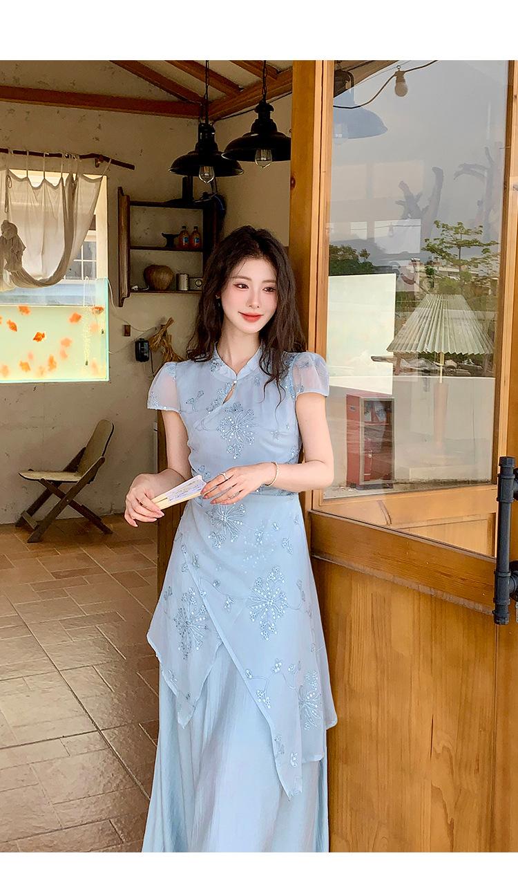 Verano Nuevo Estilo Chino Cuello Mao Asimétrico Falso Dos Piezas Cheongsam Mejorado