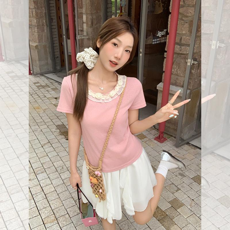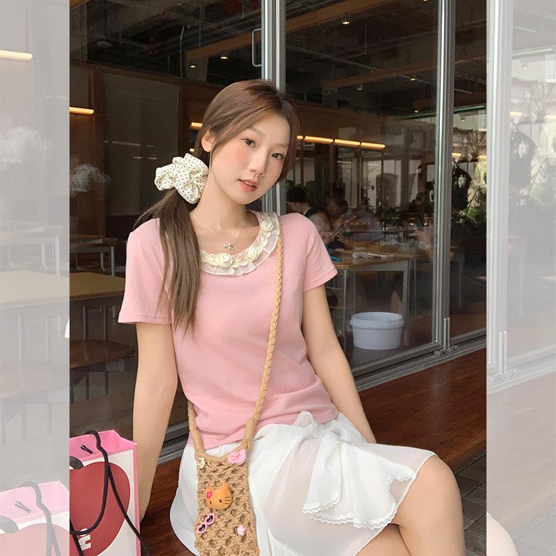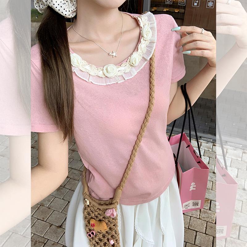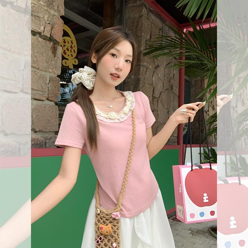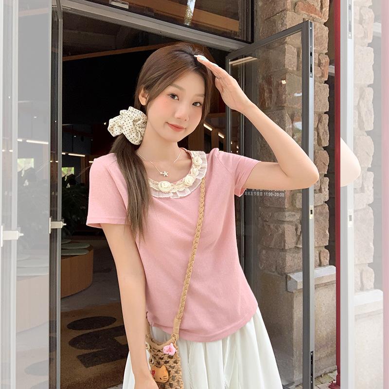 Camiseta de Manga Corta Rosa con Cuello de Encaje Francés para Mujer 2025 Verano Nuevo Diseño Estilo Coreano Top Versátil