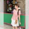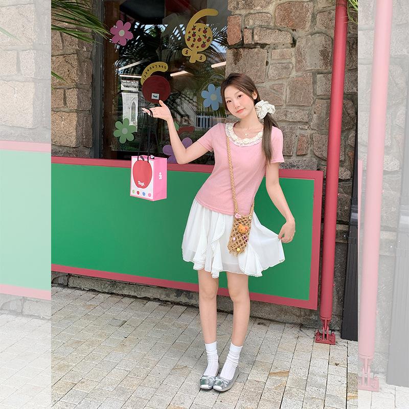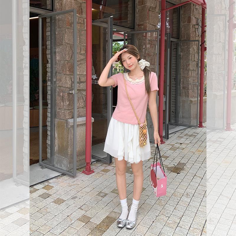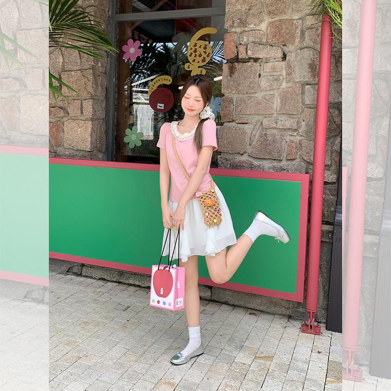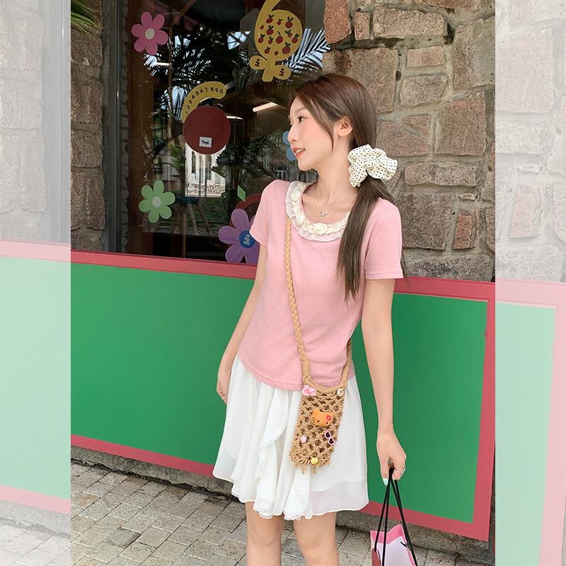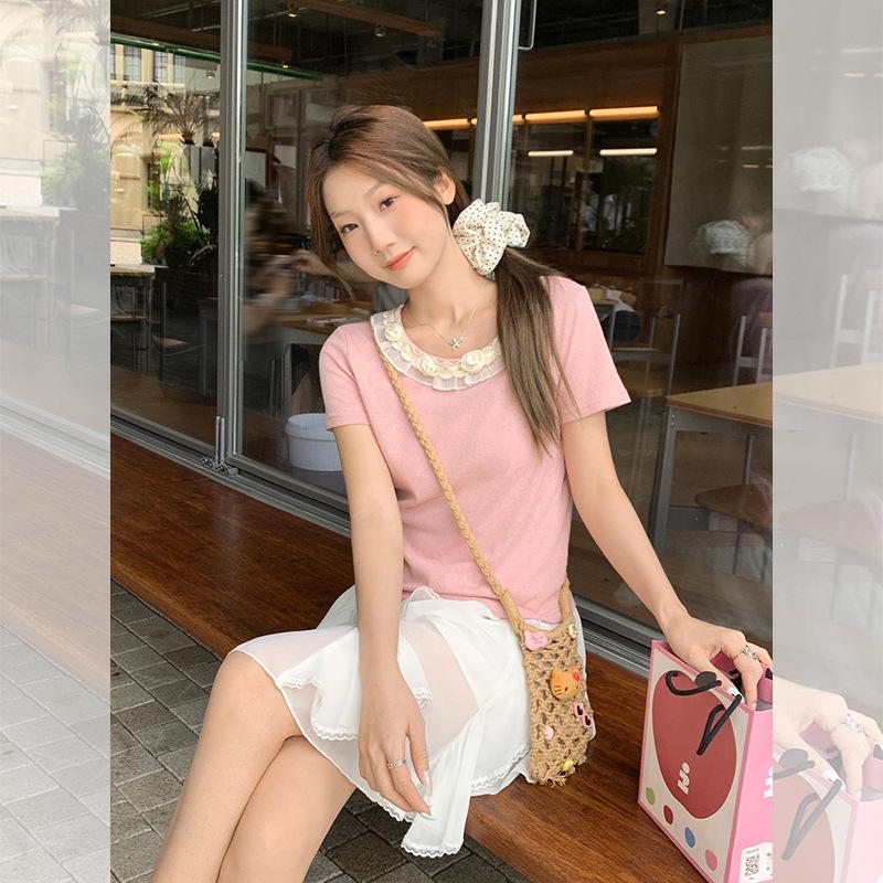 Camiseta de Manga Corta Rosa con Cuello de Encaje Francés para Mujer 2025 Verano Nuevo Diseño Estilo Coreano Top Versátil