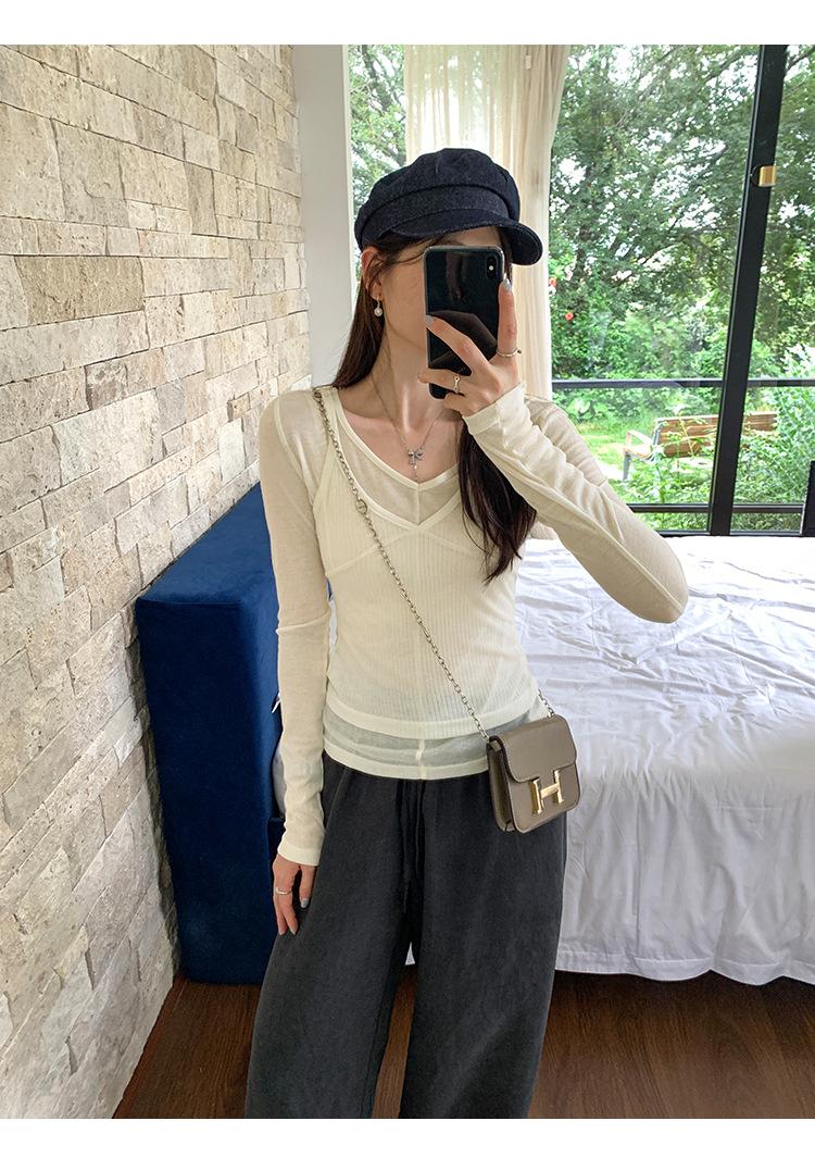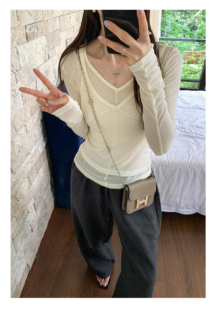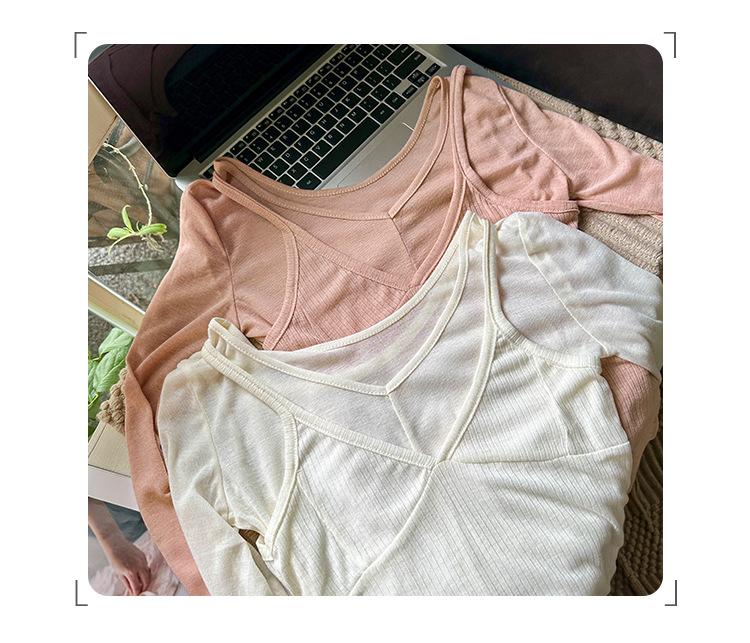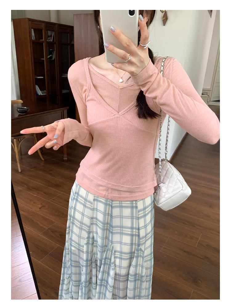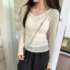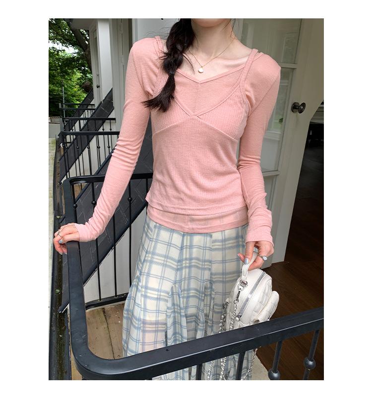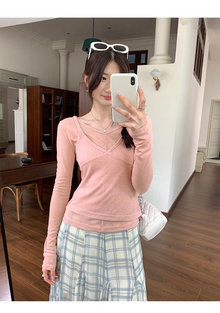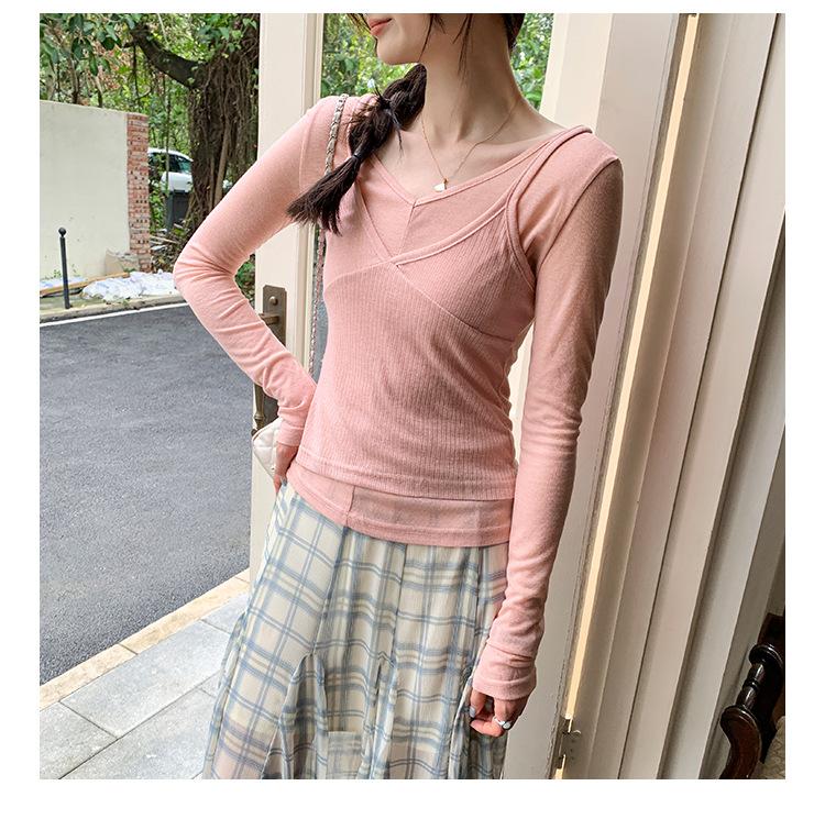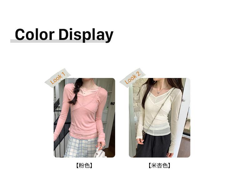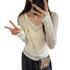 Rosa Francés Delgado Capa Exterior Chaleco Camiseta 2025 Nuevo Estilo Coreano Ajustado Cuello en V Manga Larga Top Set de Dos Piezas