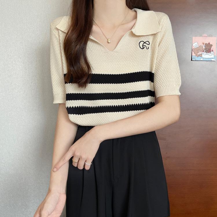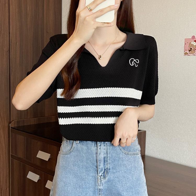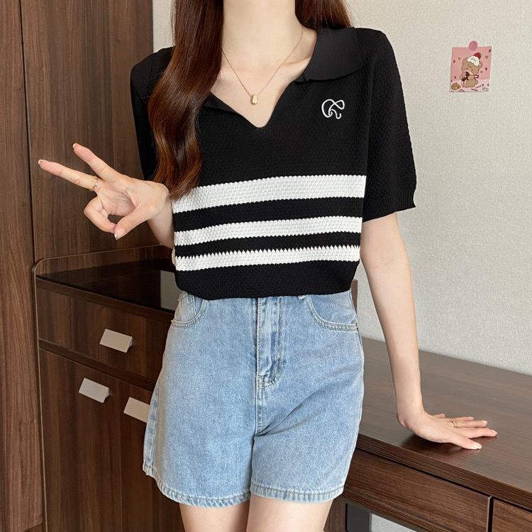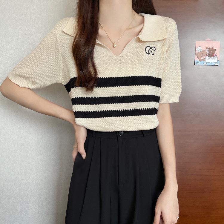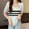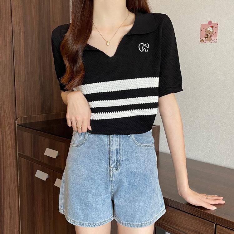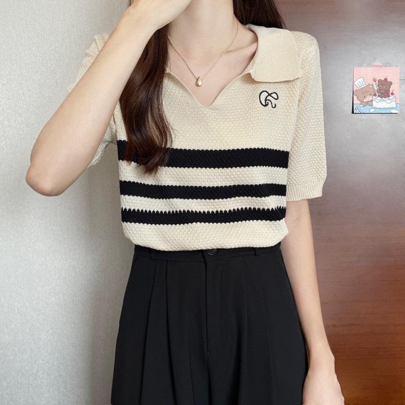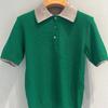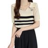 2025 Primavera y Verano Nuevo Top de Punto de Manga Corta con Solapa y Contraste de Color para Mujer, Ajuste Slim, Más Fácil de Combinar, Diseño Nicho