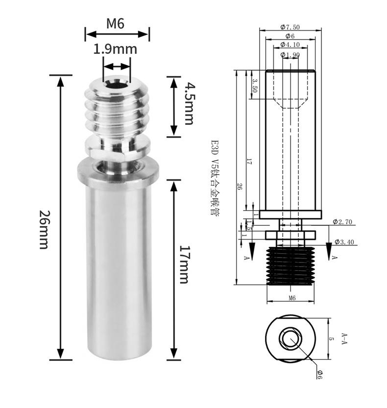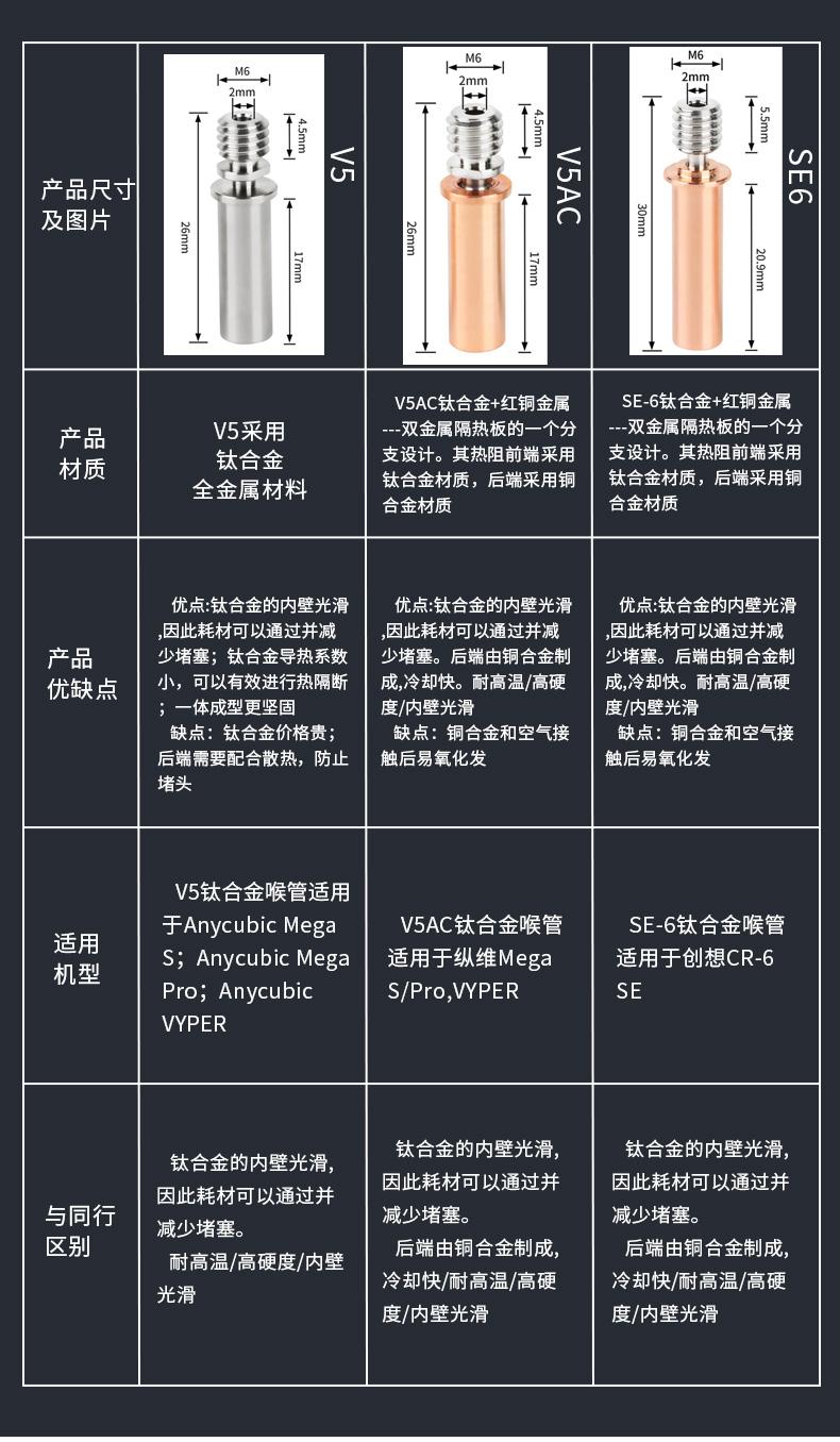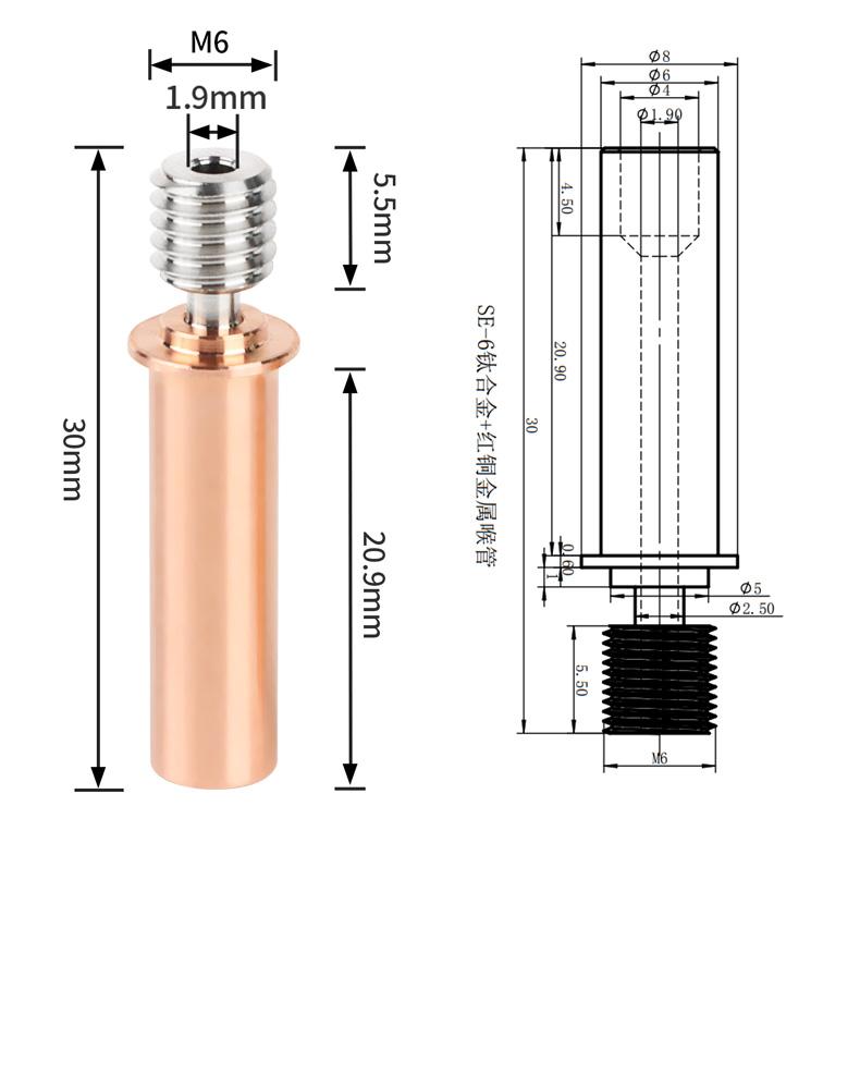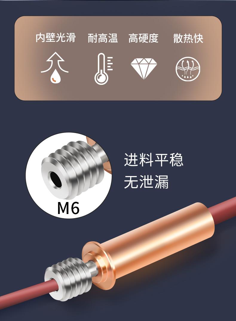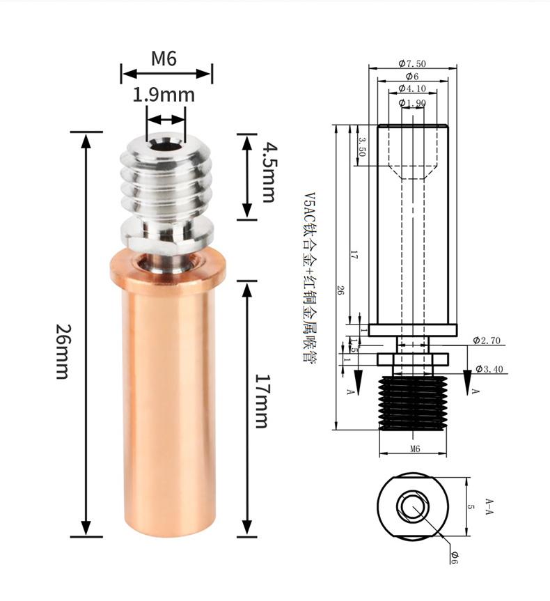 Accesorios para impresora 3D V5AC garganta bimetálica de aleación de titanio cobre rojo resistencia a altas temperaturas alta dureza rosca M6 1.75mm