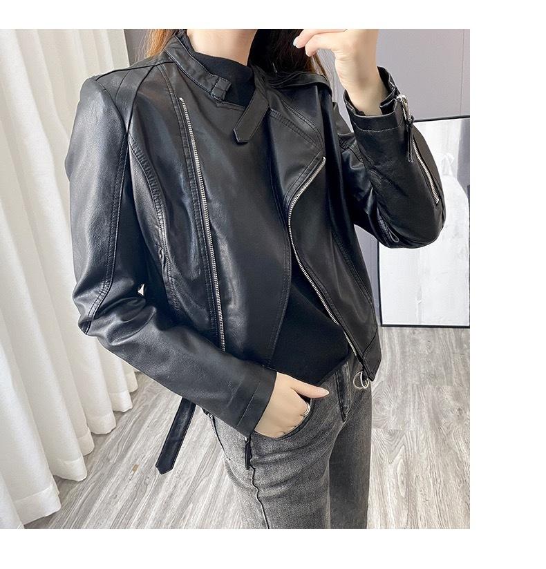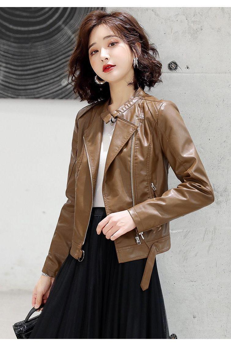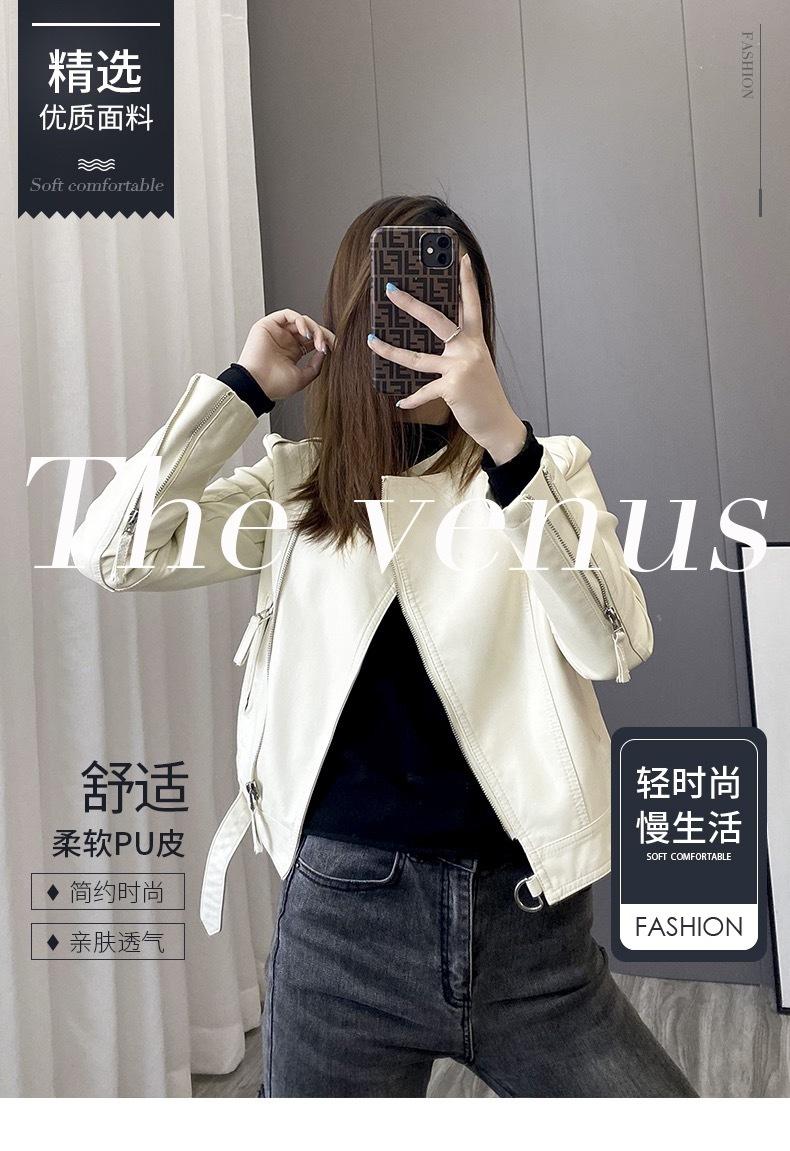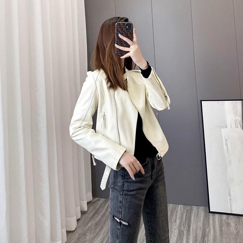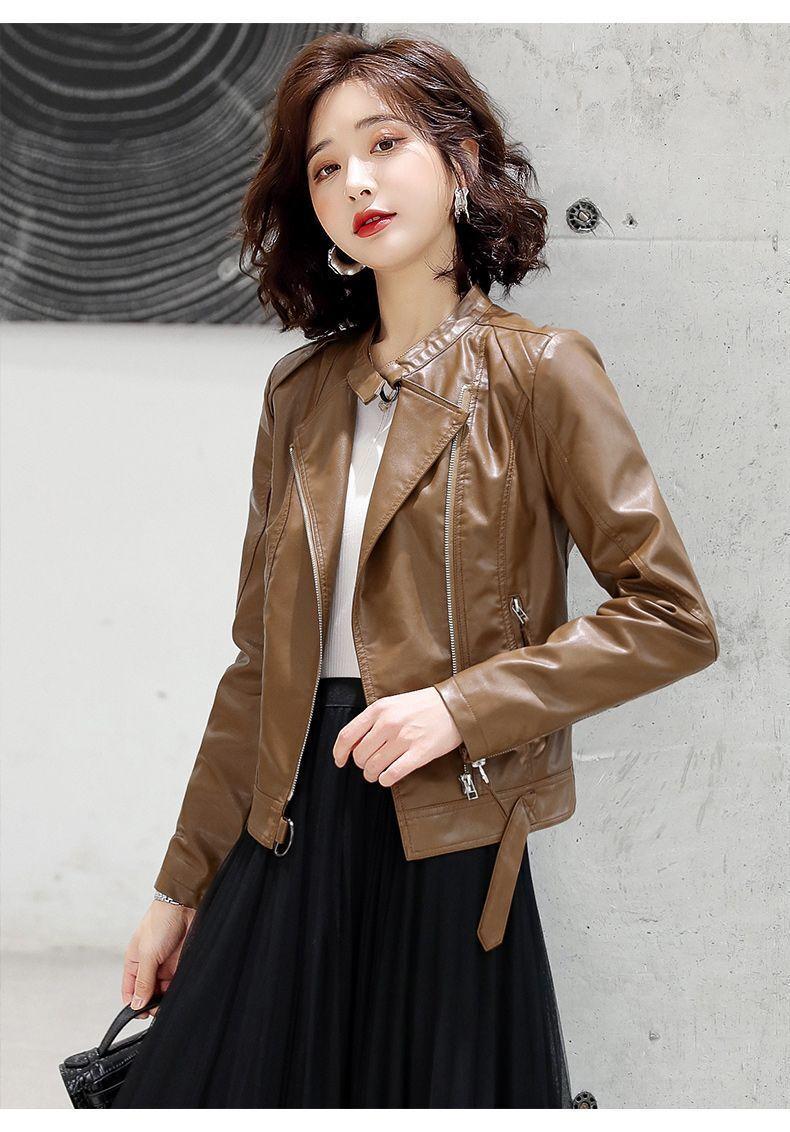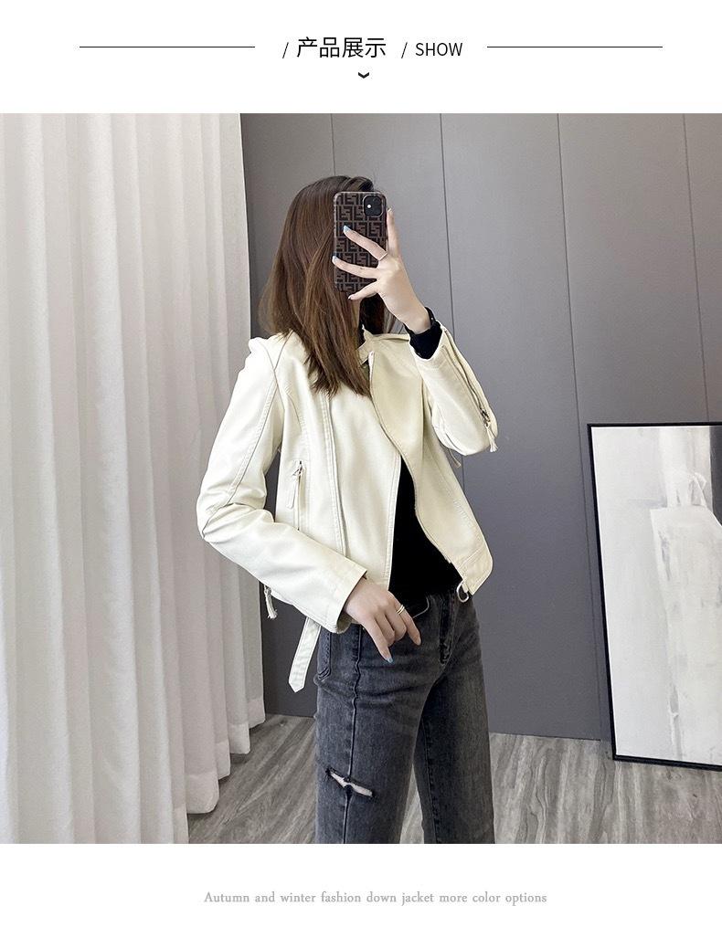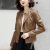 2024 Nueva Llegada Ropa de Cuero para Mujer Otoño Cinturón Chaqueta Corta Estilo Coreano Motocicleta Chaqueta de Cuero PU Adelgazante Combinable Beige