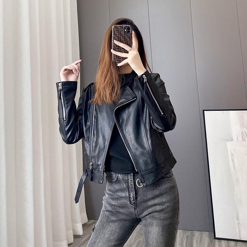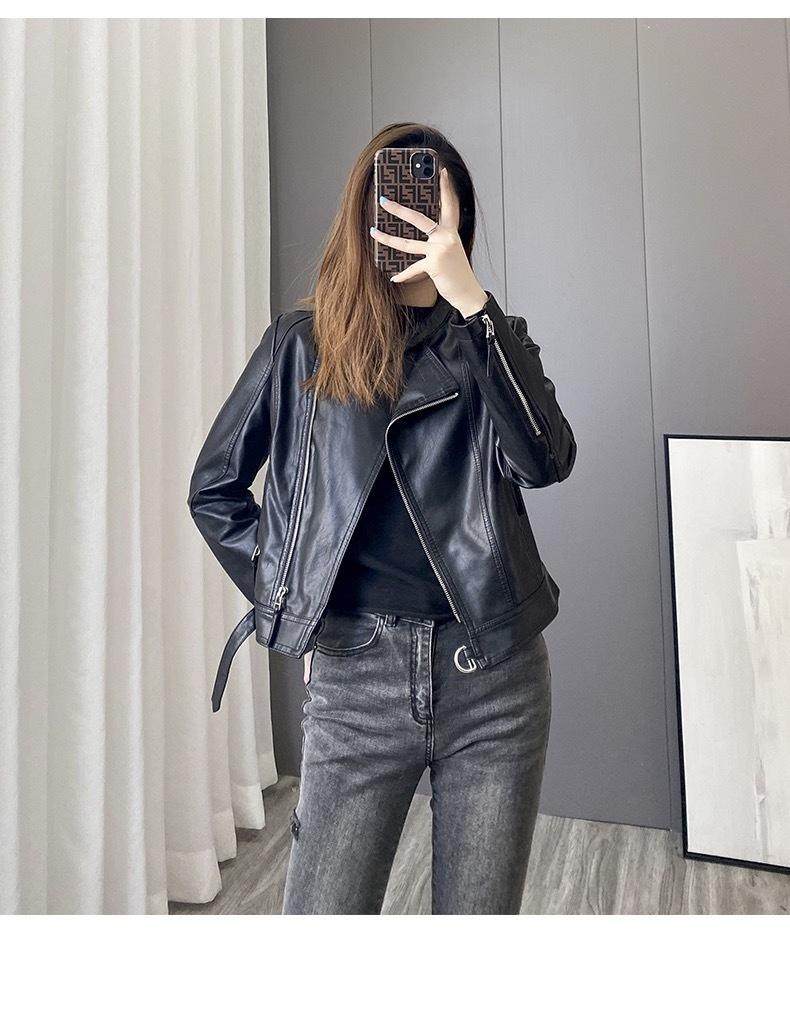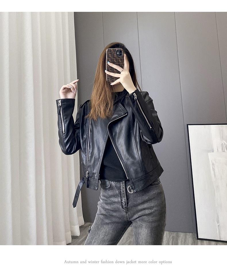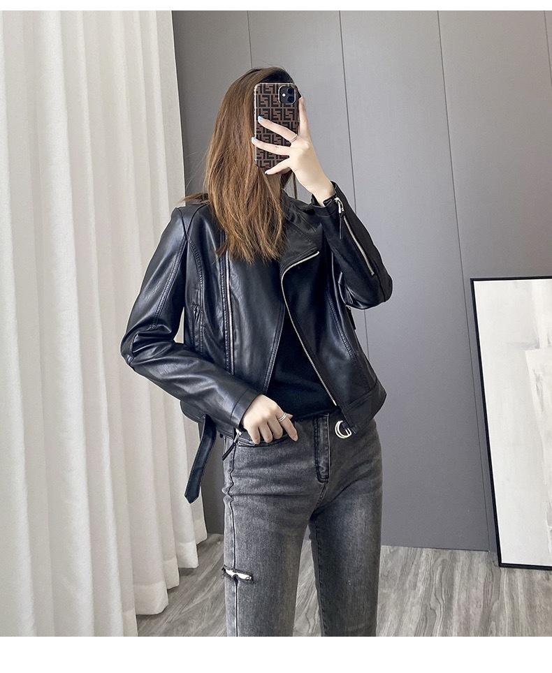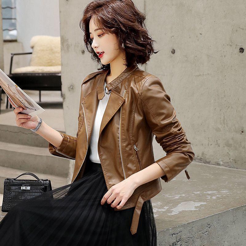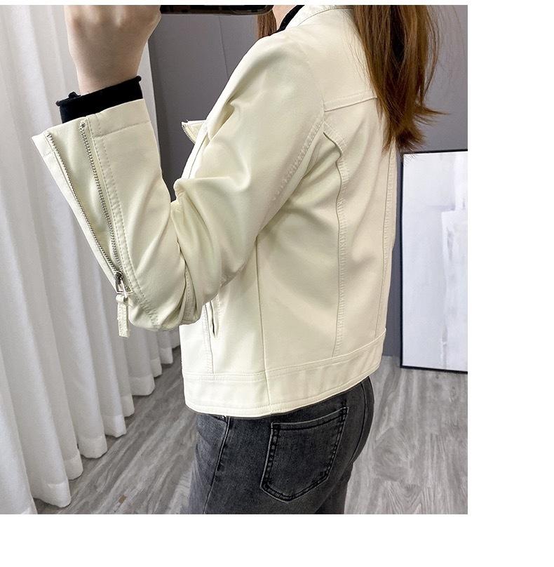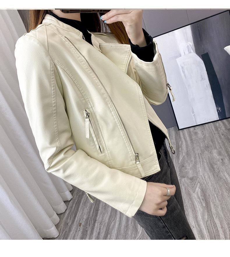 2024 Nueva Llegada Ropa de Cuero para Mujer Otoño Cinturón Chaqueta Corta Estilo Coreano Motocicleta Chaqueta de Cuero PU Adelgazante Combinable Beige