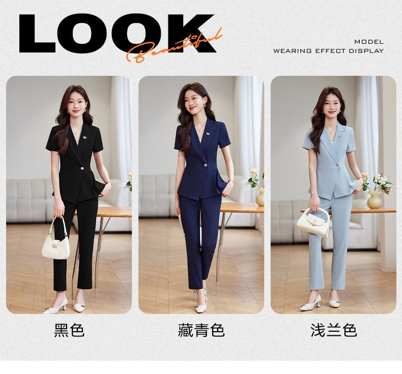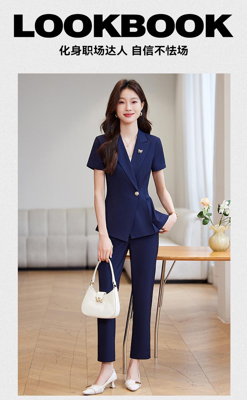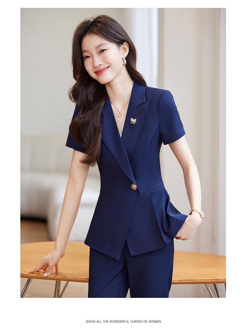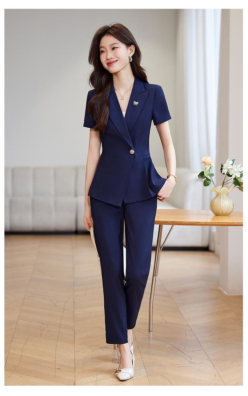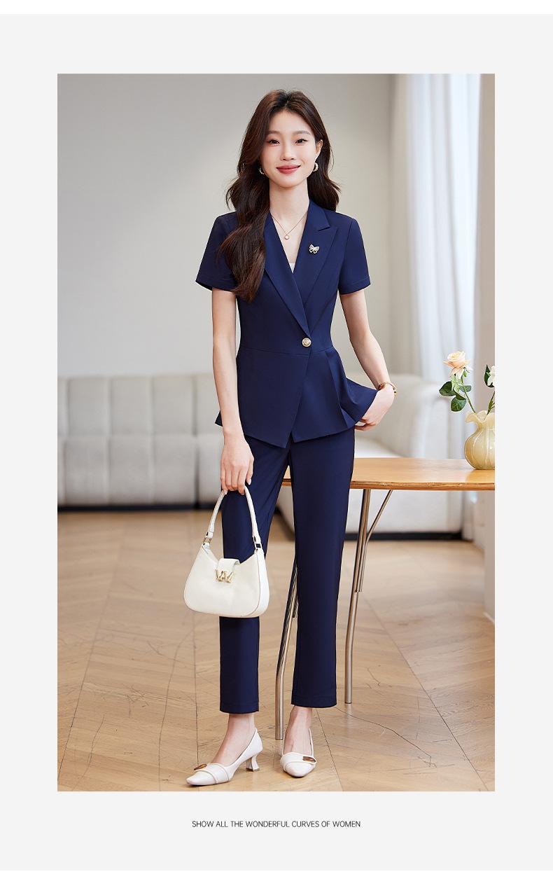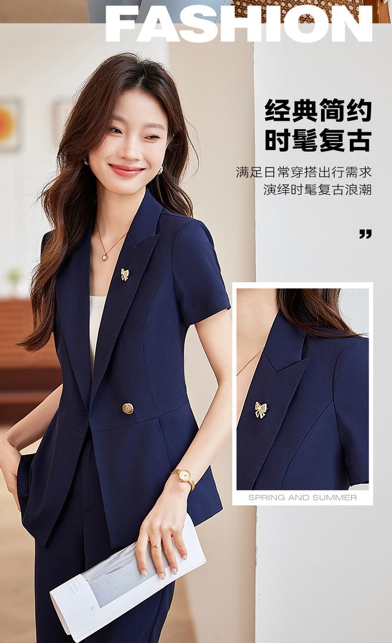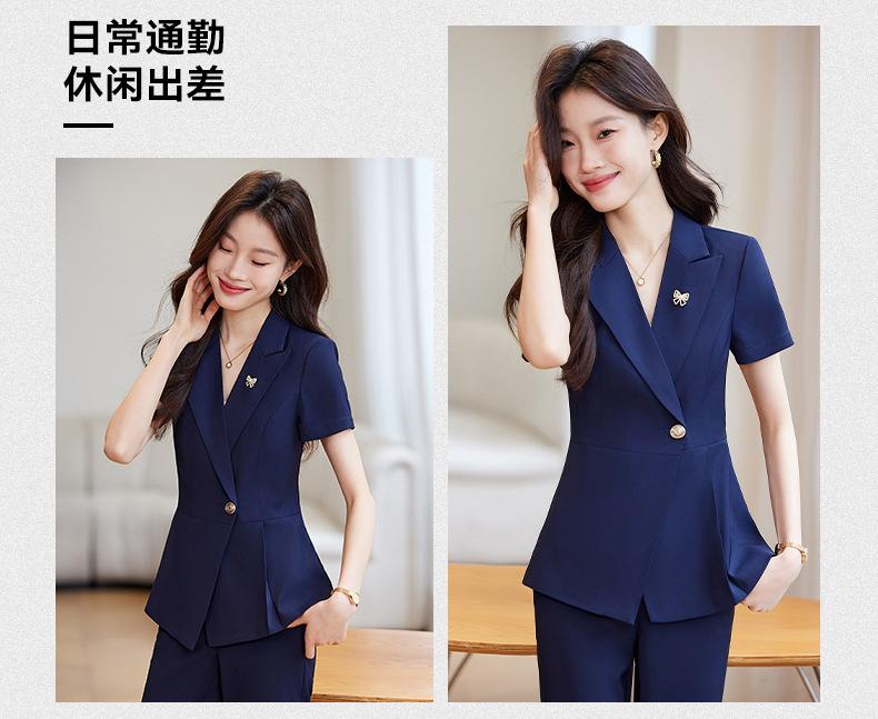 Traje corto de verano de manga corta con cuello tipo sastre para mujer, pantalones de verano profesionales azul marino, traje de dos piezas 2025 nueva moda