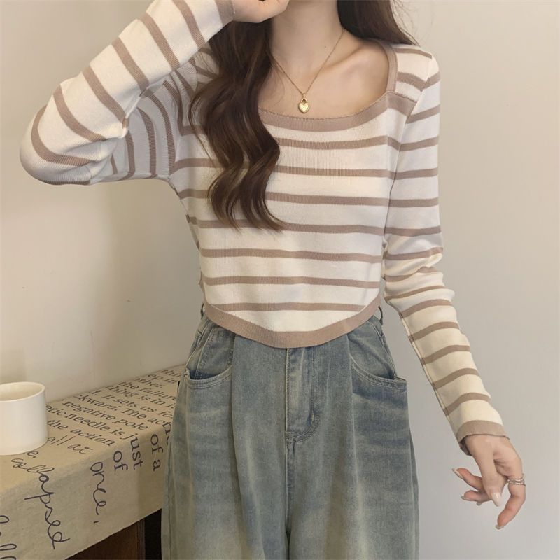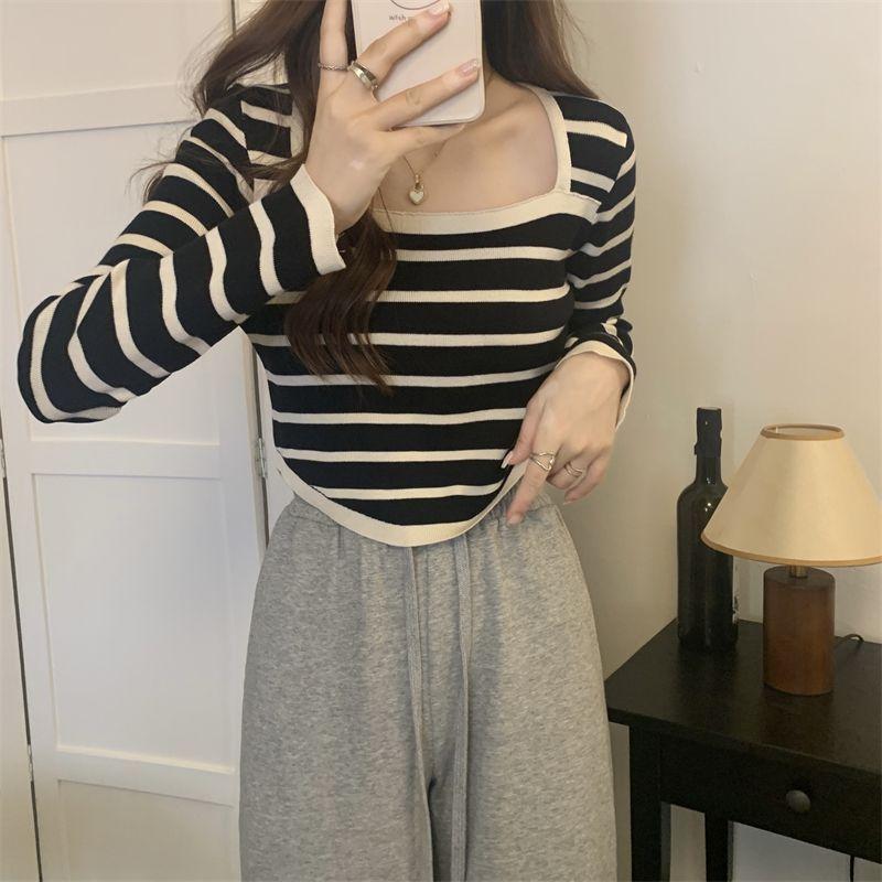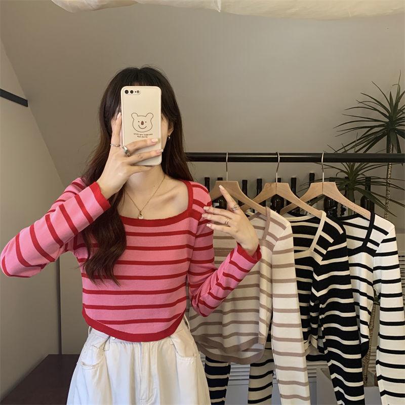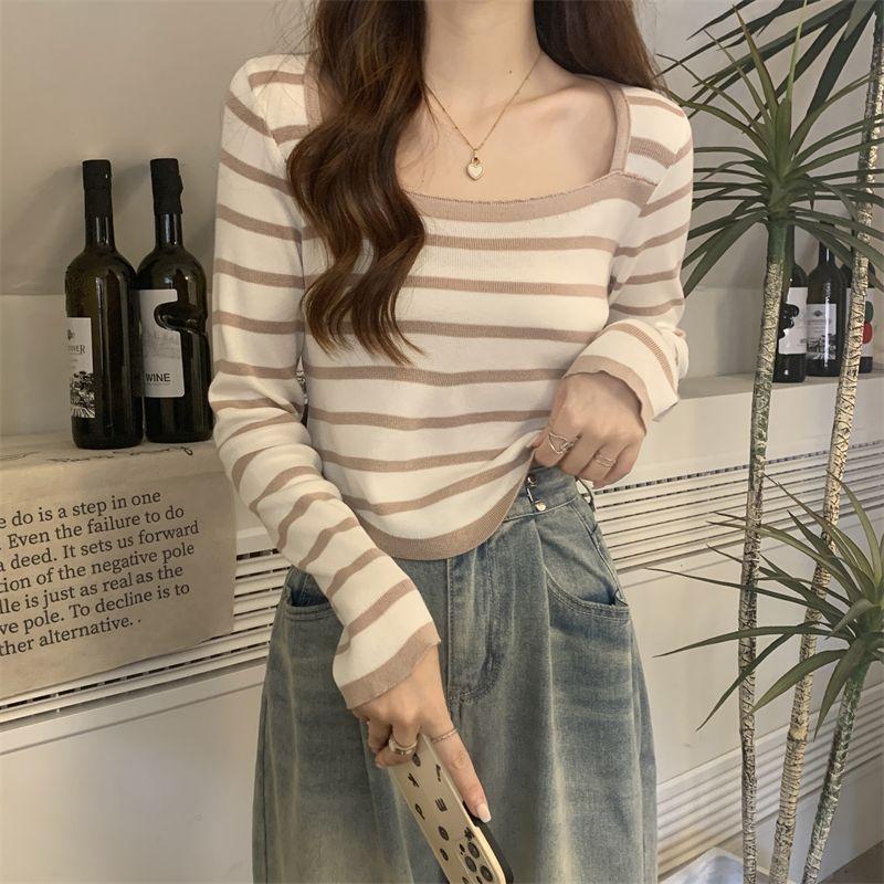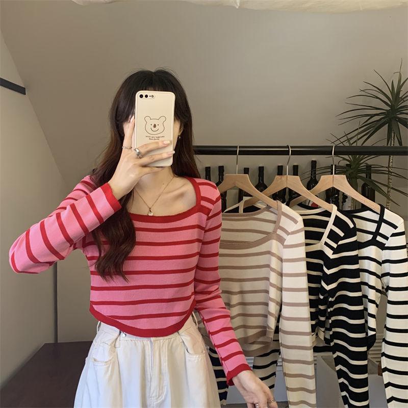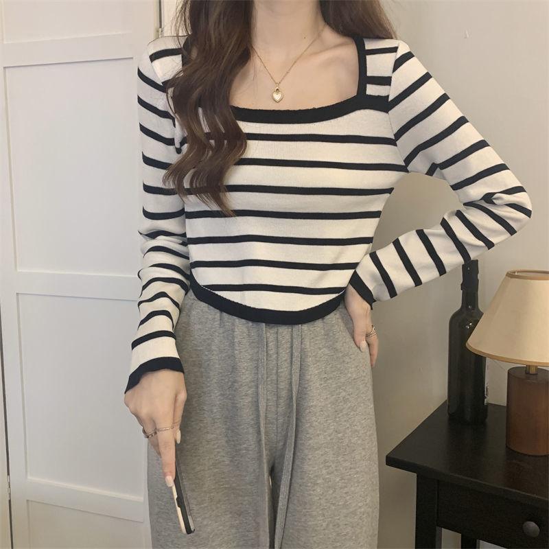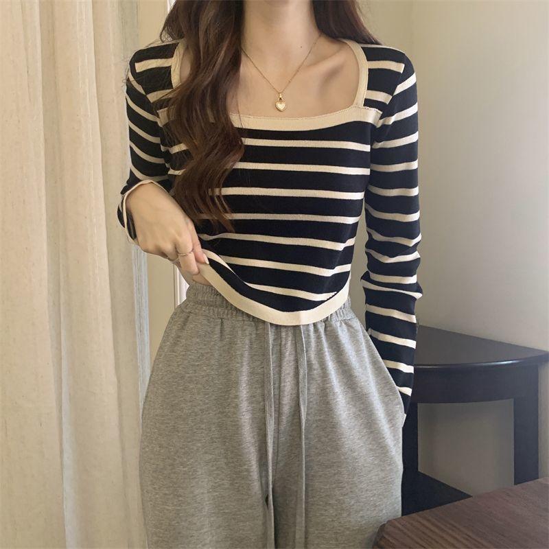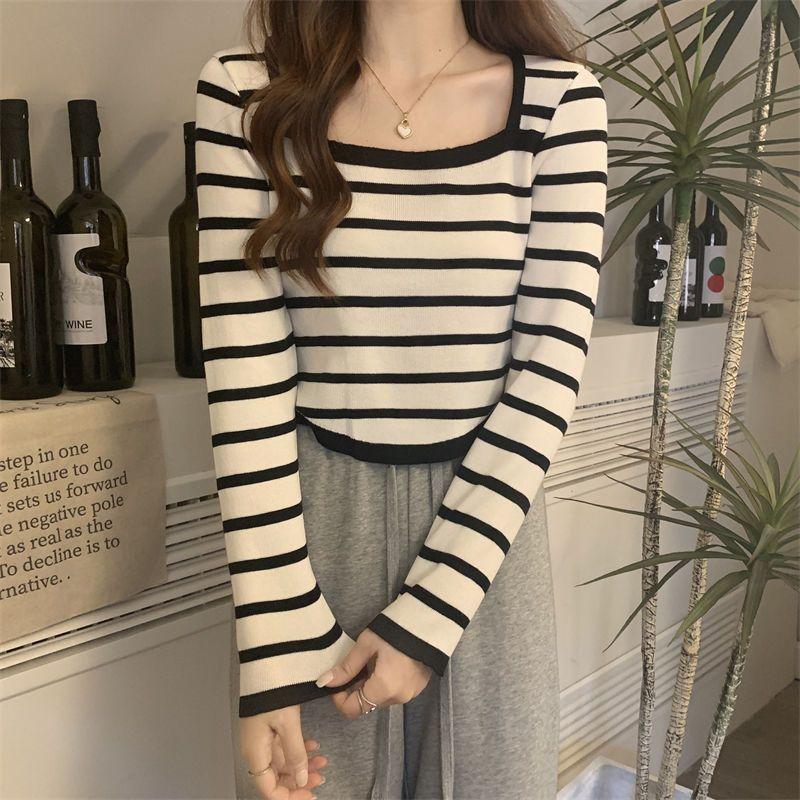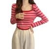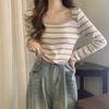 Elegante Camiseta Base de Manga Larga a Rayas con Cuello Cuadrado Adelgazante Estilo Francés para Mujer, Nuevo Estilo de Principios de Otoño, Suéter, Camiseta, Top de Moda