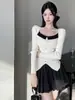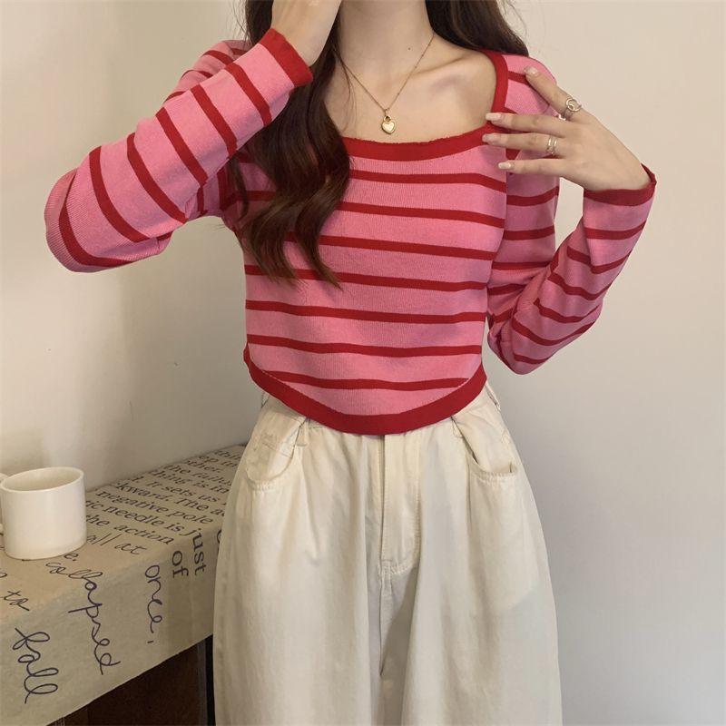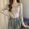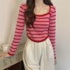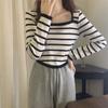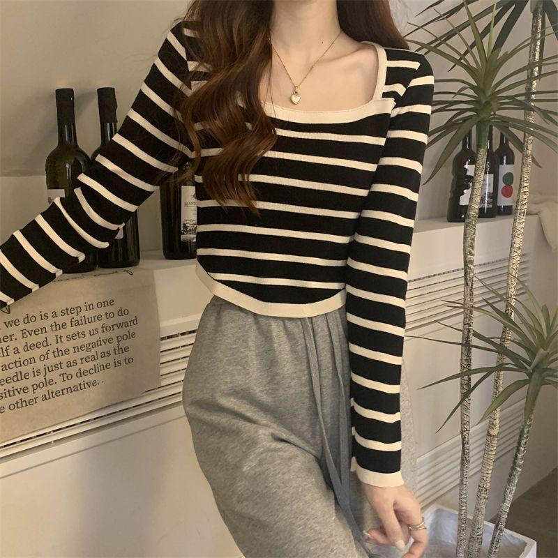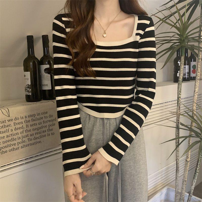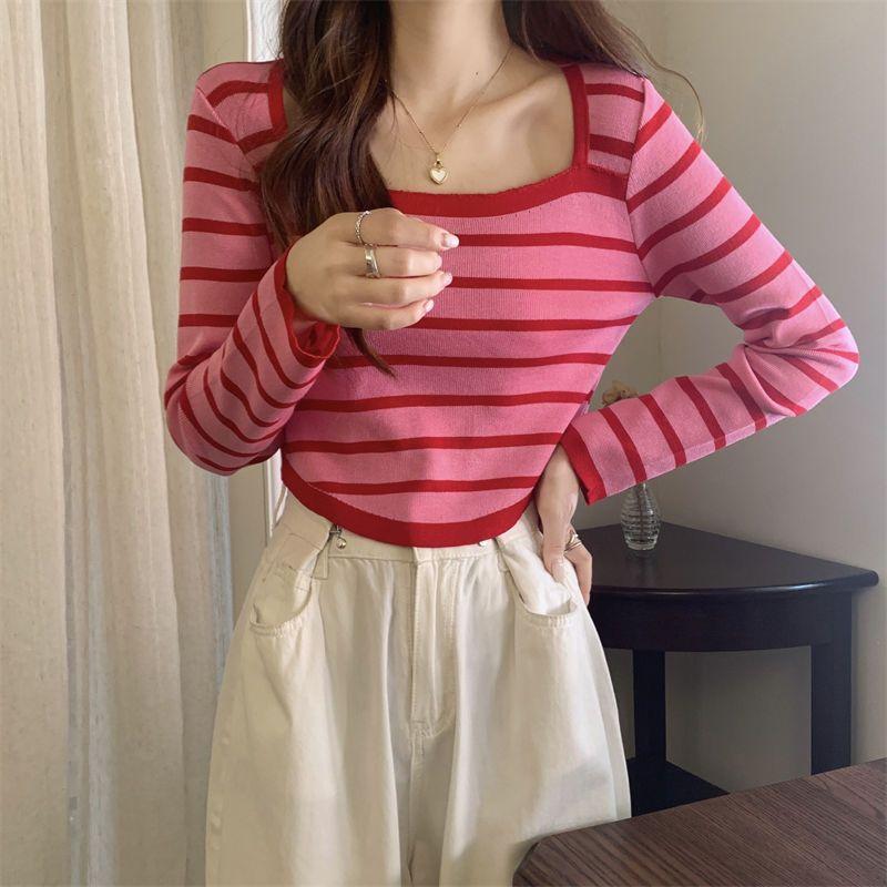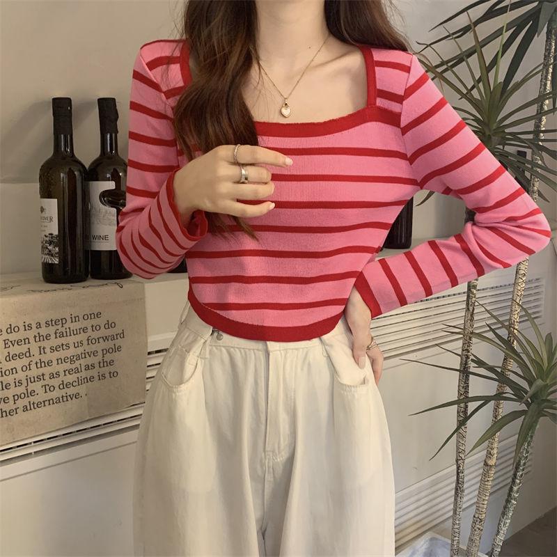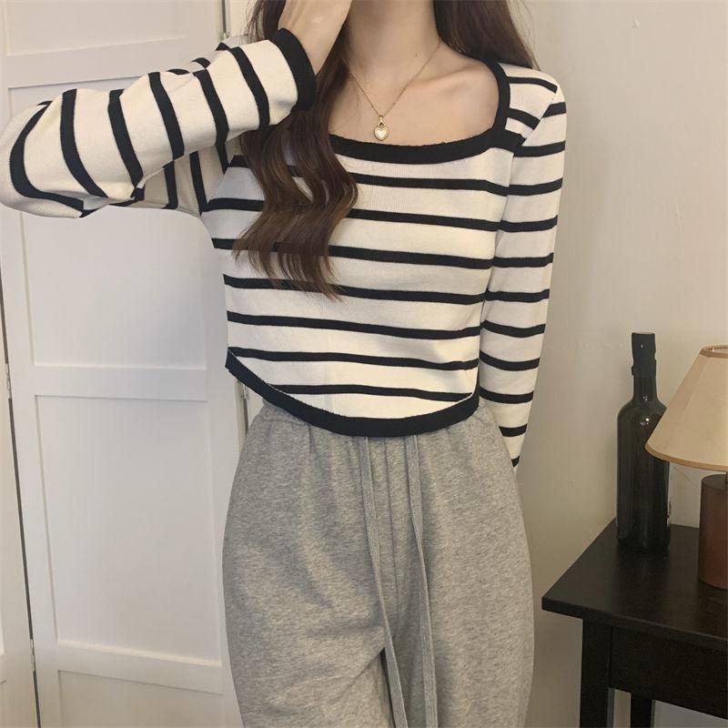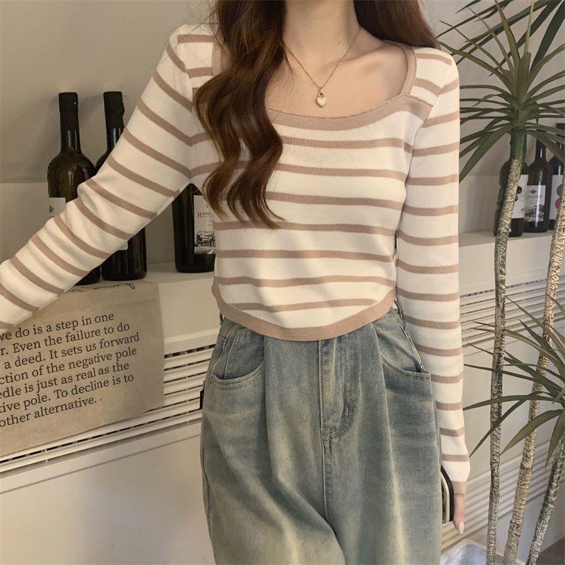 Elegante Camiseta Base de Manga Larga a Rayas con Cuello Cuadrado Adelgazante Estilo Francés para Mujer, Nuevo Estilo de Principios de Otoño, Suéter, Camiseta, Top de Moda