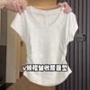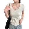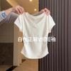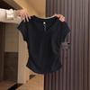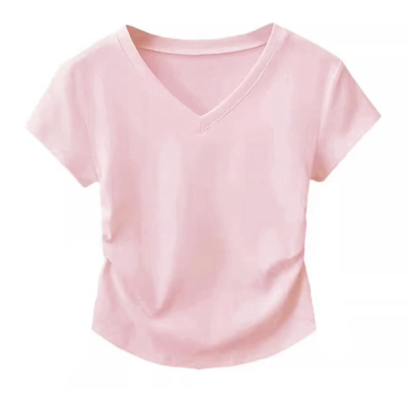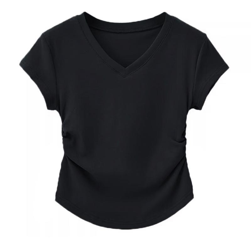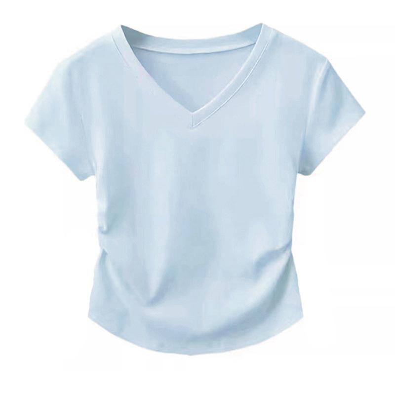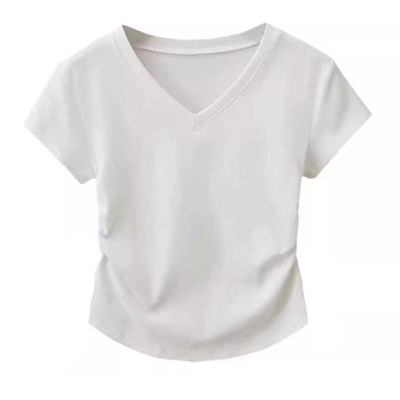 Playera de Algodón Puro con Cuello en V de Hombro Derecho y Manga Corta para Mujer Verano Look Adelgazante Diseño Plisado Top Corto Estilo Nuevo de Moda 2025