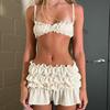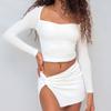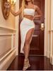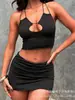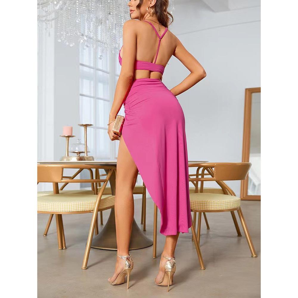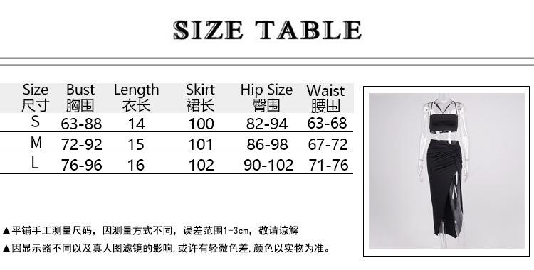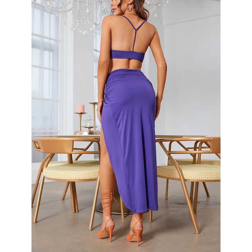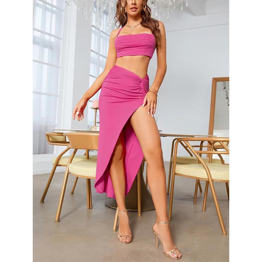 2025 Verano Ropa de Mujer Transfronteriza Europea y Americana Plisada Sexy con Ombligo Descubierto Tirantes Color Sólido Falda Larga con Abertura Alta Traje de Dos Piezas
