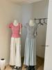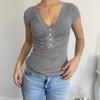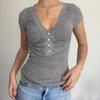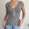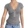 Moda Europea y Americana Deseo Puro Chica Picante Cuello en V Abotonadura Sencilla Ajustada Manga Corta Camiseta con Diseño Único y Ajuste Versátil