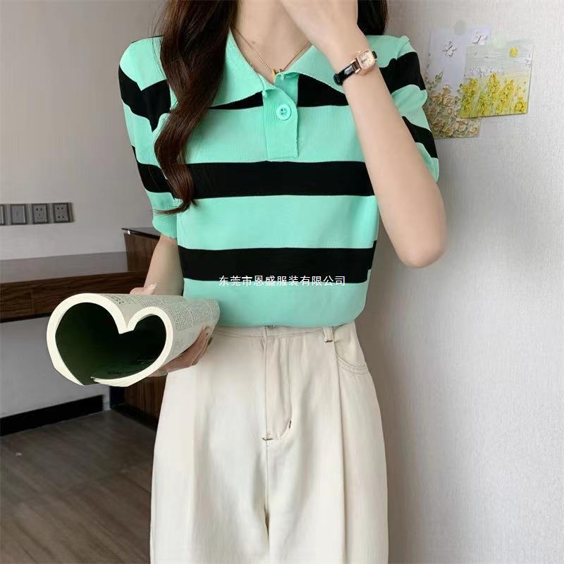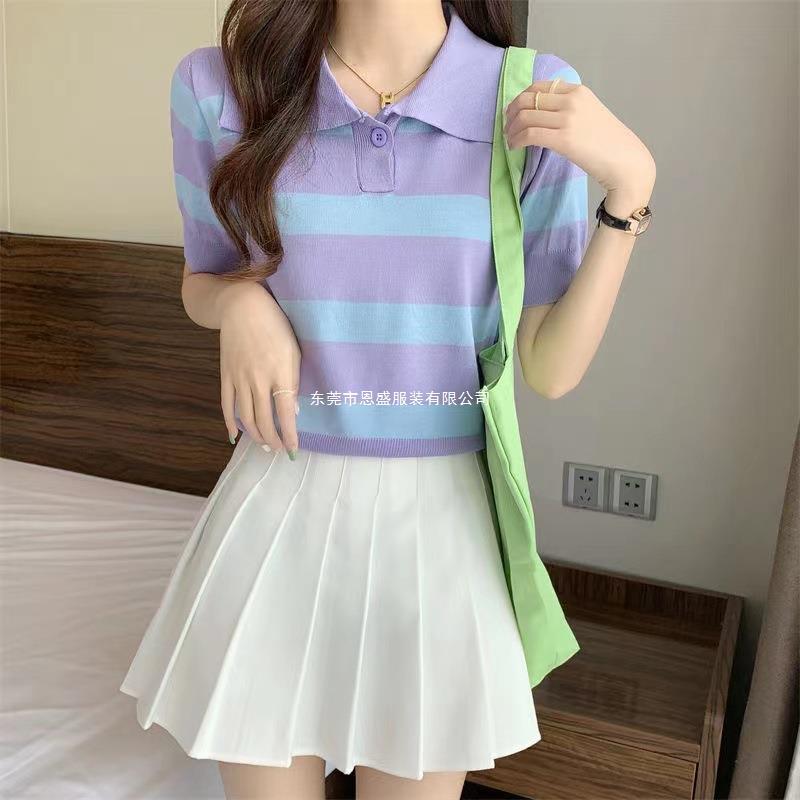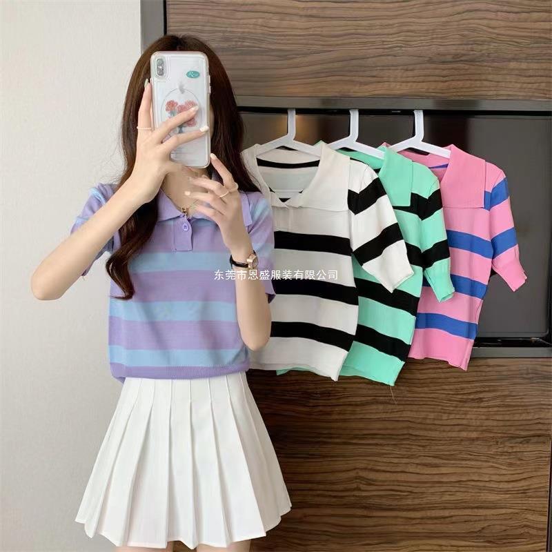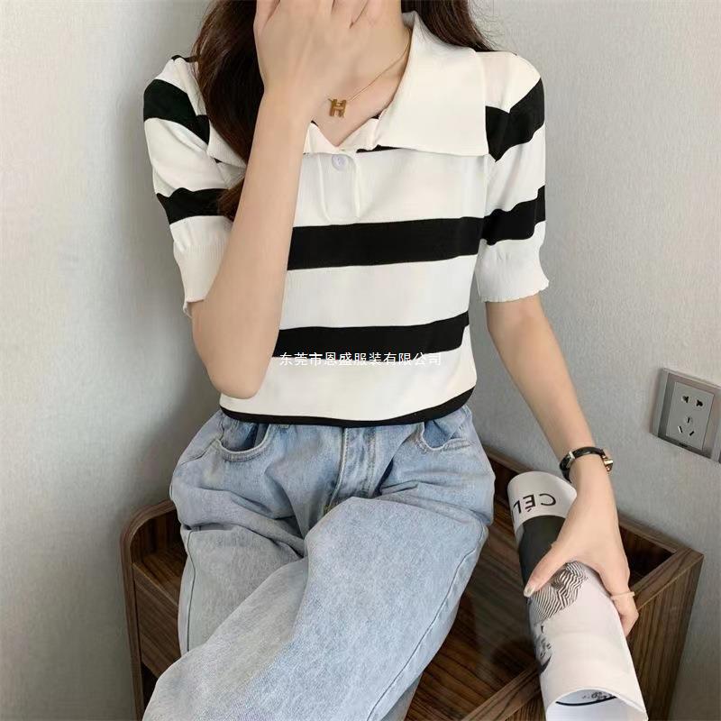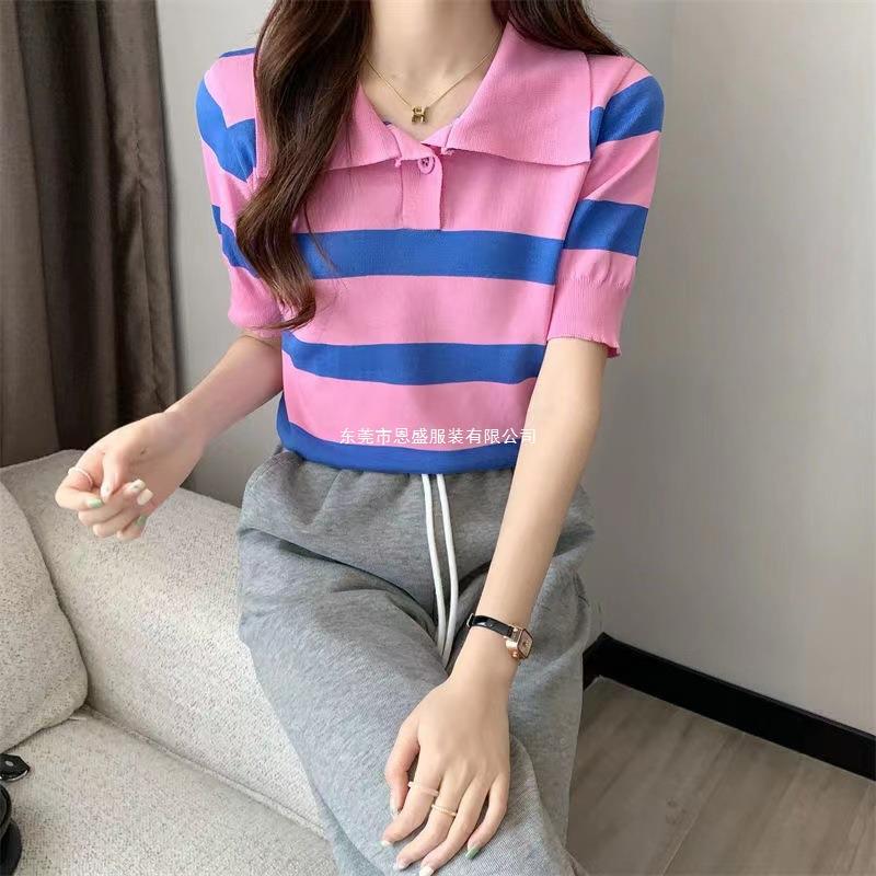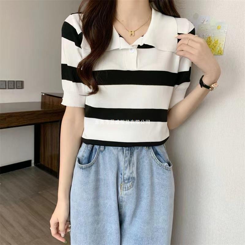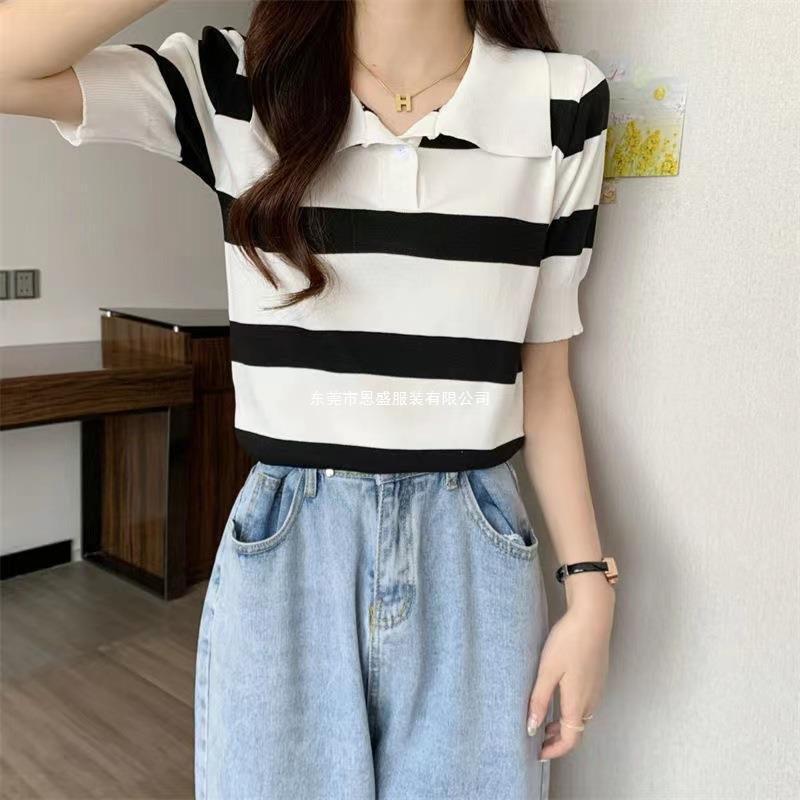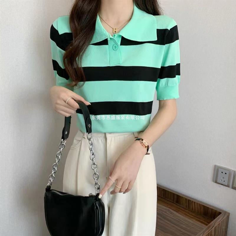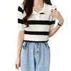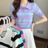 Camiseta Holgada Estilo Coreano con Cuello Polo Verano Delgada a Rayas Combinación de Colores Lel Tejido de Seda de Hielo Manga Corta Top Corto para Mujer
