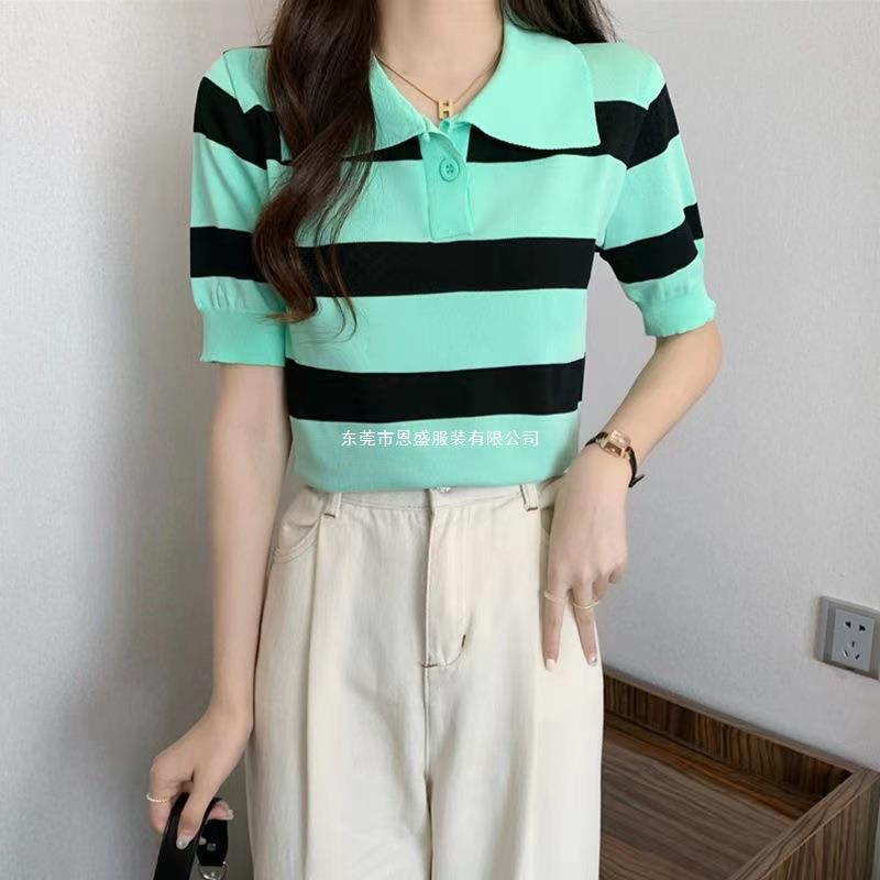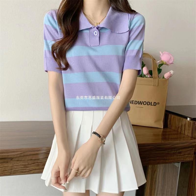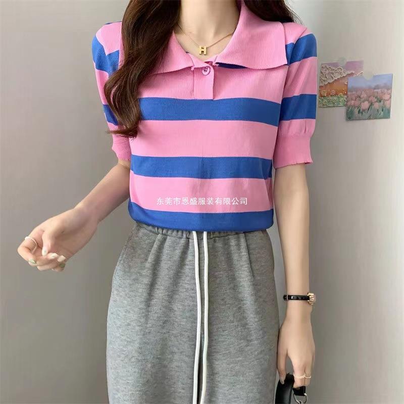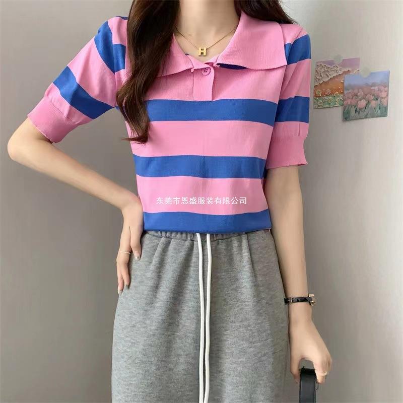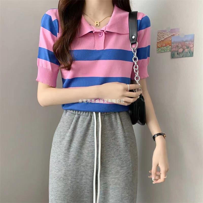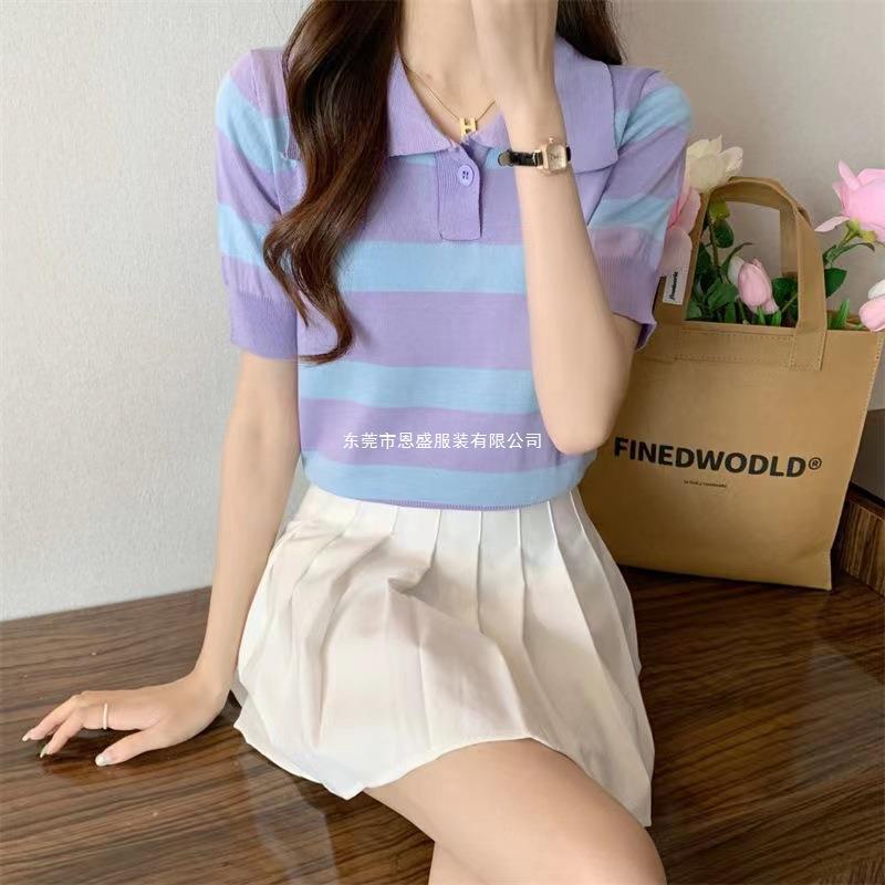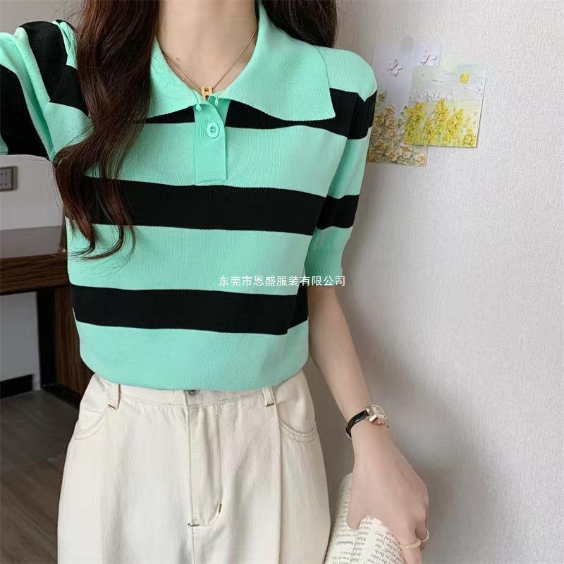 Camiseta Holgada Estilo Coreano con Cuello Polo Verano Delgada a Rayas Combinación de Colores Lel Tejido de Seda de Hielo Manga Corta Top Corto para Mujer
