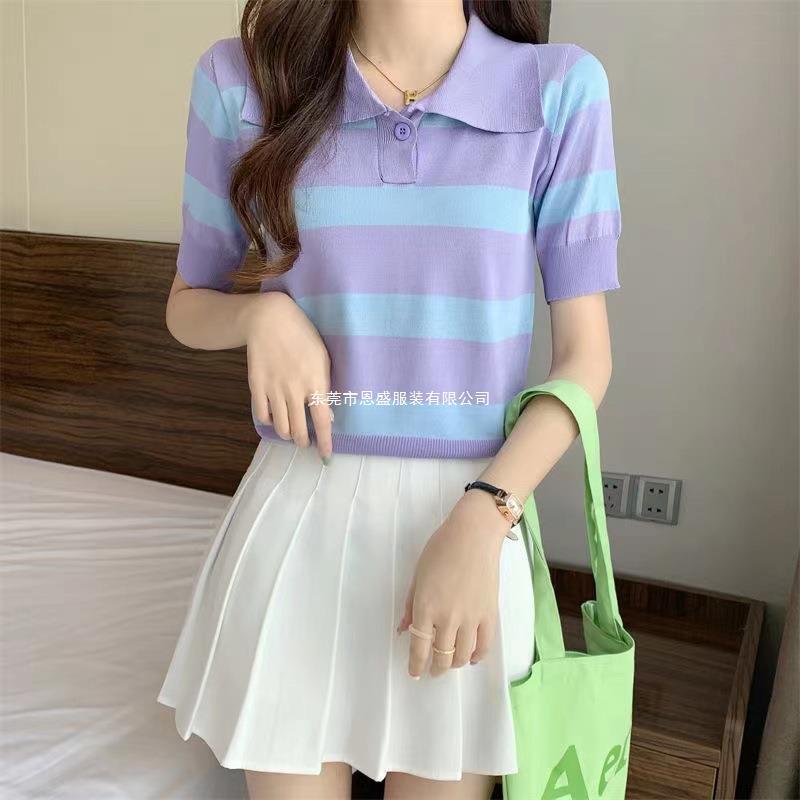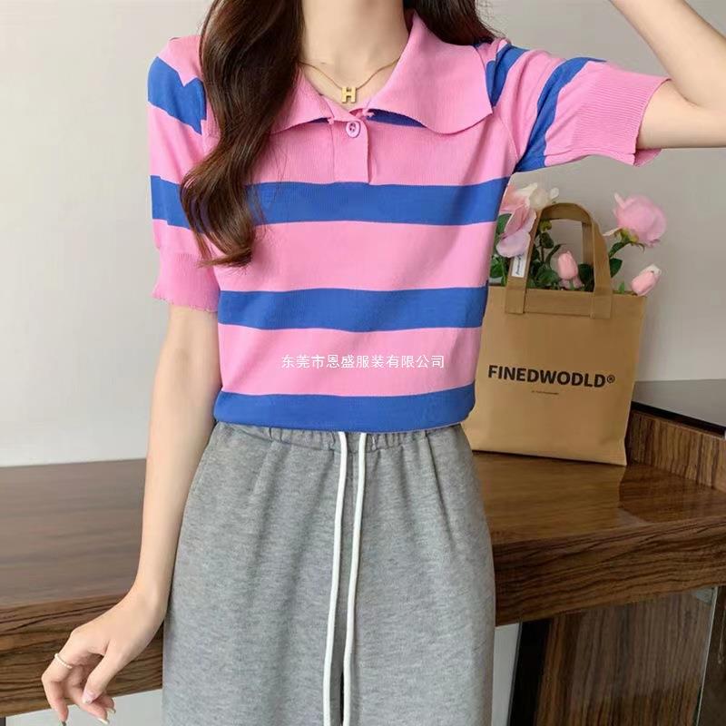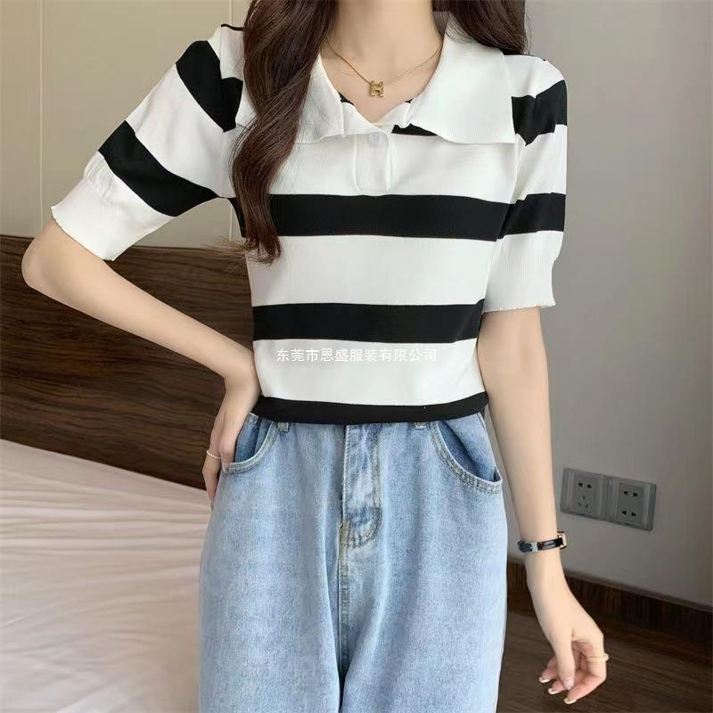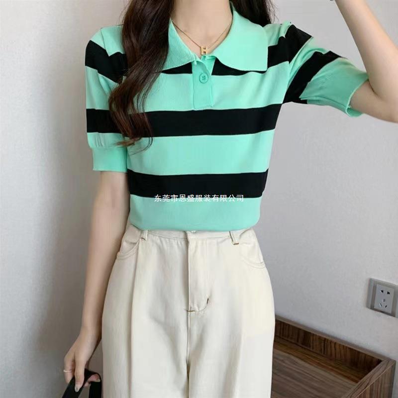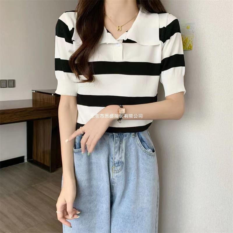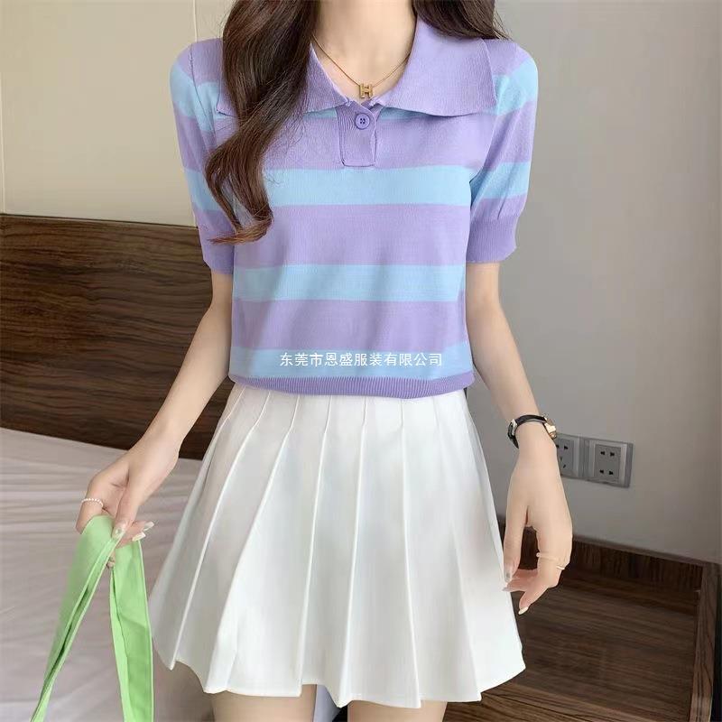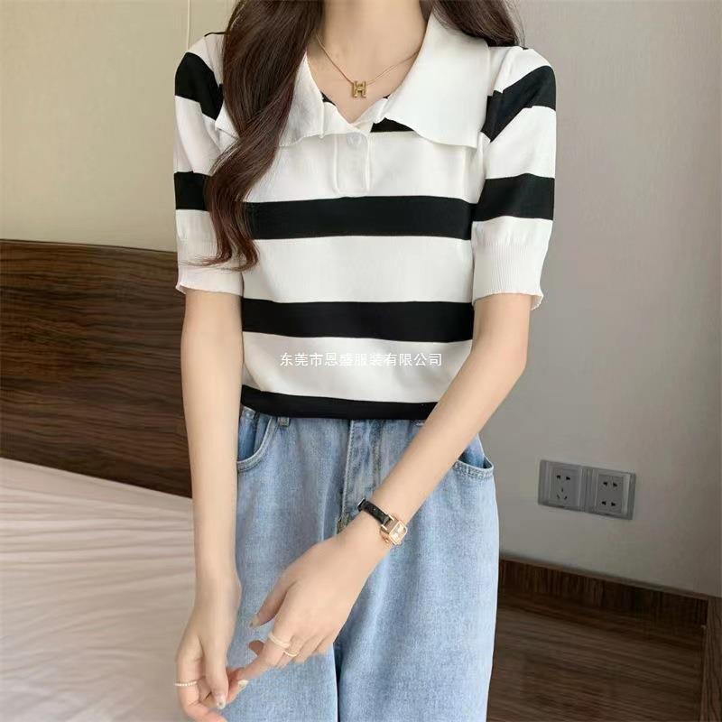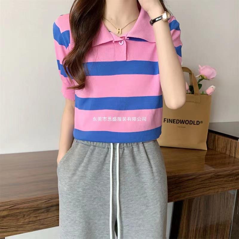 Camiseta Holgada Estilo Coreano con Cuello Polo Verano Delgada a Rayas Combinación de Colores Lel Tejido de Seda de Hielo Manga Corta Top Corto para Mujer