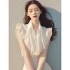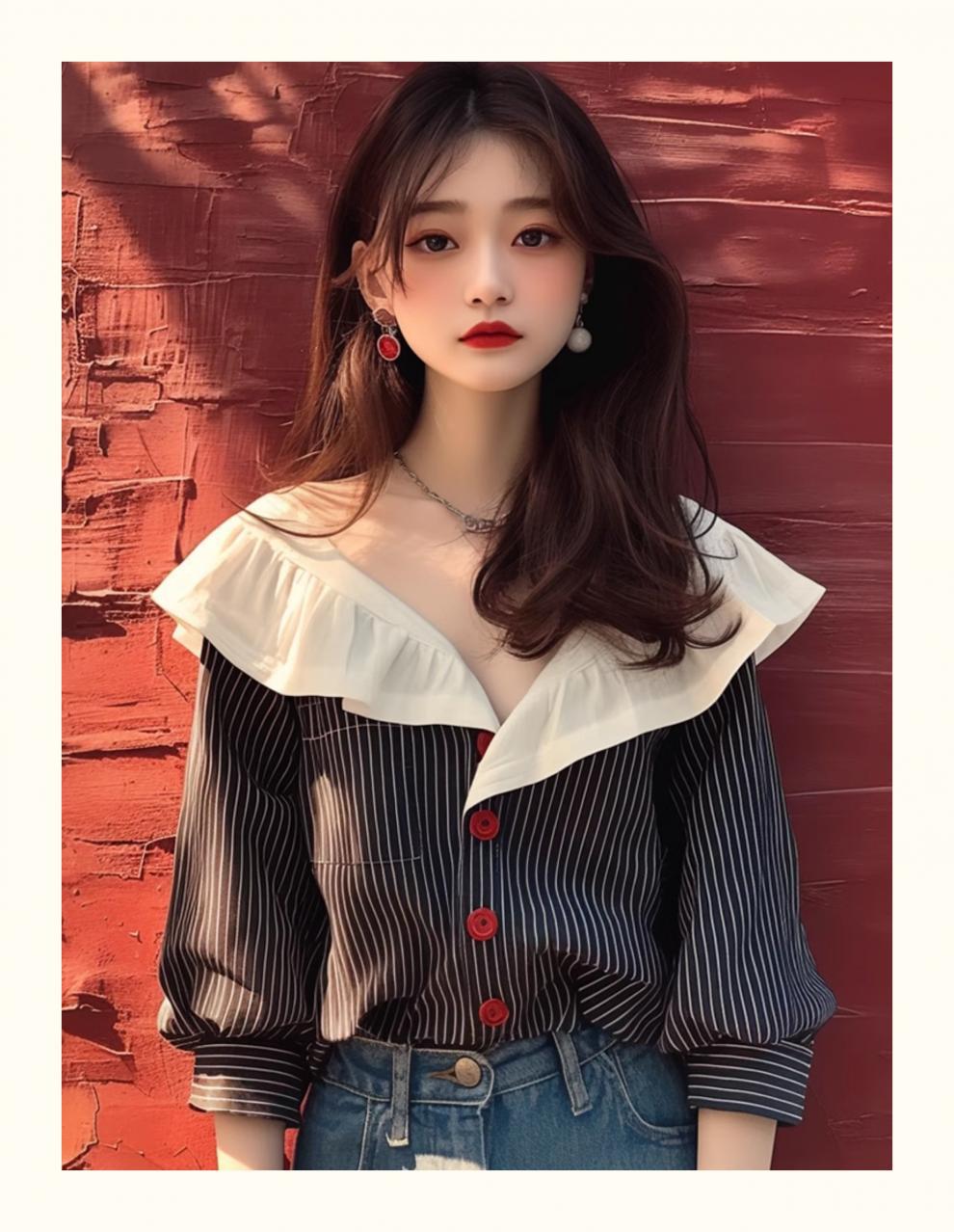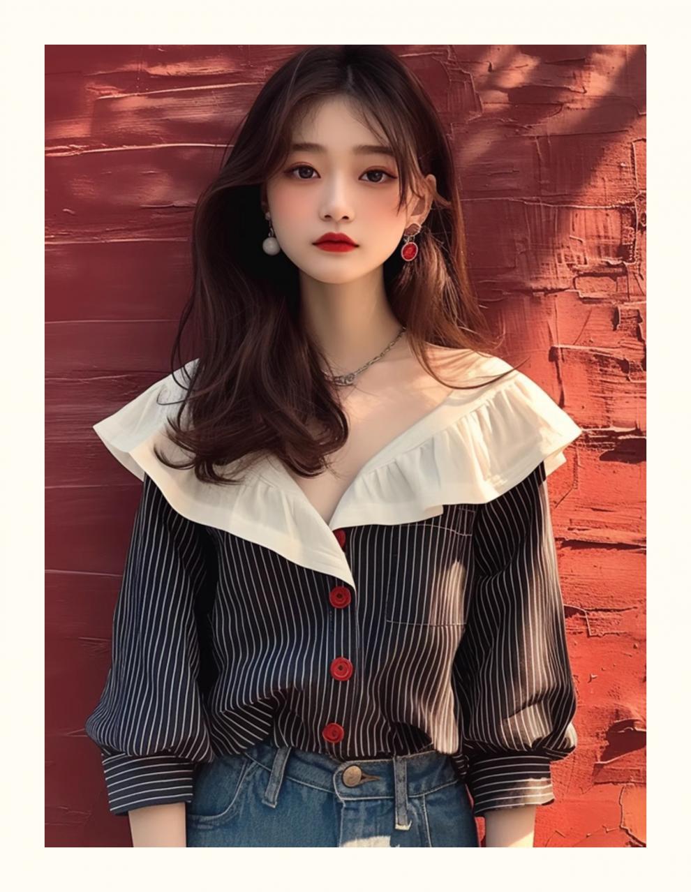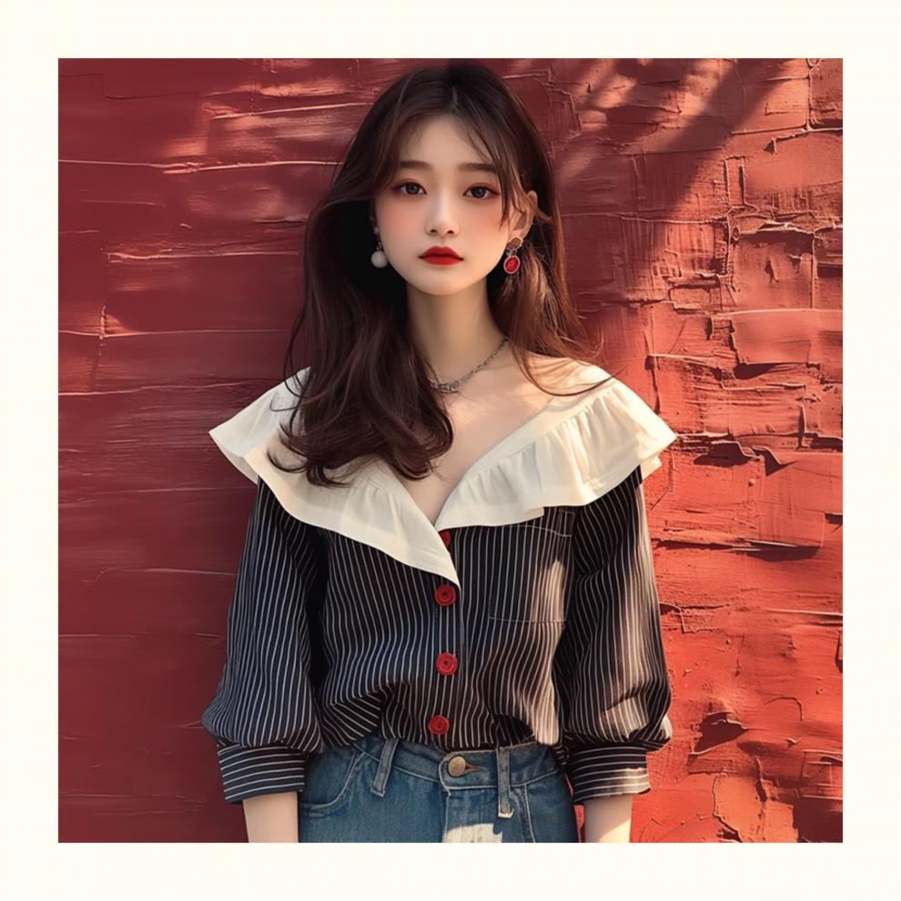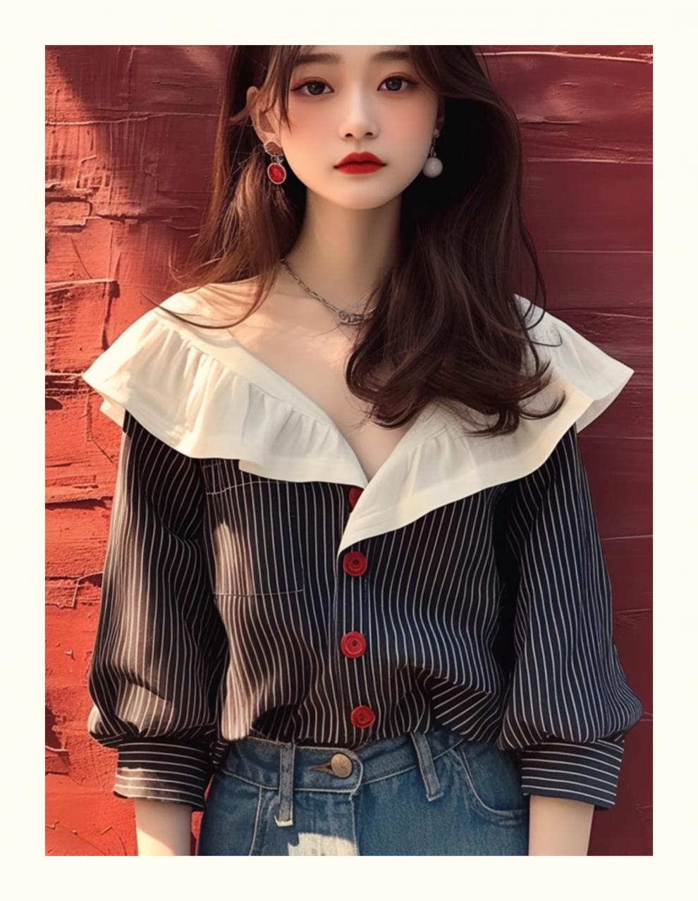 2025 Principios de Primavera Nuevo Diseño de Nicho Sentido Top Único Reductor de Edad Camisa con Costuras a Rayas Blancas y Negras