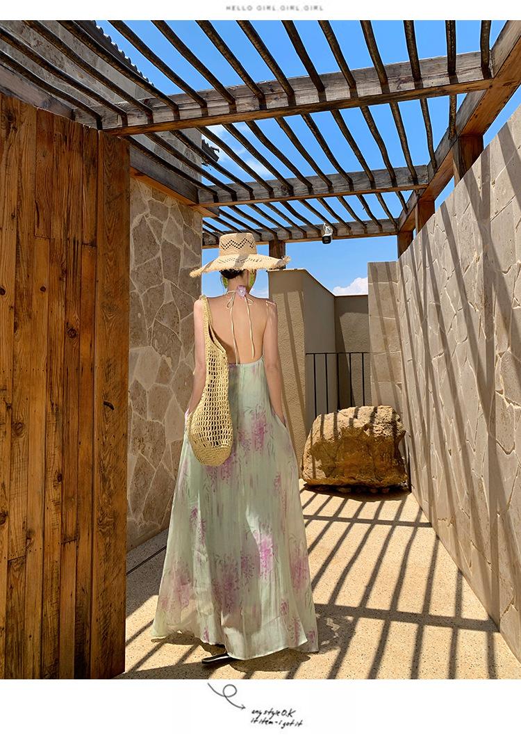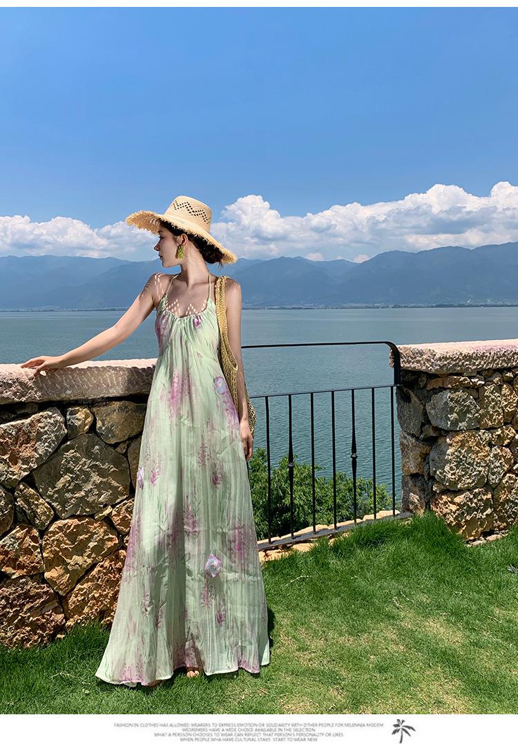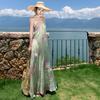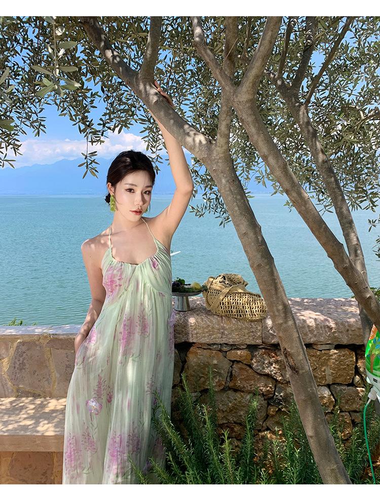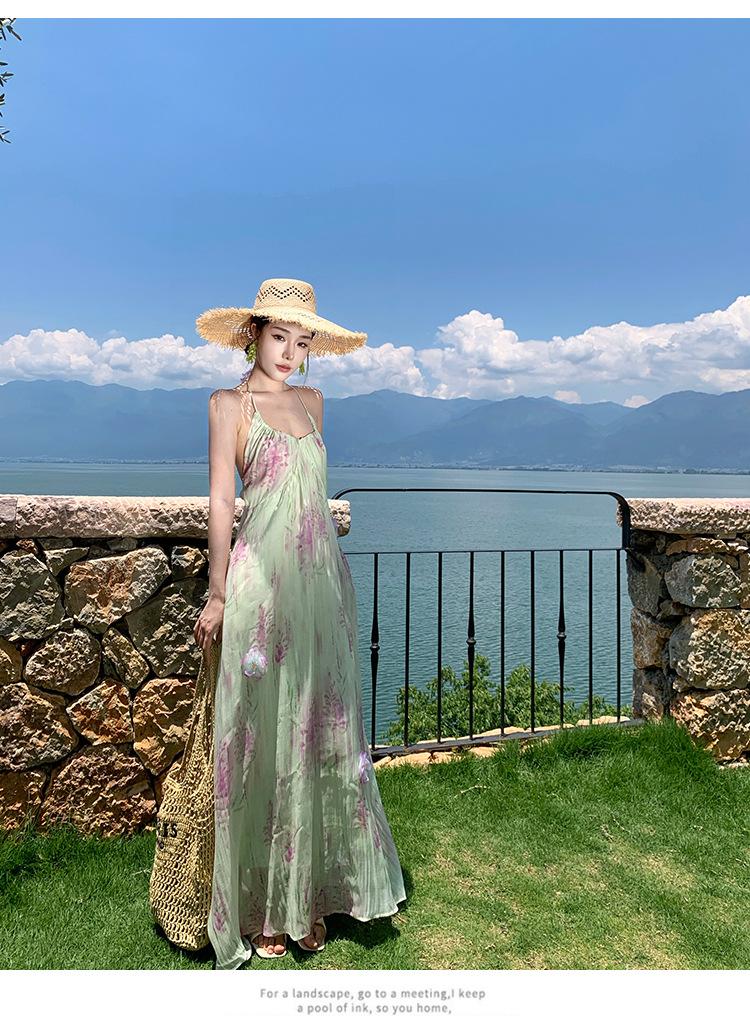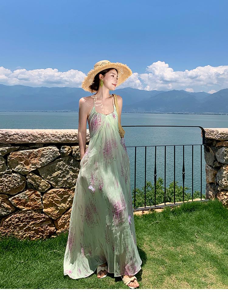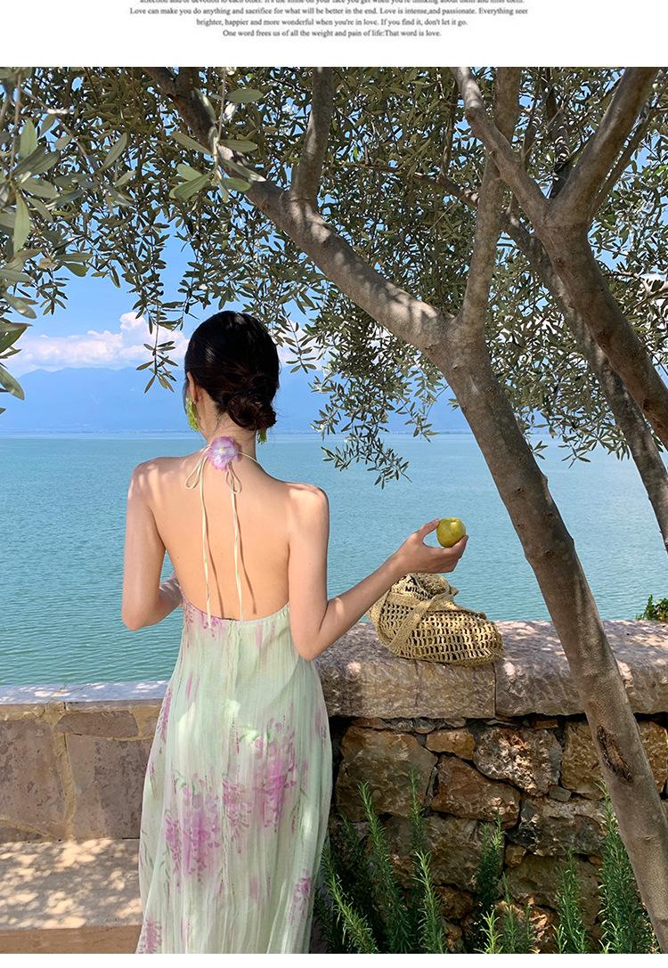 Vestido Largo de Playa Hermoso Estilo Francés Suave Espalda Descubierta Flor Tridimensional Verde y Morado Difuminado Tirantes Marítimo
