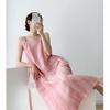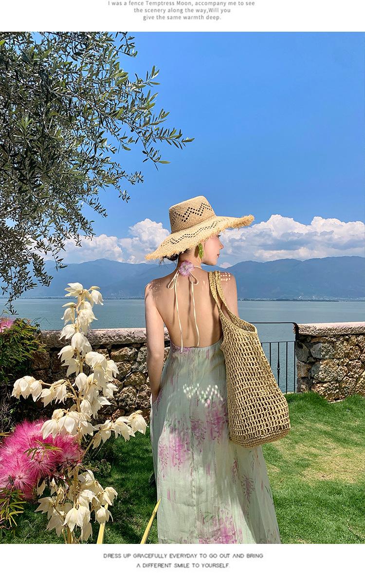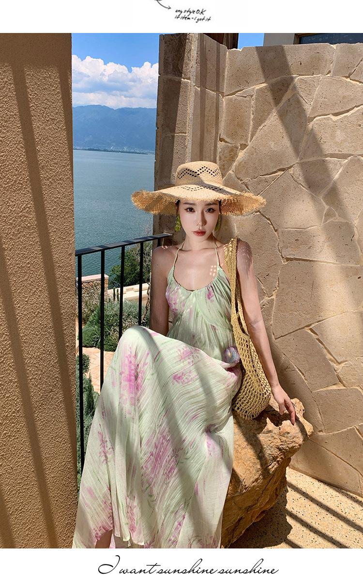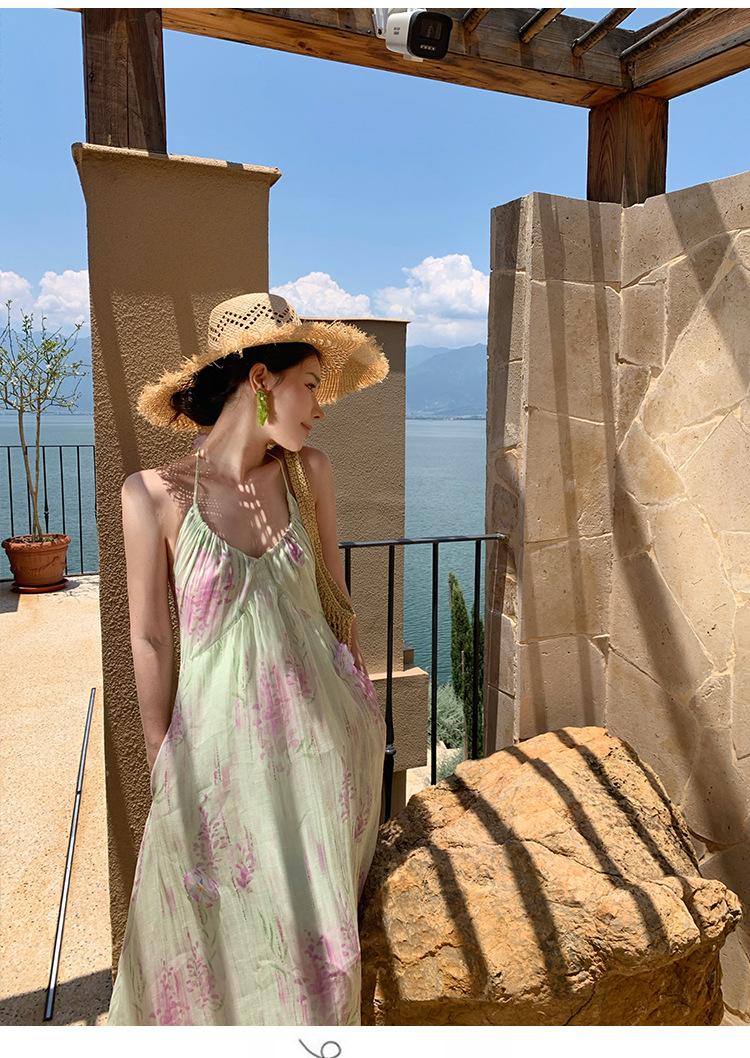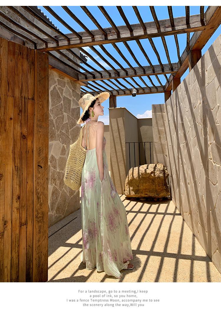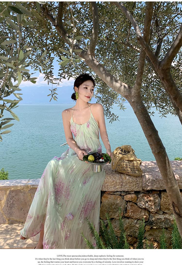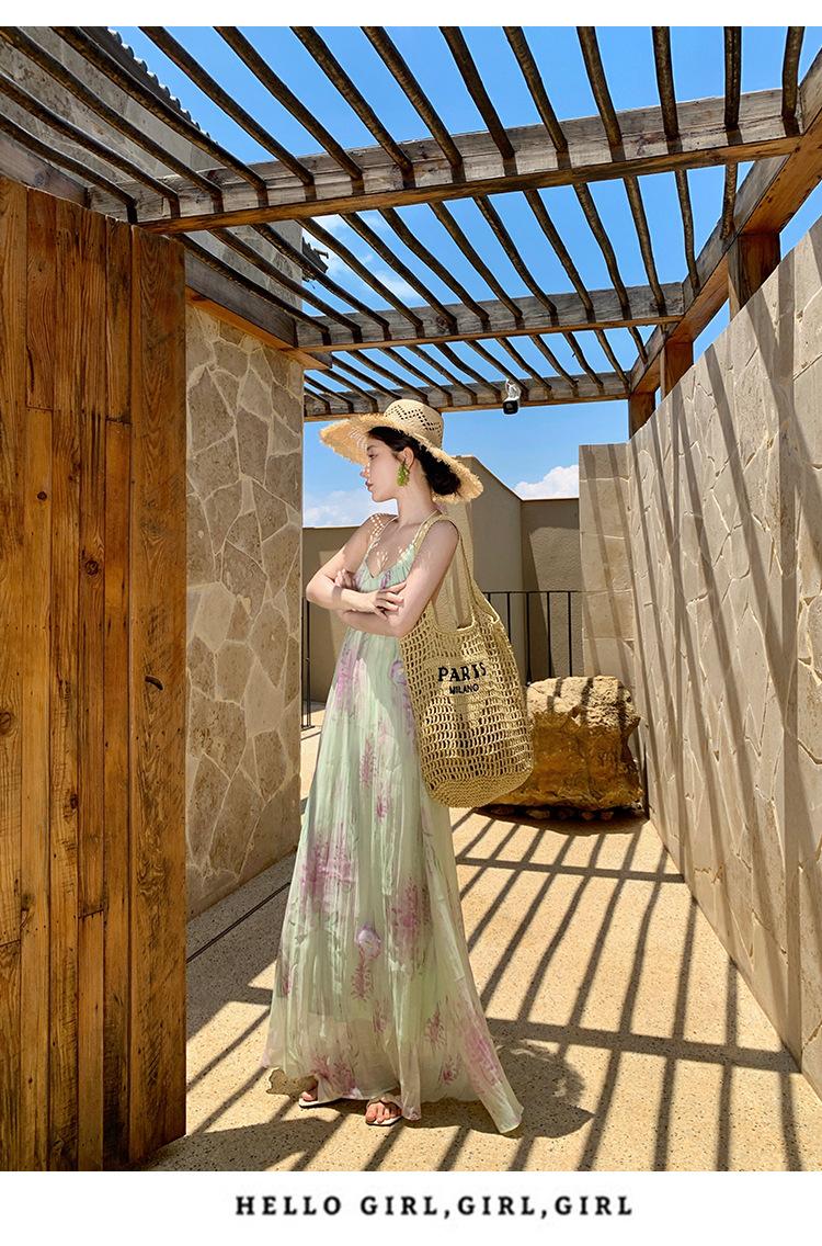 Vestido Largo de Playa Hermoso Estilo Francés Suave Espalda Descubierta Flor Tridimensional Verde y Morado Difuminado Tirantes Marítimo