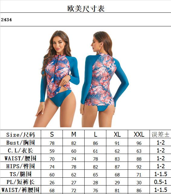 Ropa de baño para mujer de comercio exterior europeo y americano, ropa deportiva de carreras, nueva, manga larga, calzoncillos divididos, estampado, combinación de colores, para surf acuático