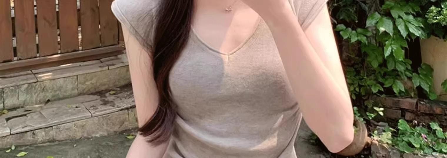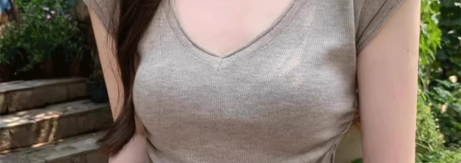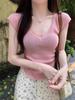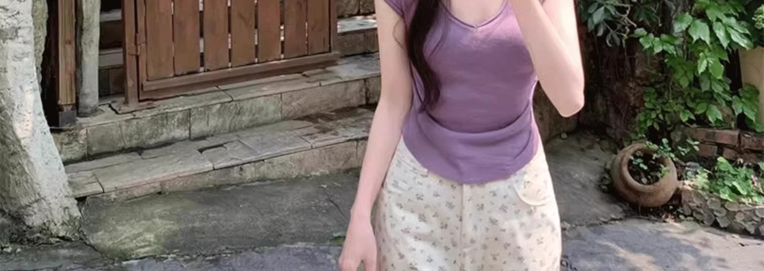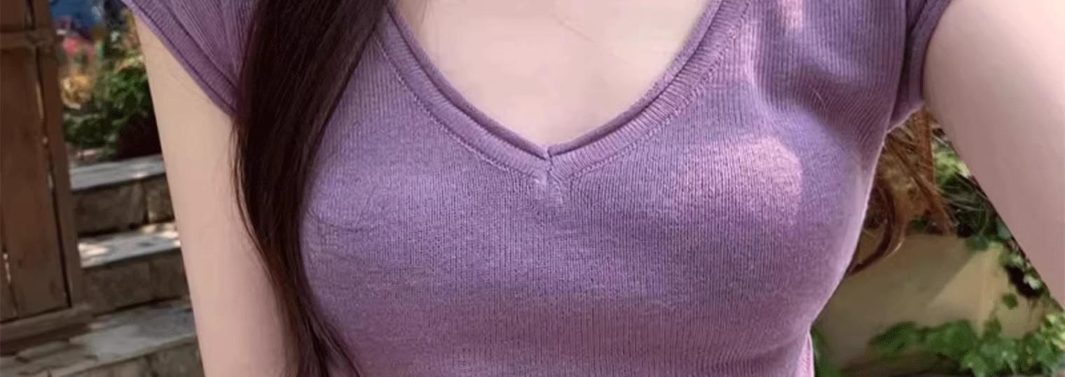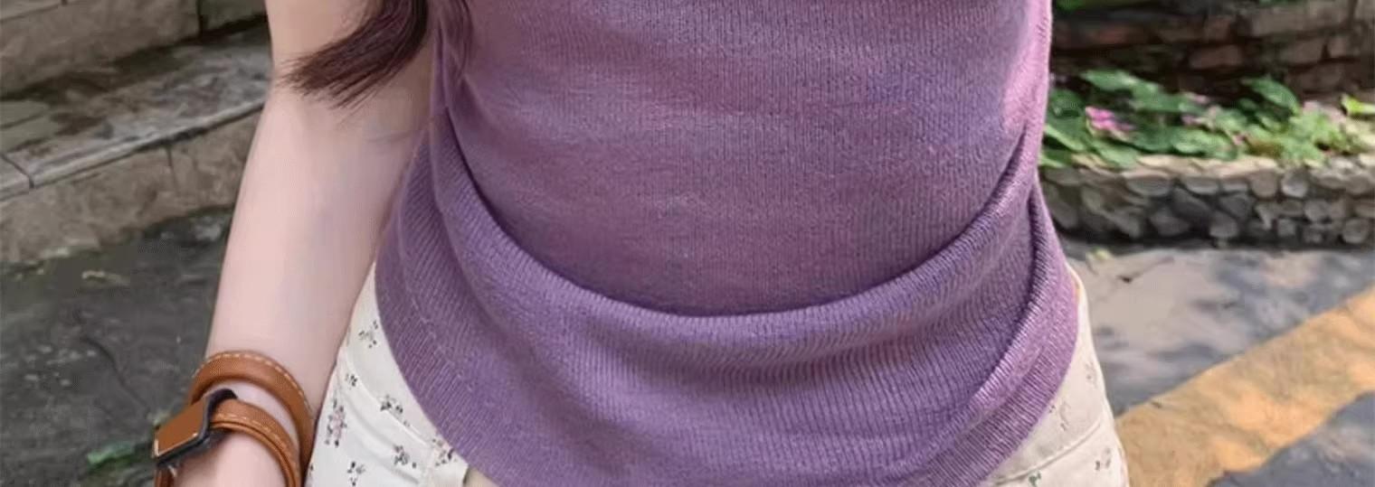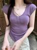 Camiseta de punto morada con cuello en V y hombros descubiertos para mujer, de verano, fina, con cintura irregular y mangas cortas.
