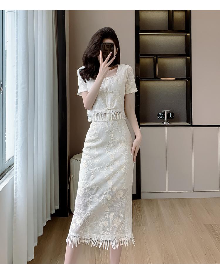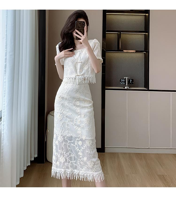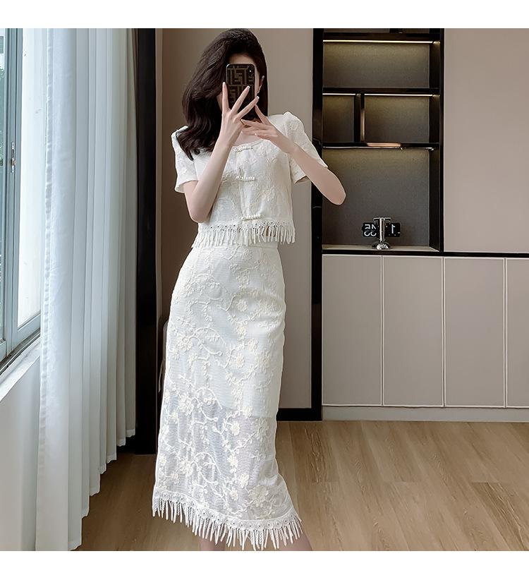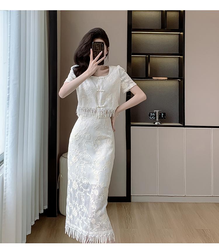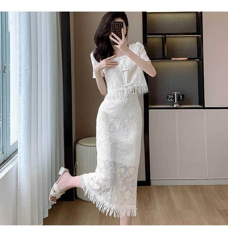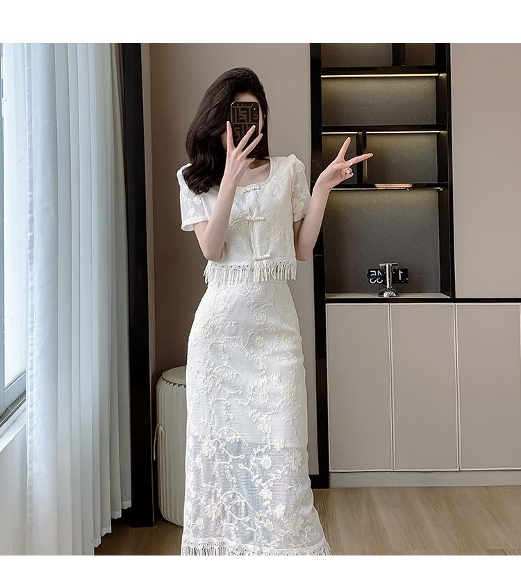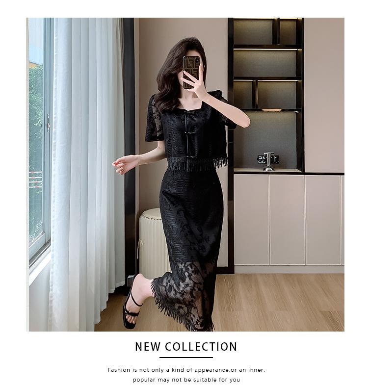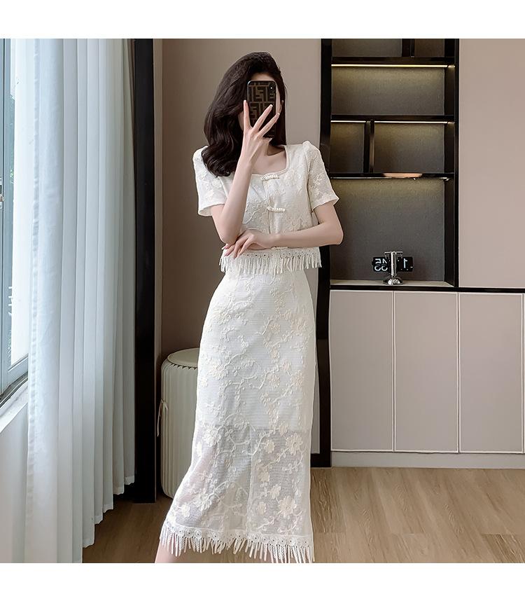 Verano 2024 Nuevo Nuevo Estilo Chino Botón Cuello Cuadrado Borla Bordada Largo Medio Traje de Dos Piezas Vestido Estilo Nacional para Mujer