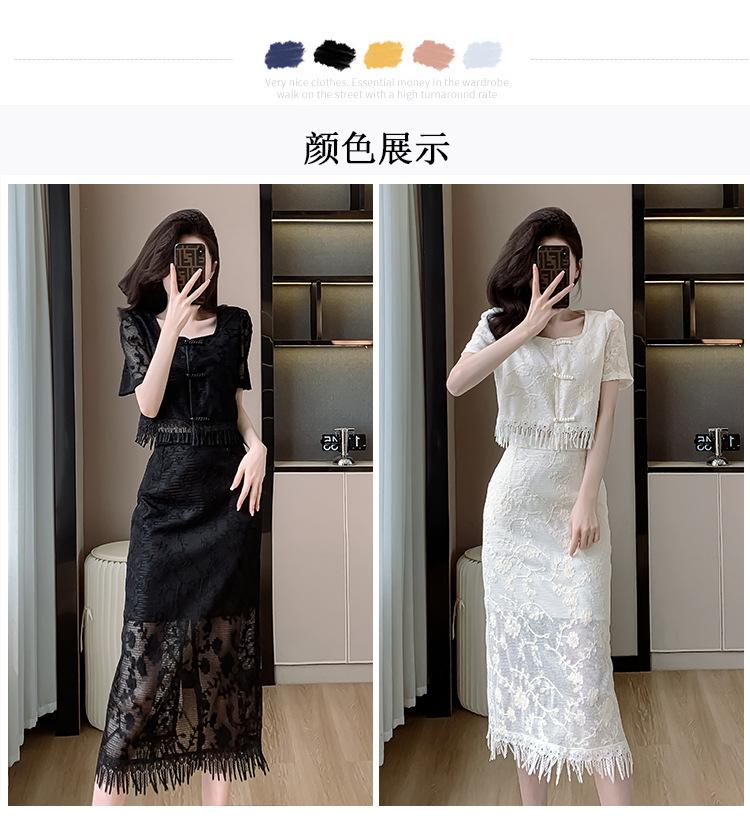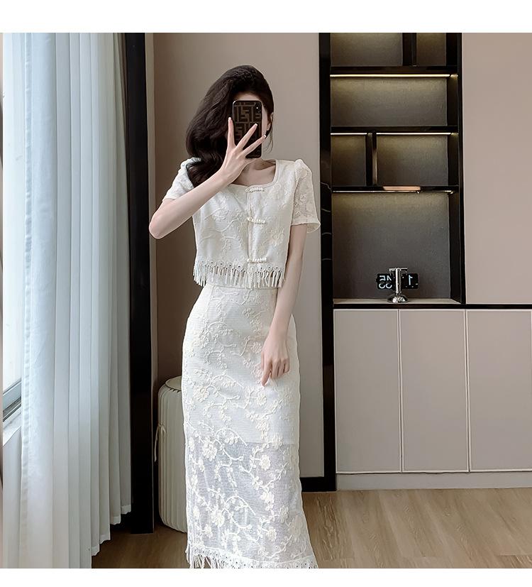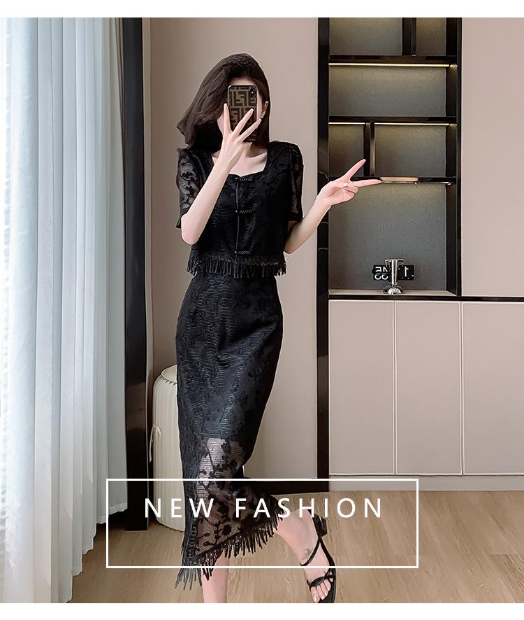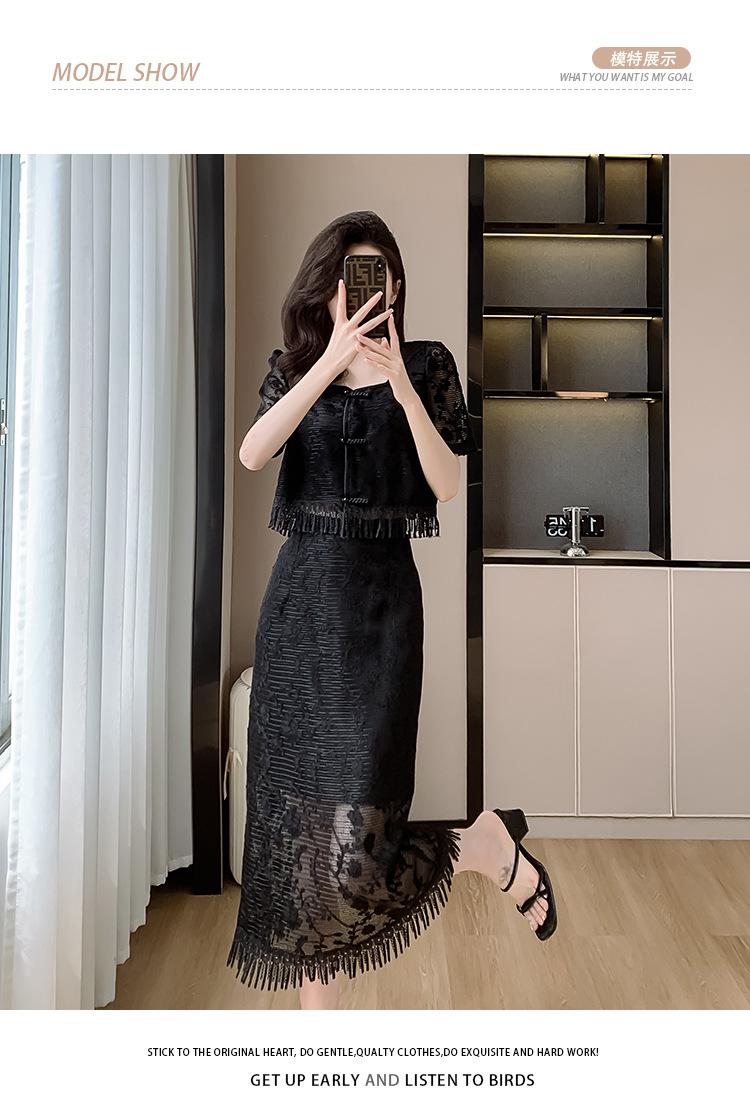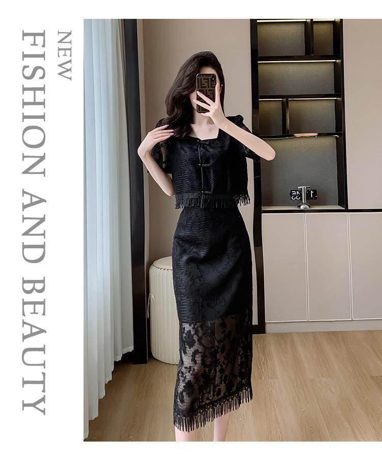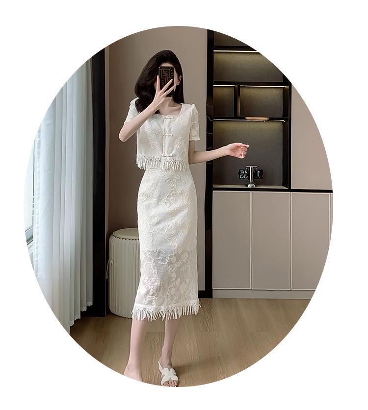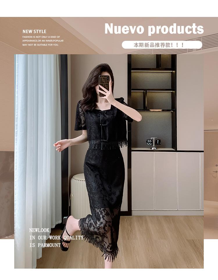 Verano 2024 Nuevo Nuevo Estilo Chino Botón Cuello Cuadrado Borla Bordada Largo Medio Traje de Dos Piezas Vestido Estilo Nacional para Mujer