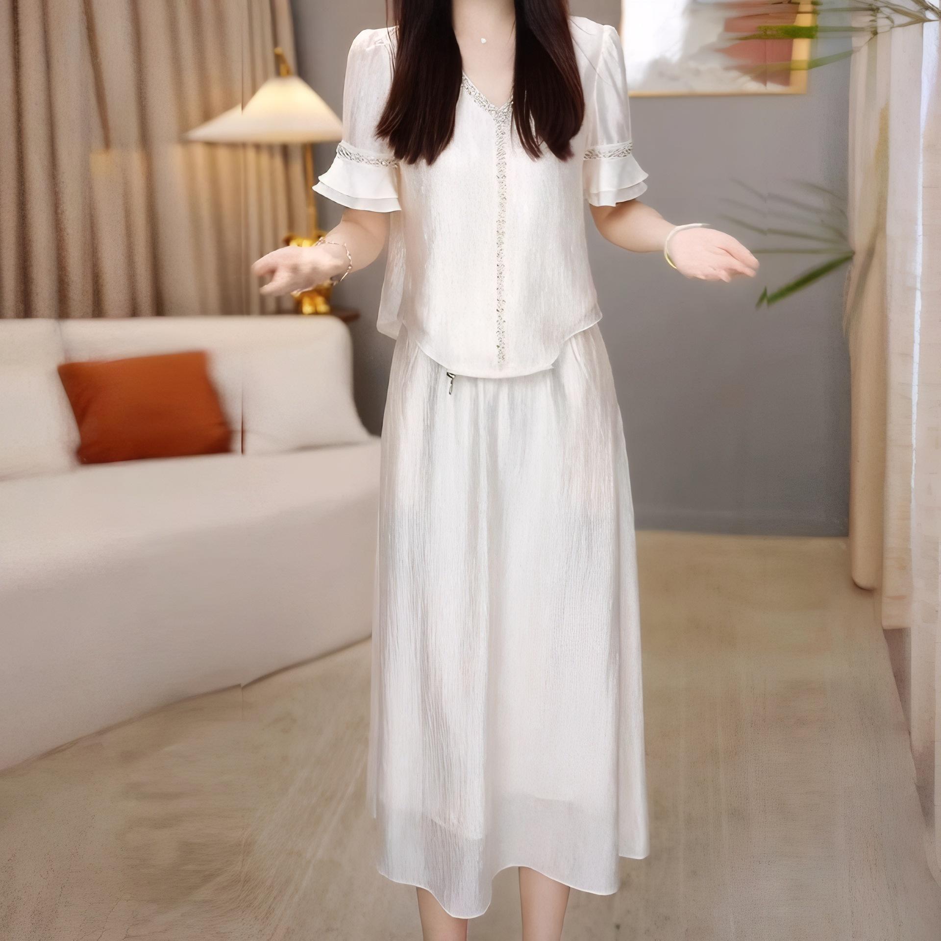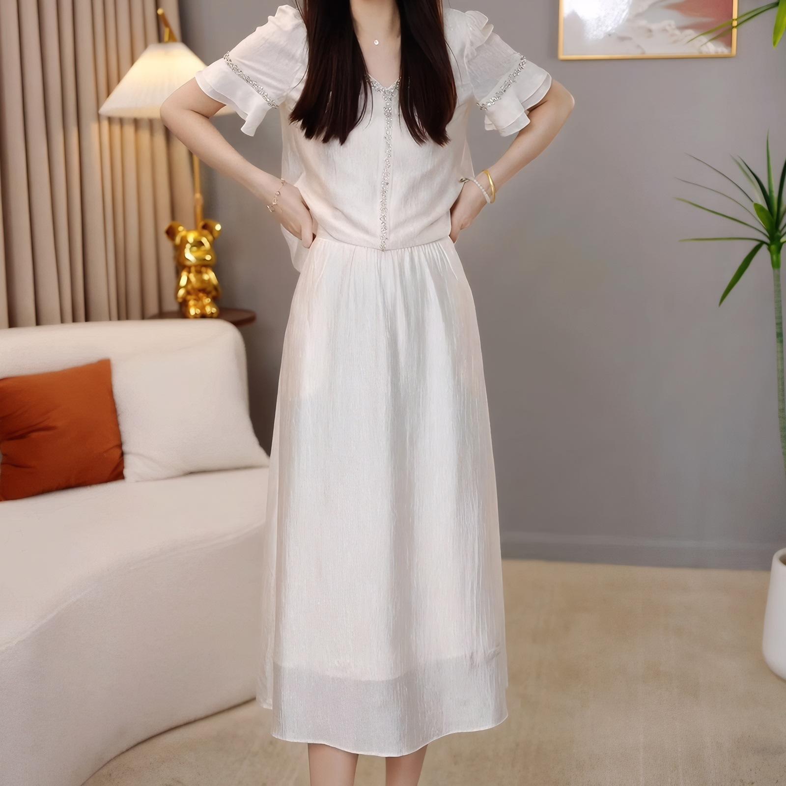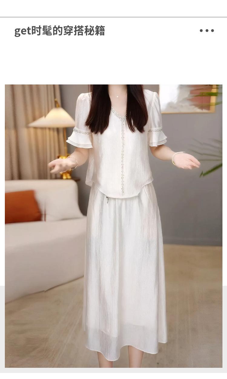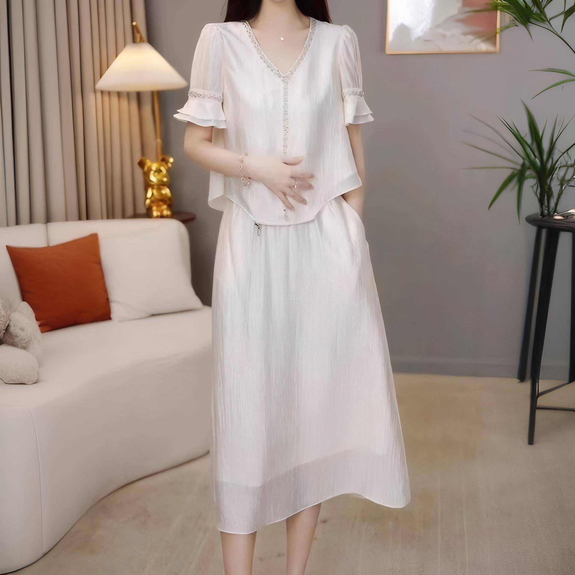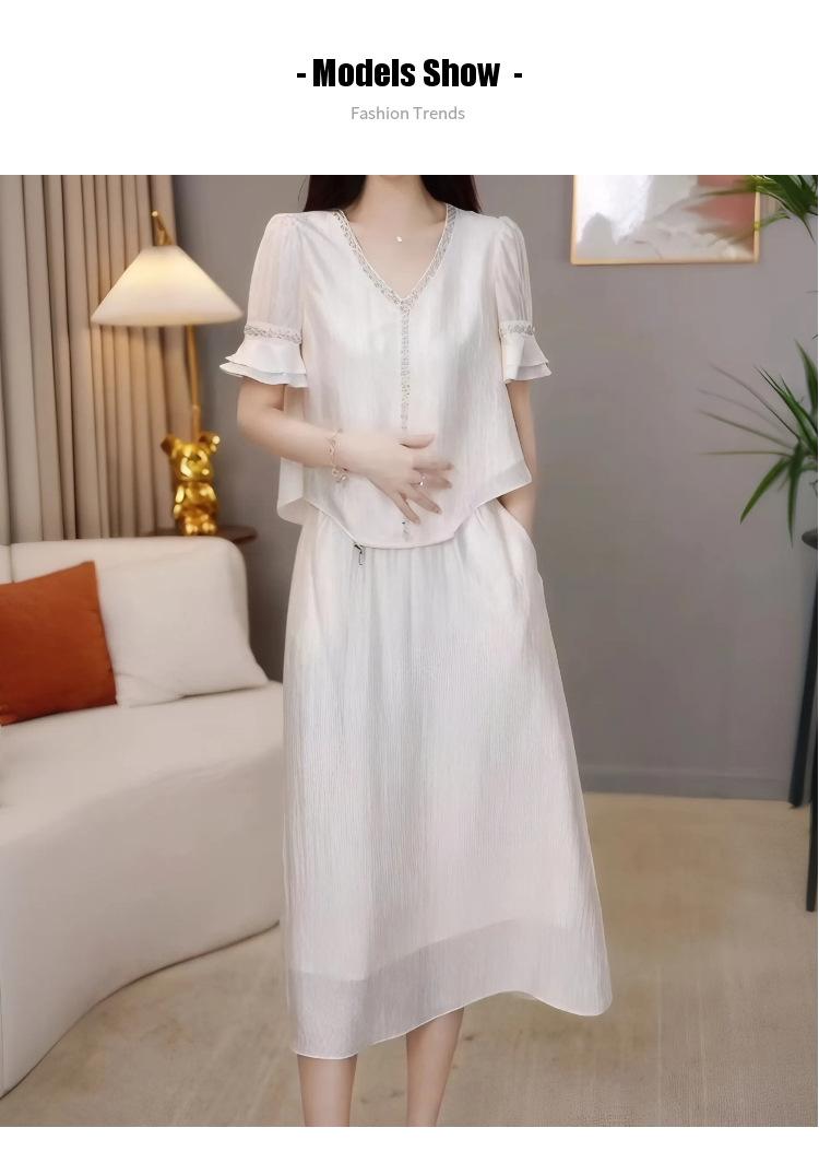 Traje Versátil Elegante y a la Moda para Mujer 2025 Verano Nuevo Top de Manga Corta con Volantes Reductor de Edad Falda Línea A Conjunto de Dos Piezas