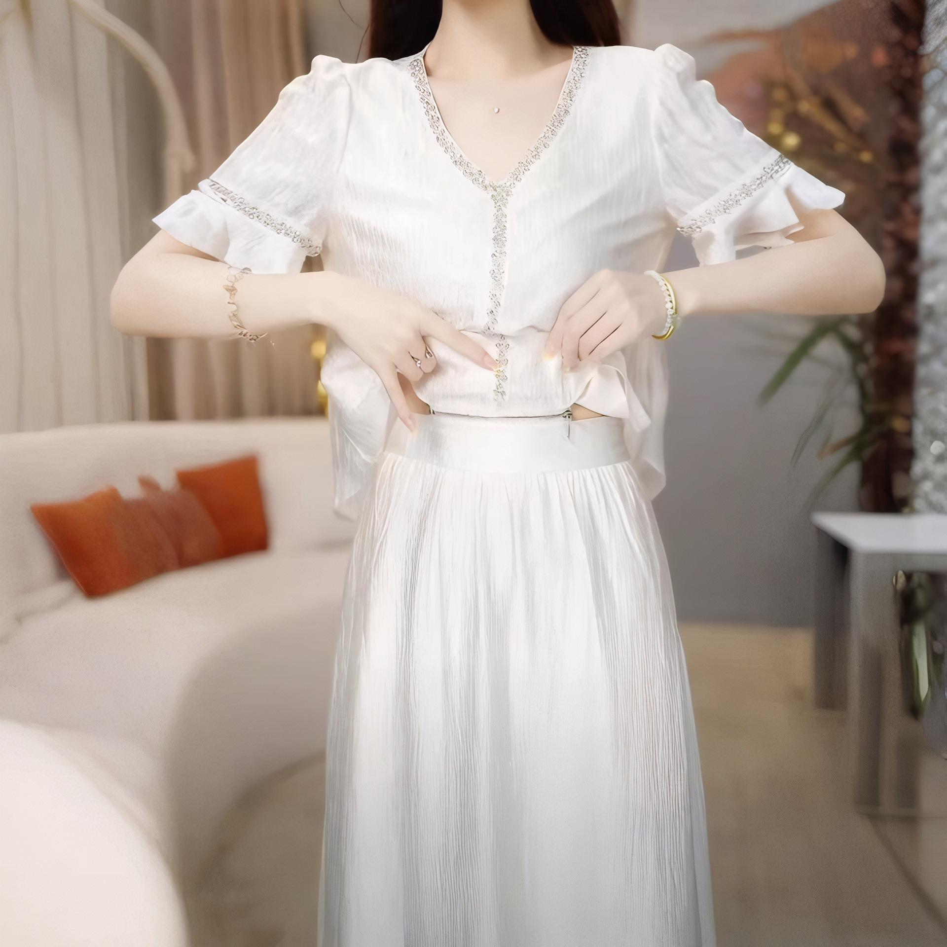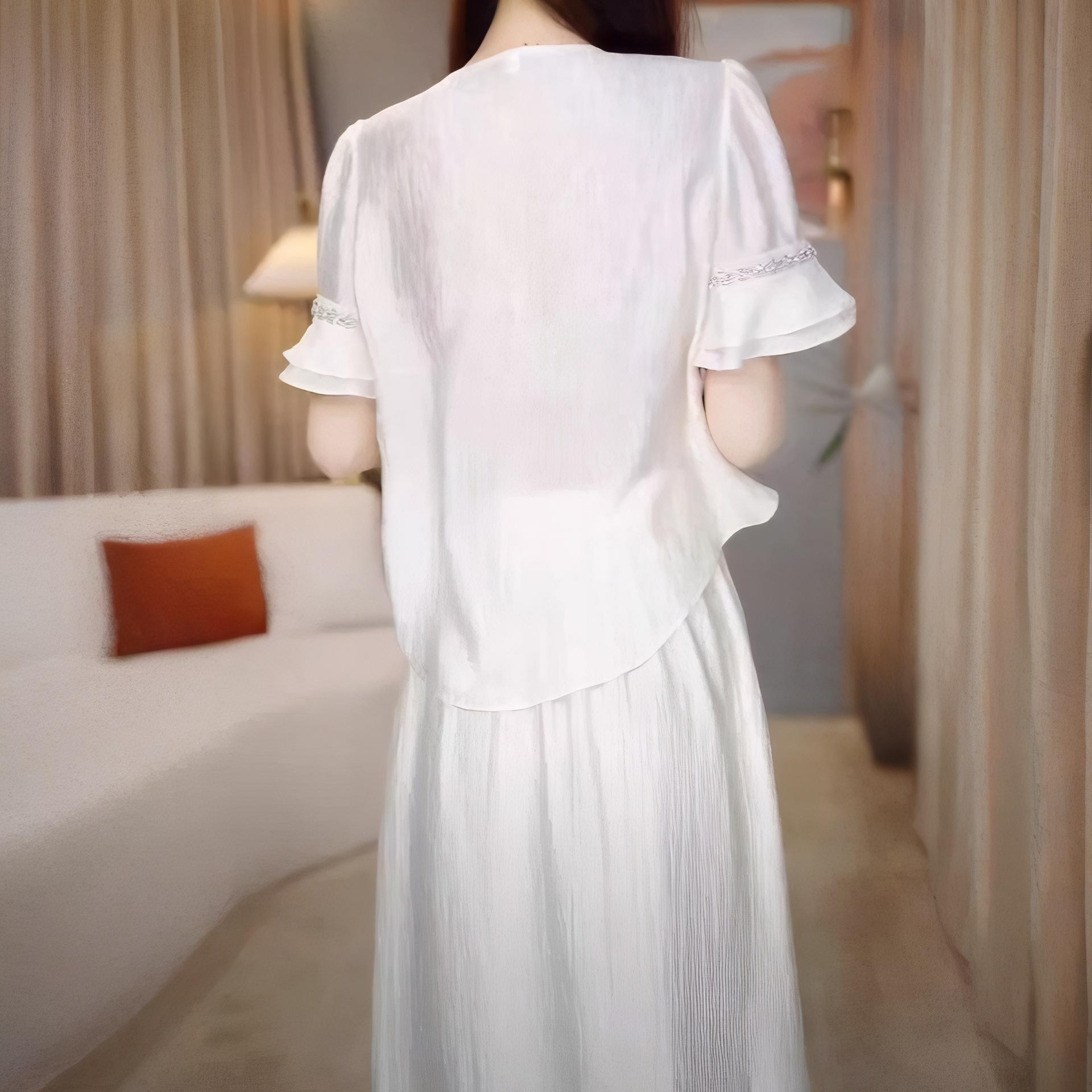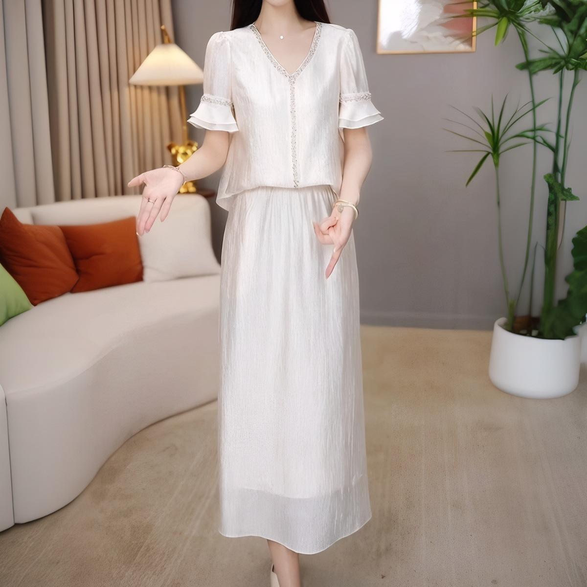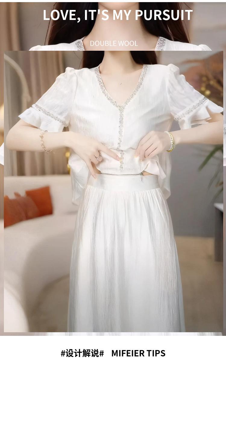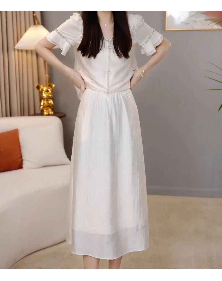 Traje Versátil Elegante y a la Moda para Mujer 2025 Verano Nuevo Top de Manga Corta con Volantes Reductor de Edad Falda Línea A Conjunto de Dos Piezas