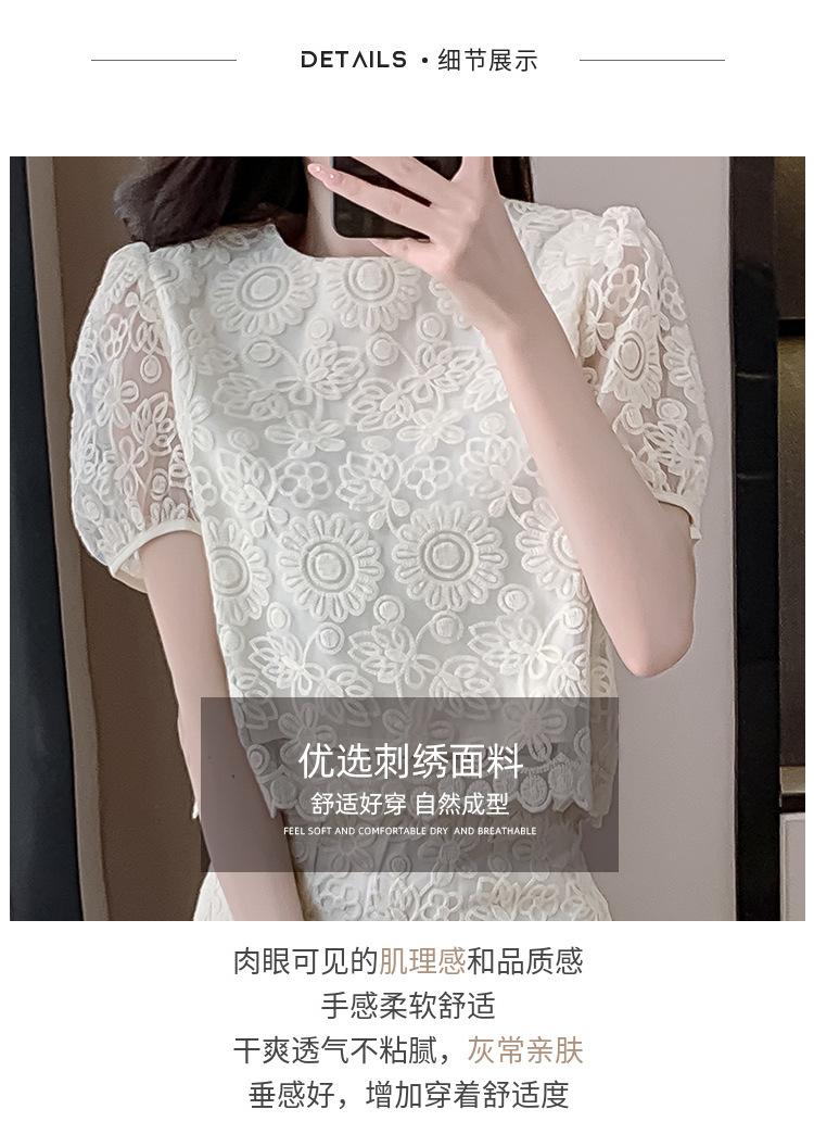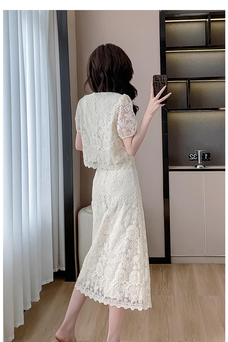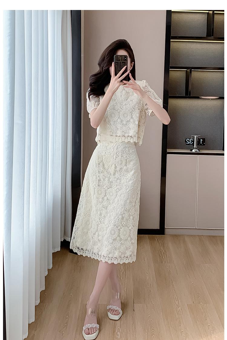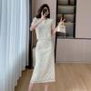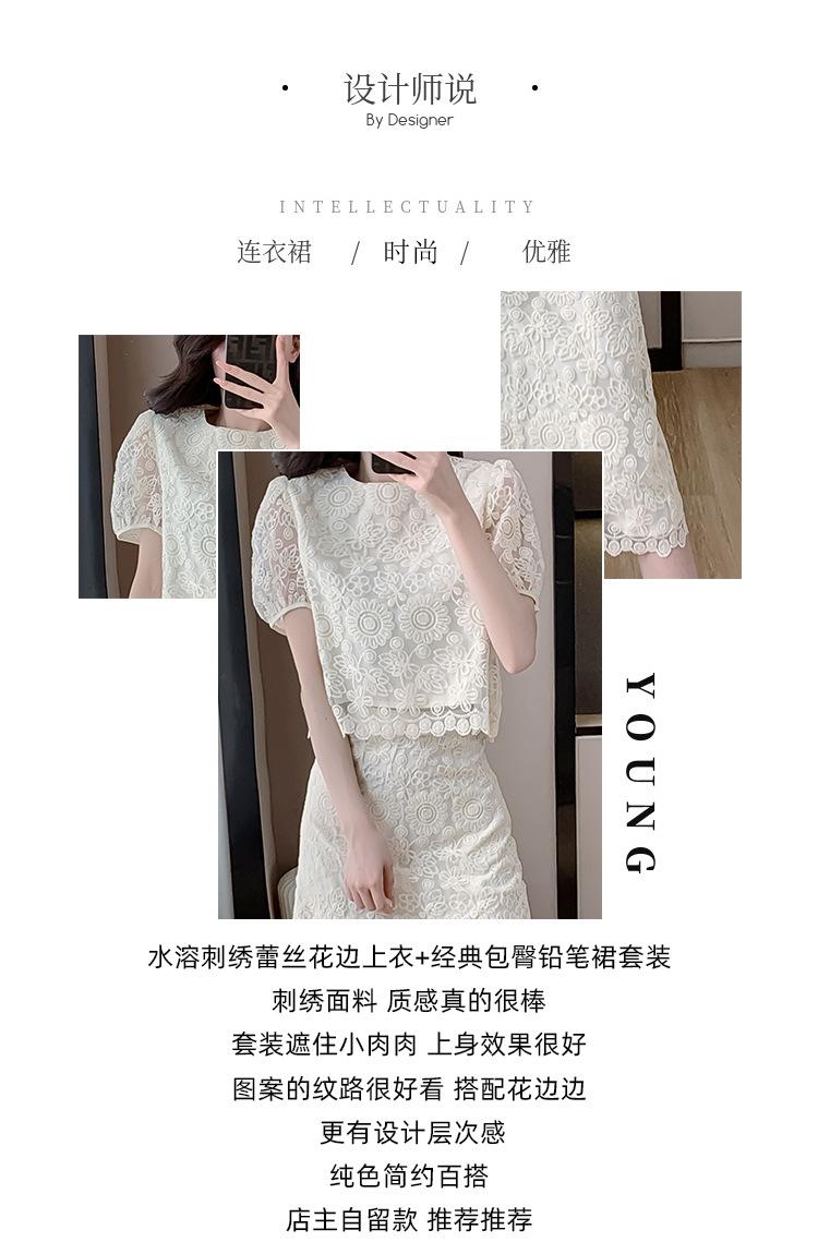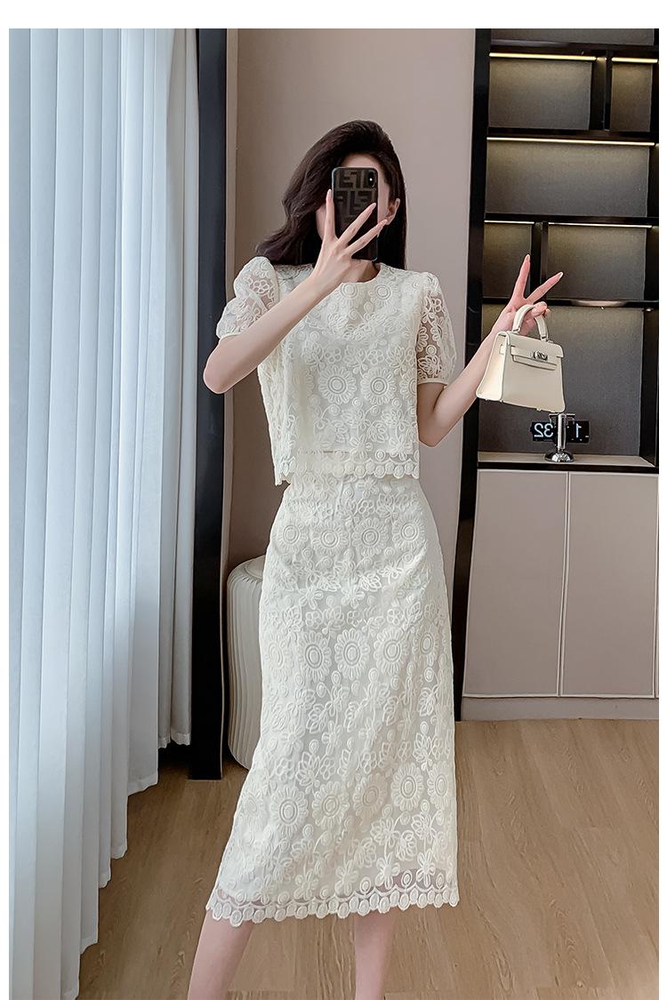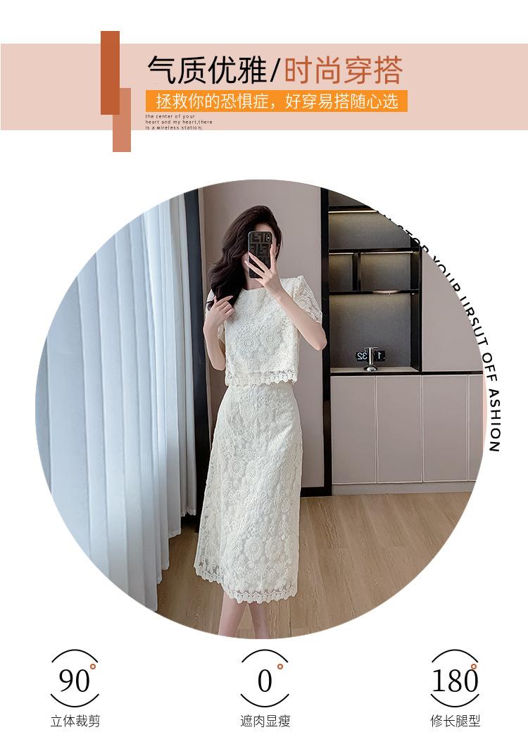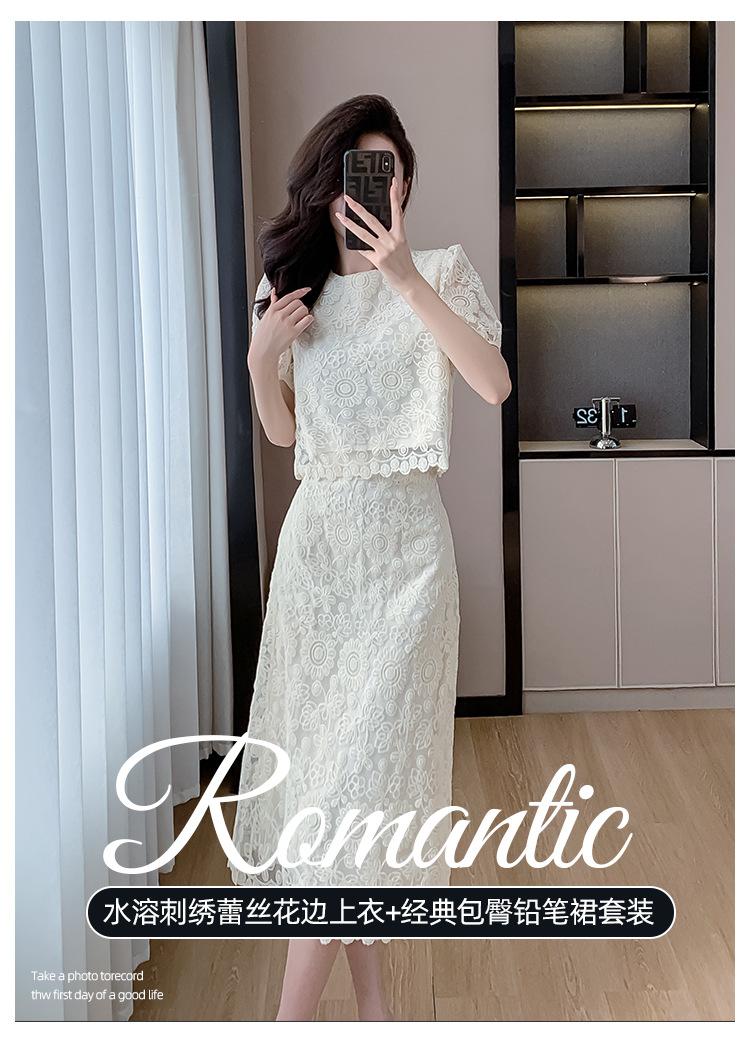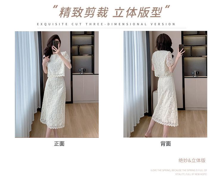 Top de Manga Corta Falda Midi Traje de Dos Piezas Verano Encaje de Alta Gama Suave Estilo Chanel Verano para Mujer