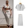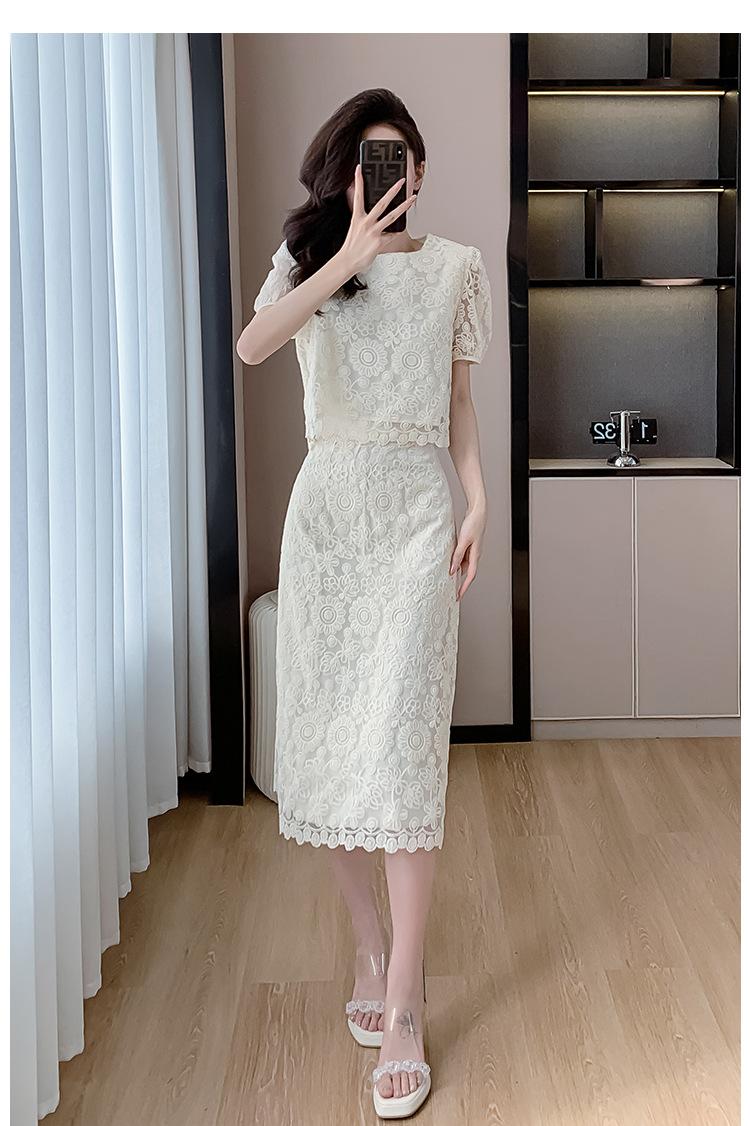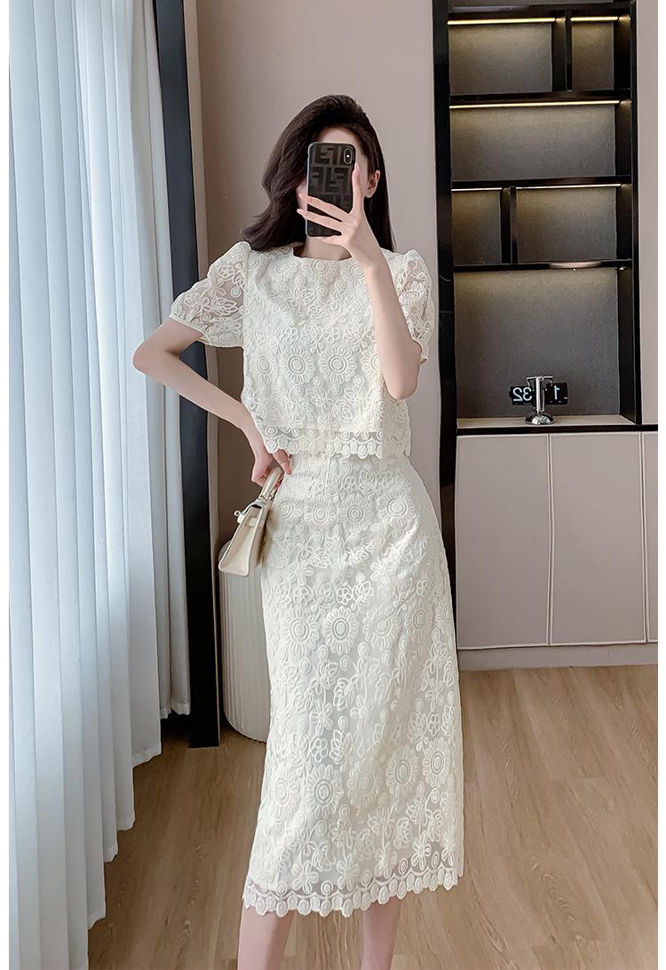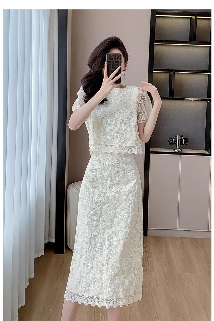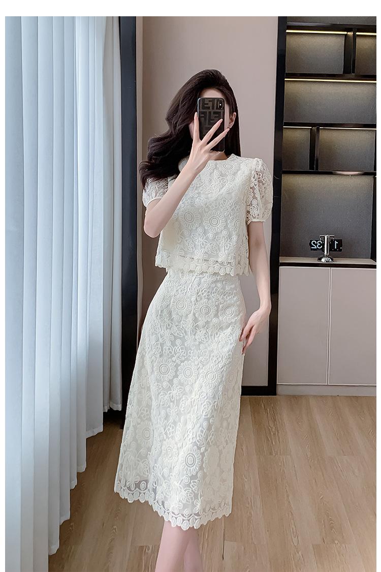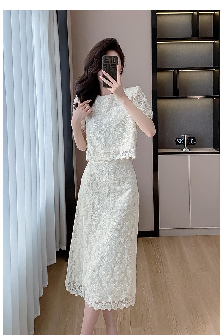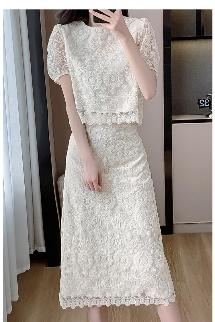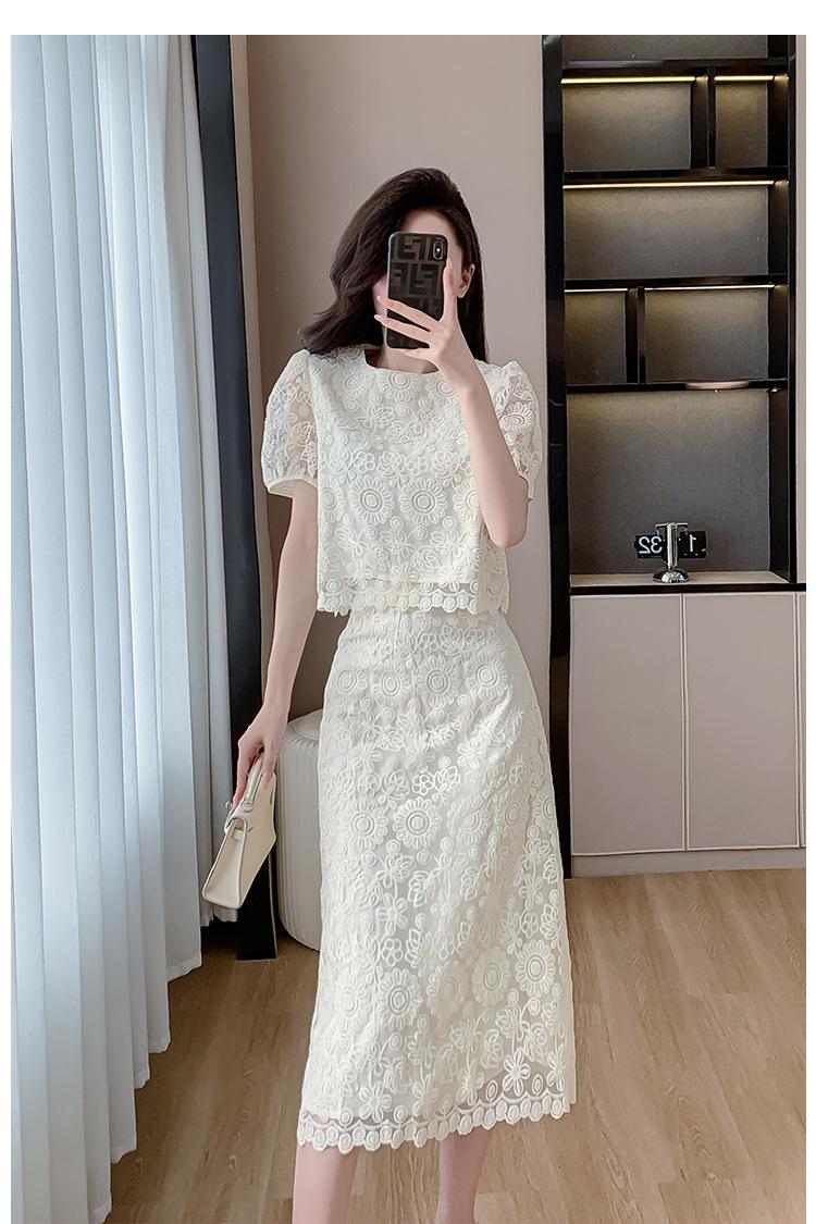 Top de Manga Corta Falda Midi Traje de Dos Piezas Verano Encaje de Alta Gama Suave Estilo Chanel Verano para Mujer