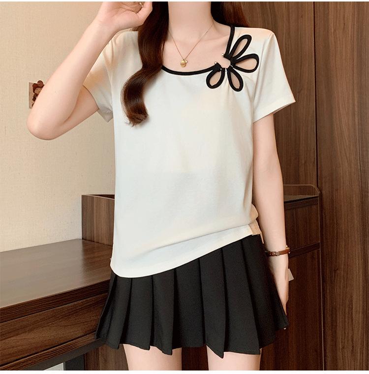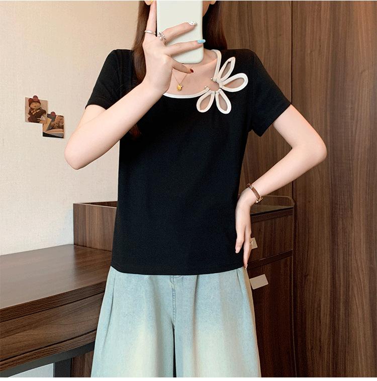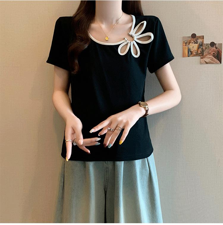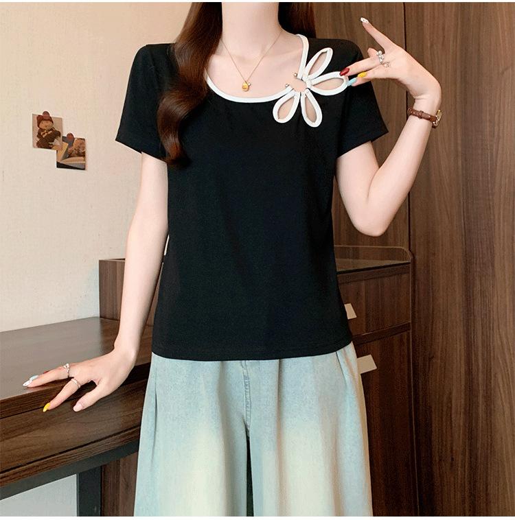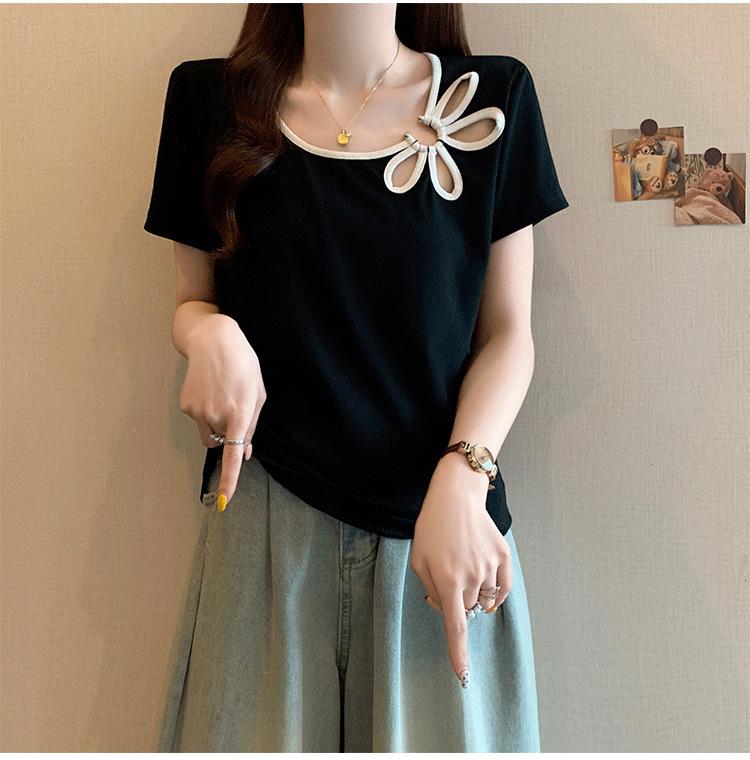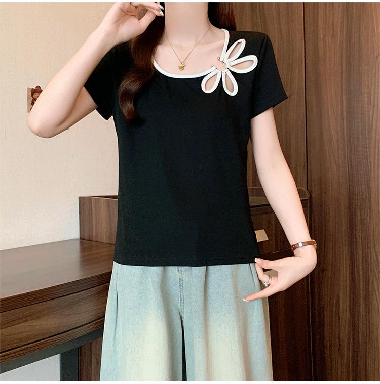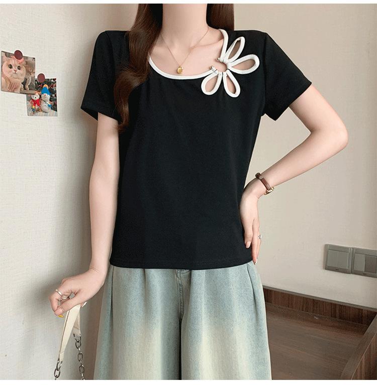 2025 Verano Nuevo Talla Grande Diseño de Moda para Mujer Flor Hueco Suelto Adelgazante Versátil Camiseta Top Hombro Derecho
