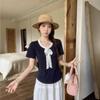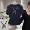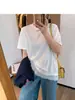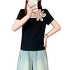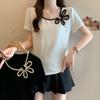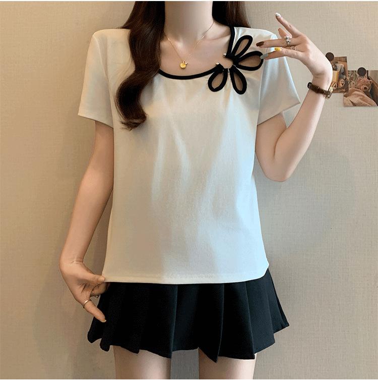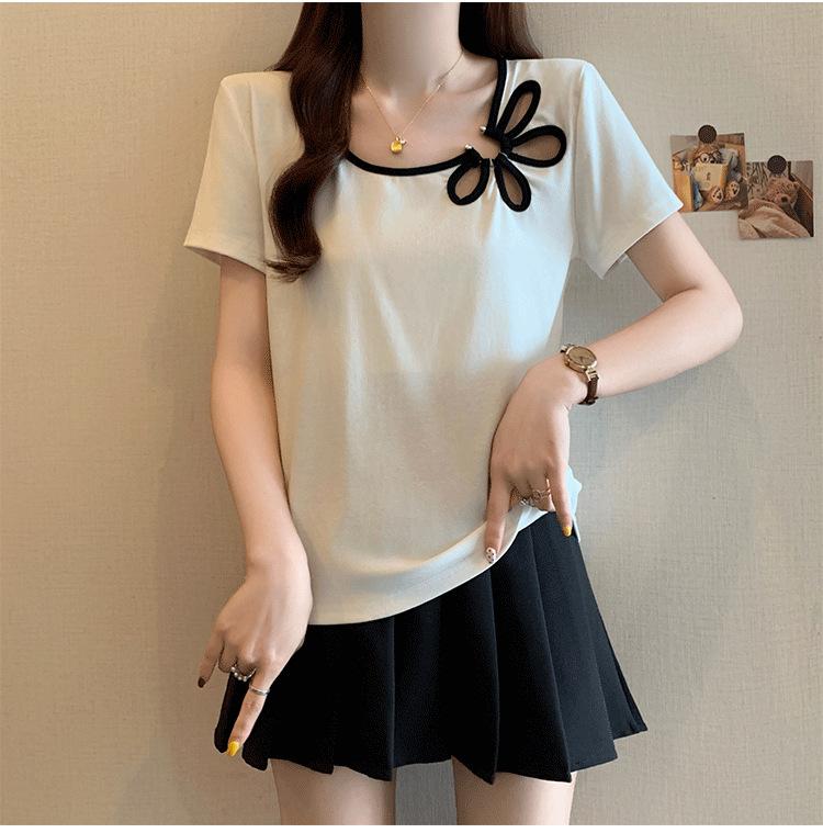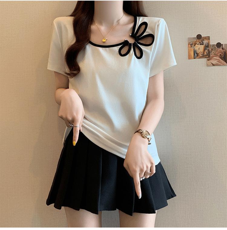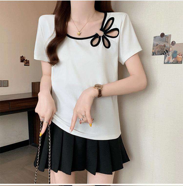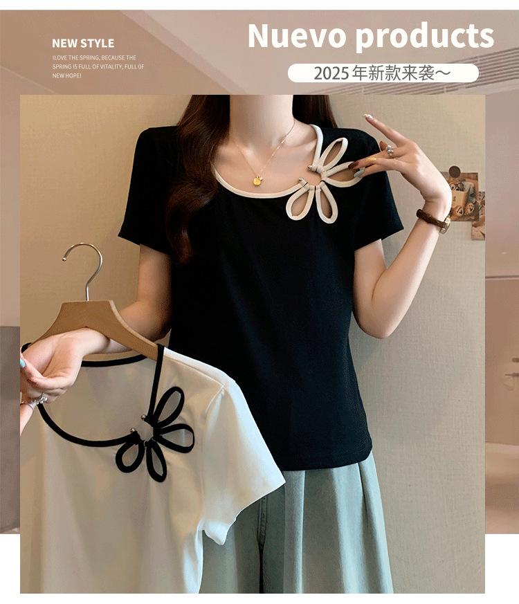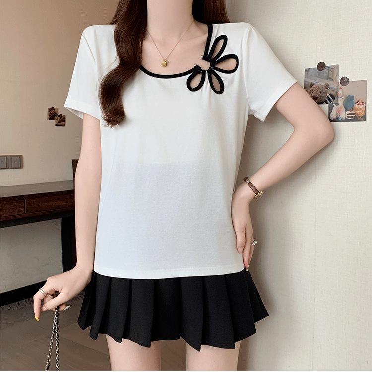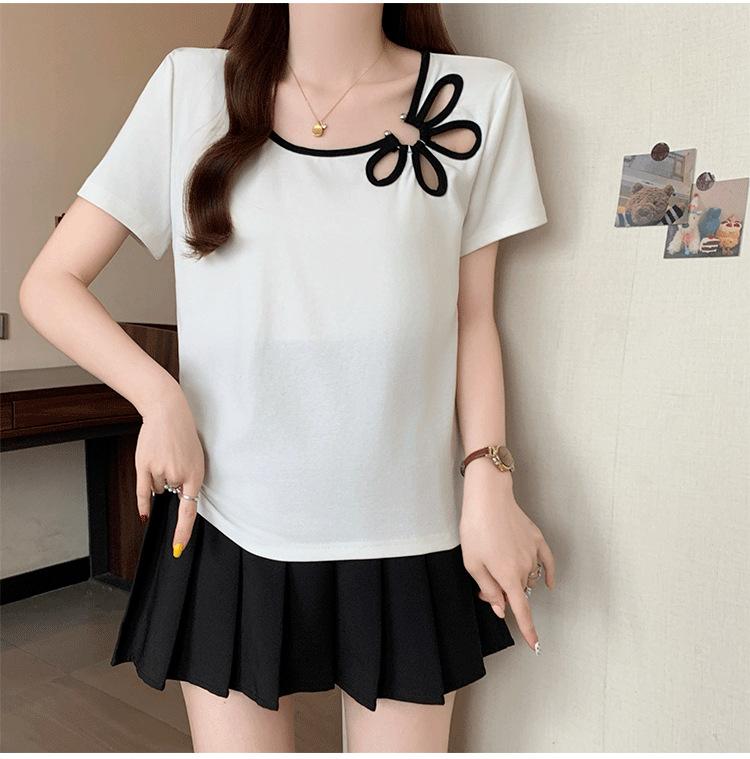 2025 Verano Nuevo Talla Grande Diseño de Moda para Mujer Flor Hueco Suelto Adelgazante Versátil Camiseta Top Hombro Derecho